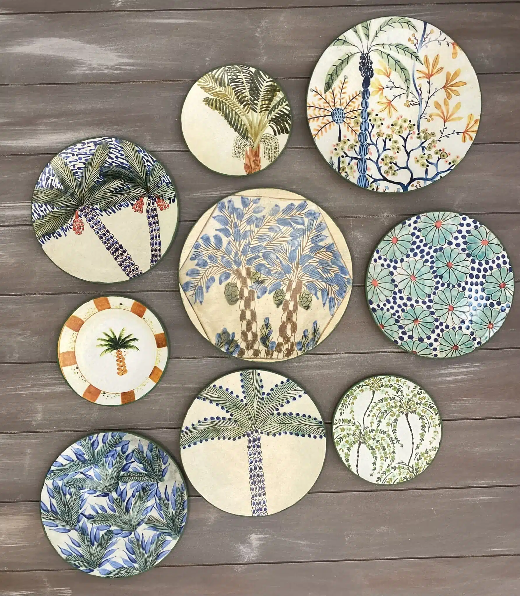 Decoupaged wall plates with palm trees theme