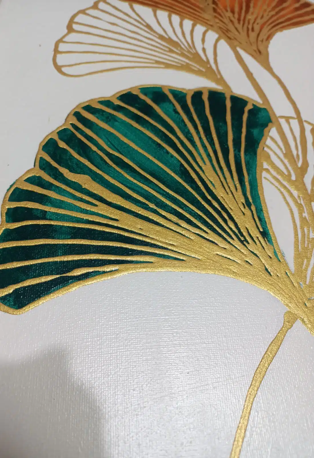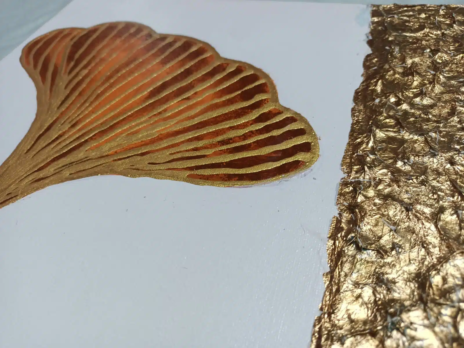 3D abstract Papyrus flower drawn by golden paste and golden leaf found in the edges of the 2 small canvas.