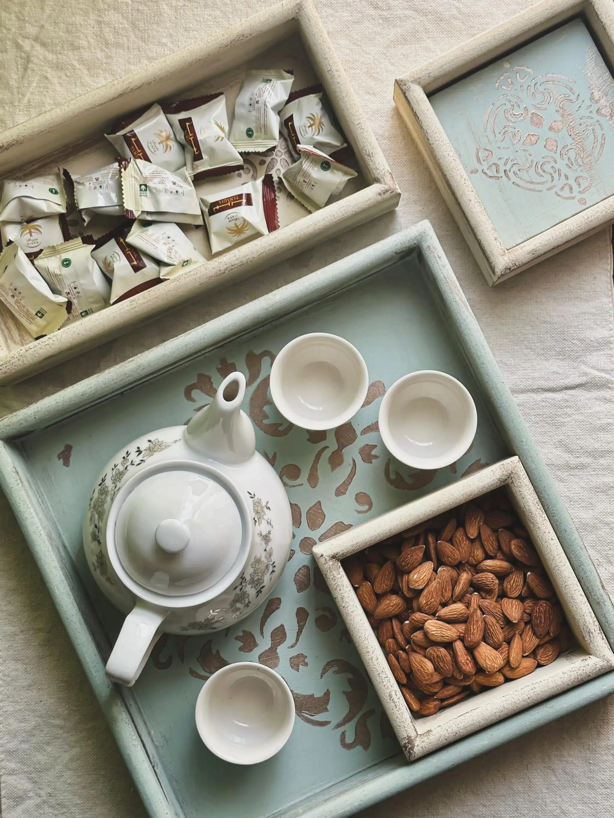 Add a cozy, vintage touch to your table with this beautiful handmade tray set. Painted in sage green and beige with oxide patterns