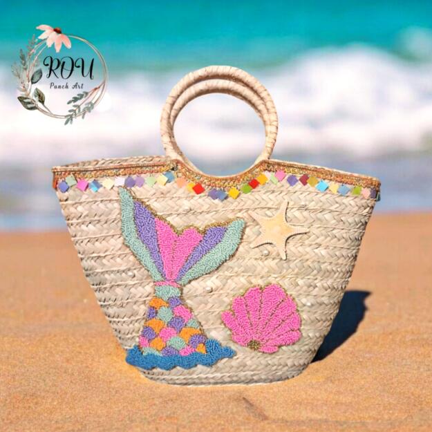 Handcrafted straw tote inspired by seaside magic, featuring punch-needle mermaid details, seashell accents, and playful colorful embellishments. A statement beach bag designed to carry summer essentials with charm and elegance