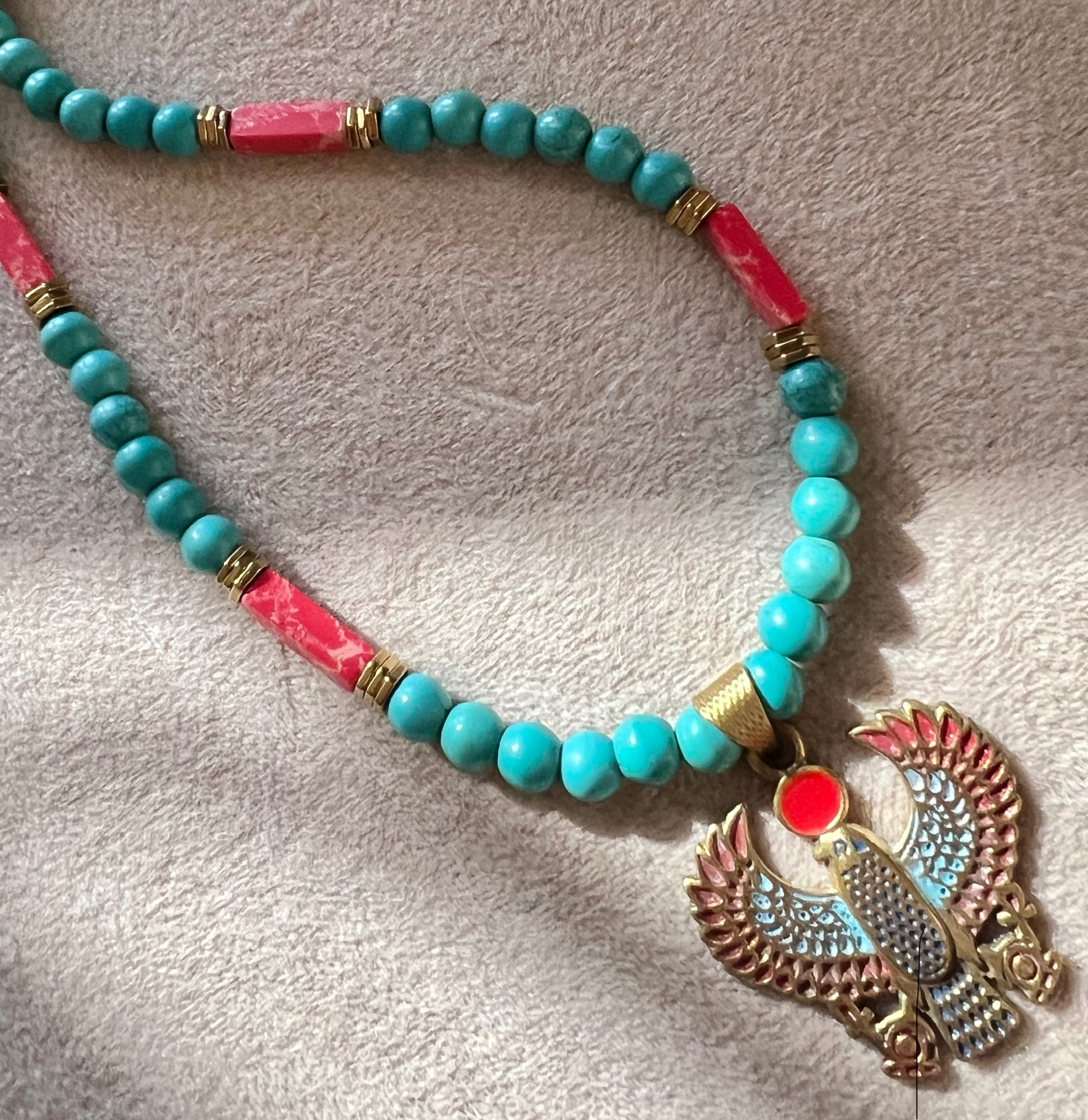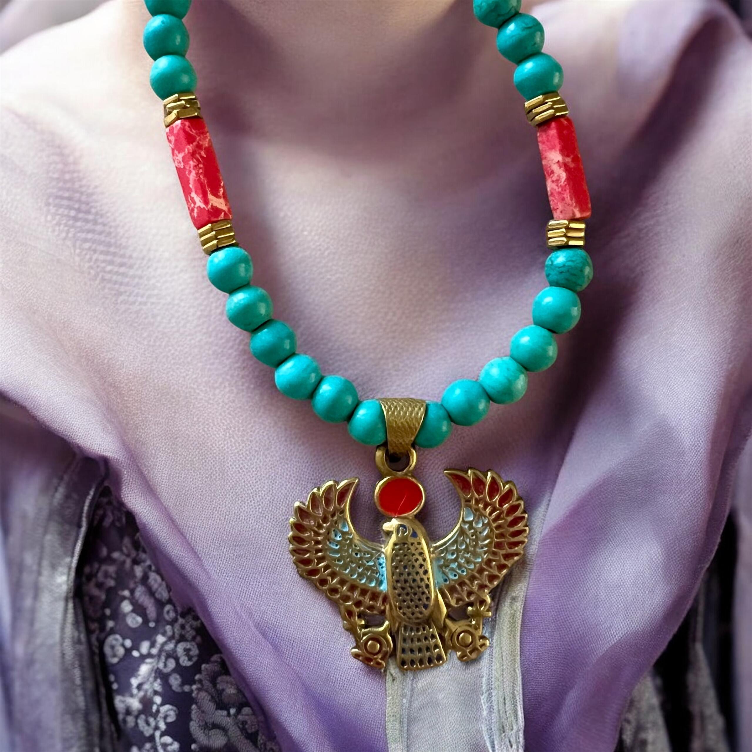 Brass pharaonic pendant in turquoise stones & red jasper & hematite.