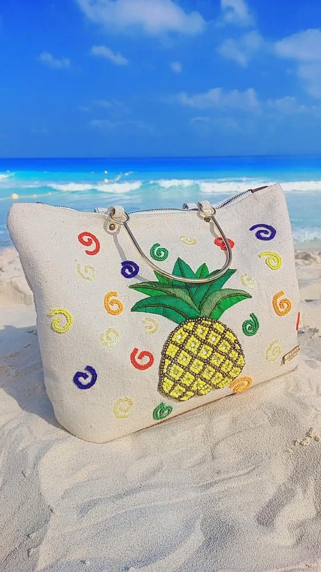 Bead embroidery tote bag with big zip and golden handel🍍🍍