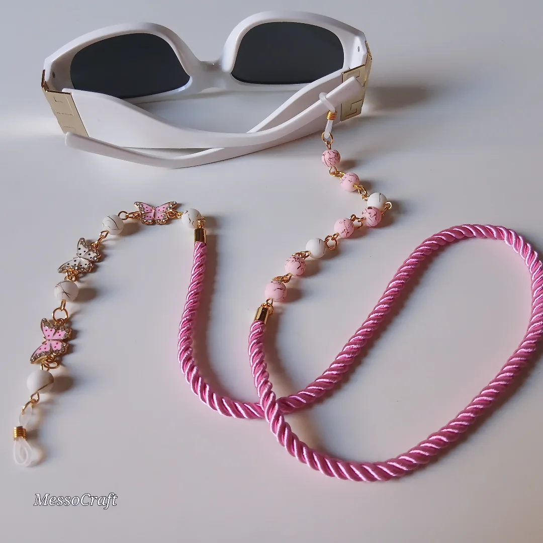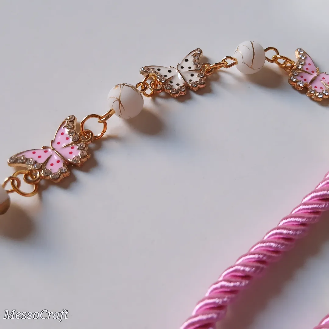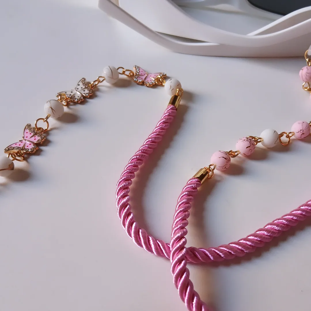 A glasses chain made of pink-goldish and white-goldish beads and 3 butterflies pendants and a pink cordon cord