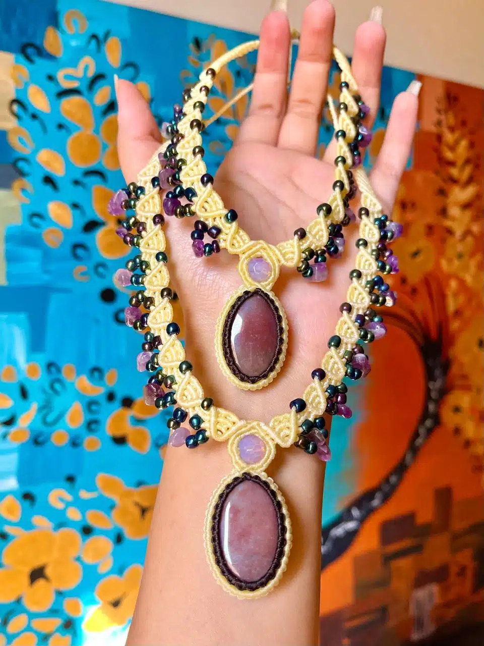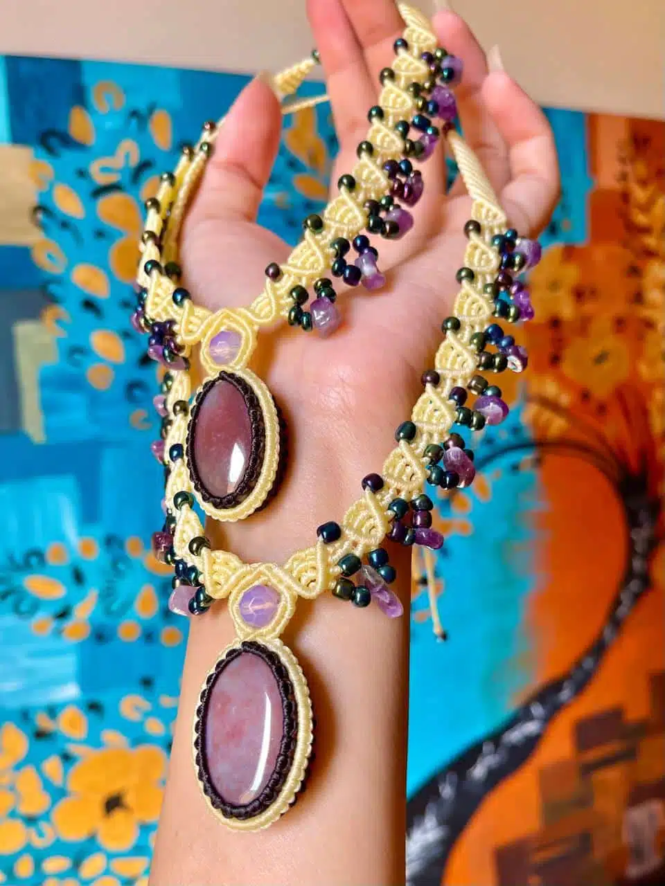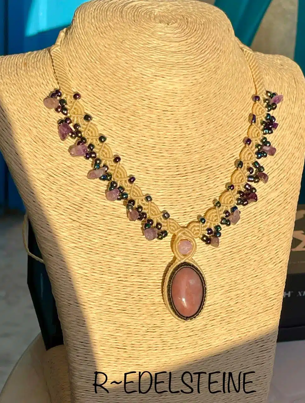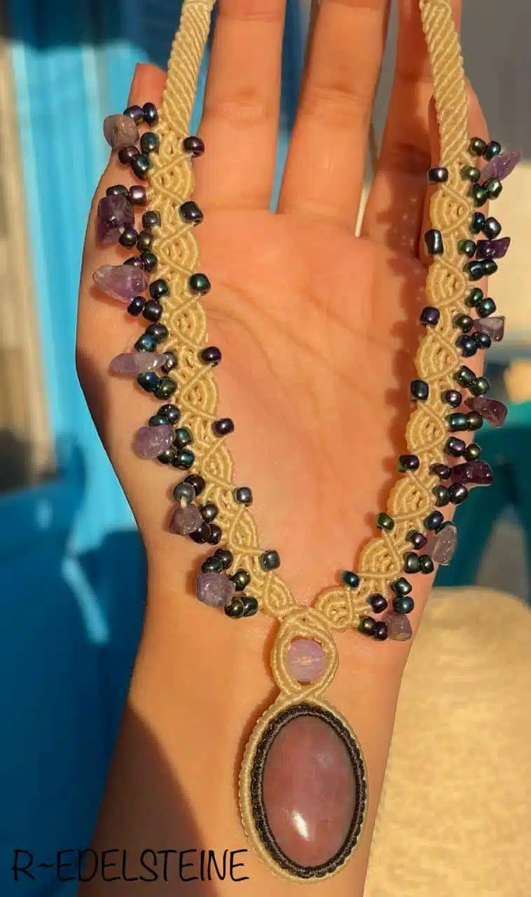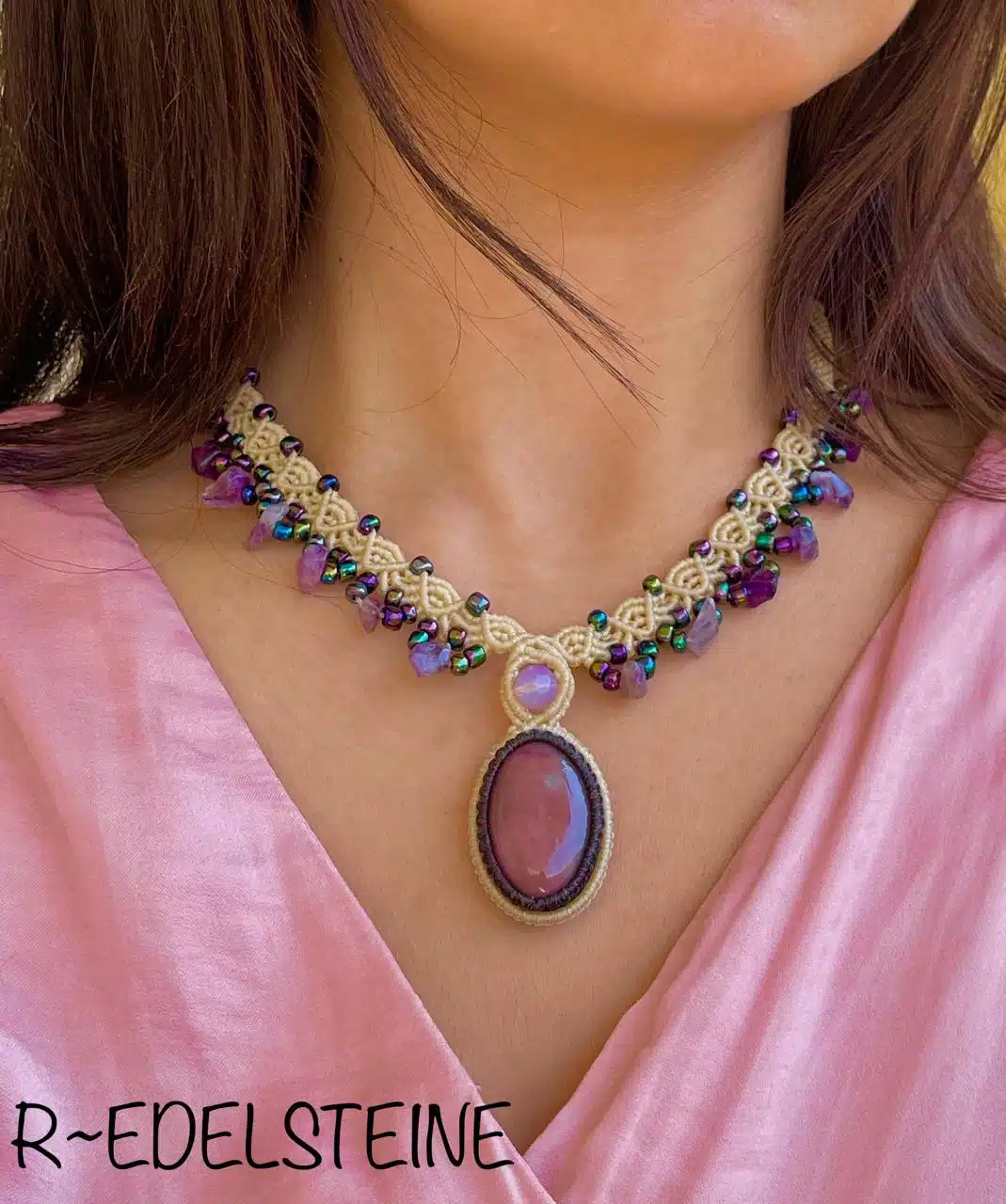 A Handmade adjustable necklace created with Pink Opal Crystal embraced by amethyst stones.
