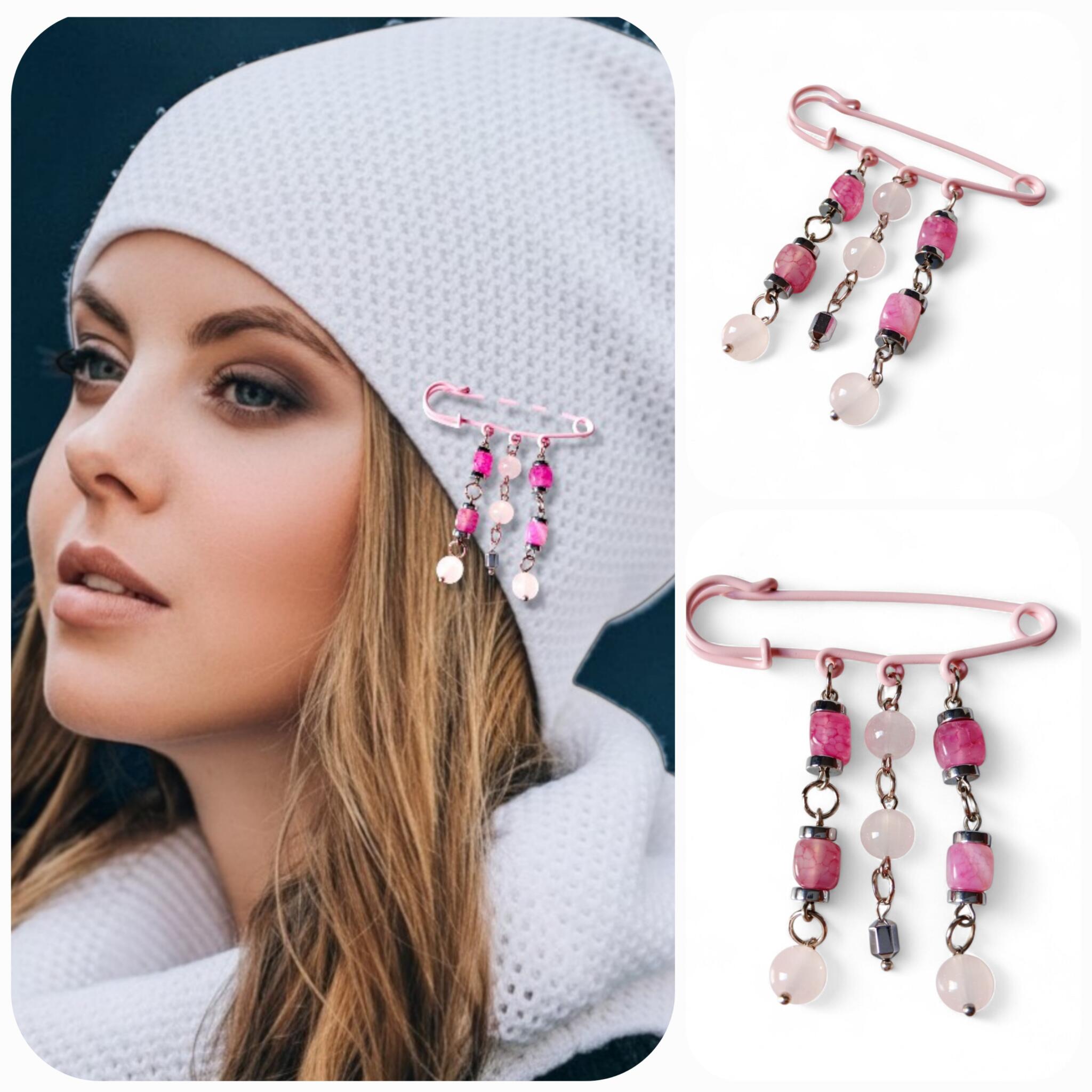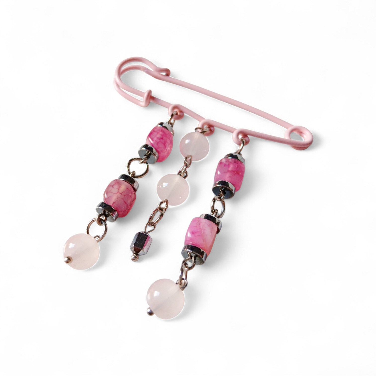 A pin made of pink agate and rose alabaster stone beads with silver hematite beads