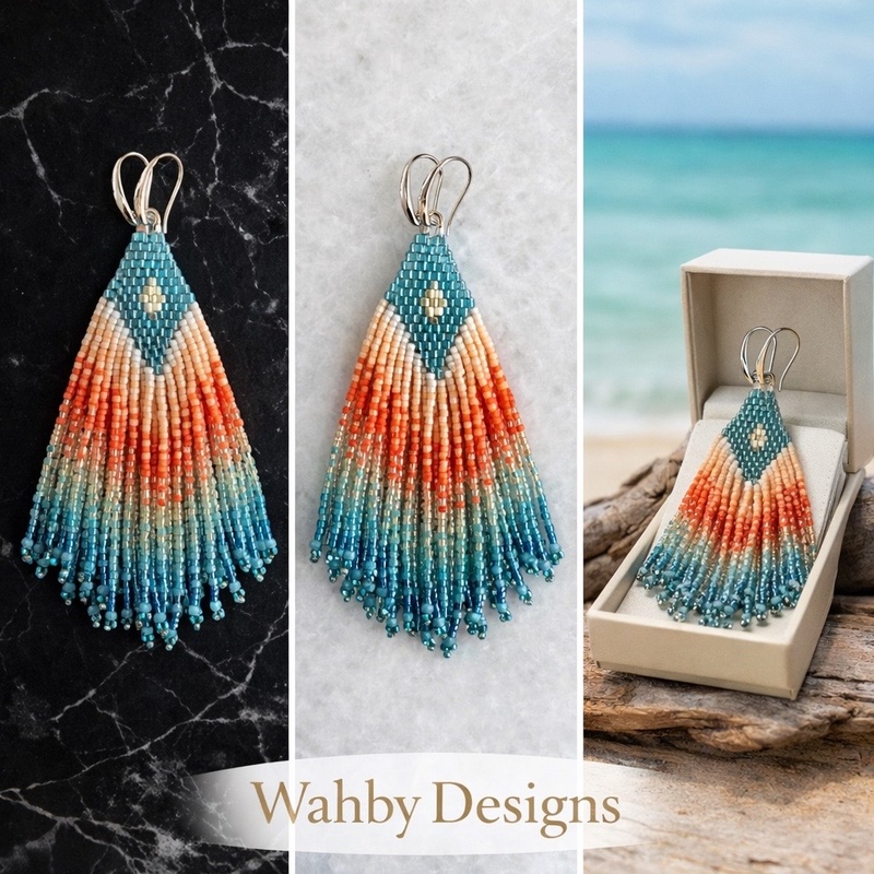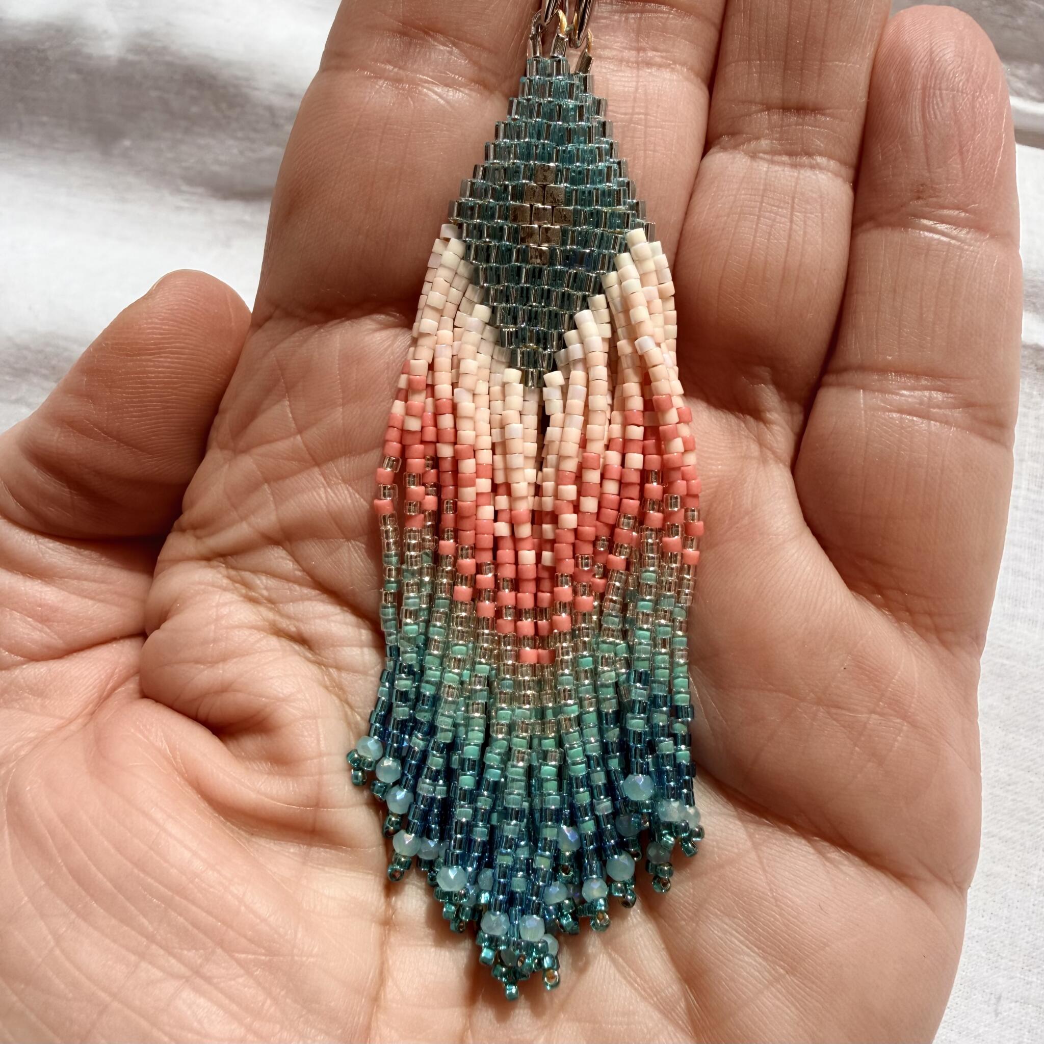 These handcrafted fringe earrings by Wahby Designs feature a vibrant cascade of Japanese Miyuki Delica beads in rich coastal hues. Accented with a delicate metallic motif at the crown. Each bead is meticulously hand-woven over 6–8 hours, creating fluid movement and exceptional detail that reflects true artisanal craftsmanship. Finished with elegant gold-filled or silver plated hooks and subtle crystal accents, this one-of-a-kind piece brings effortless luxury and color to any look.