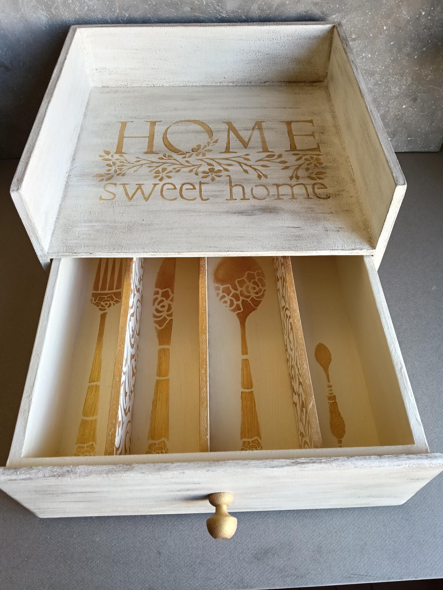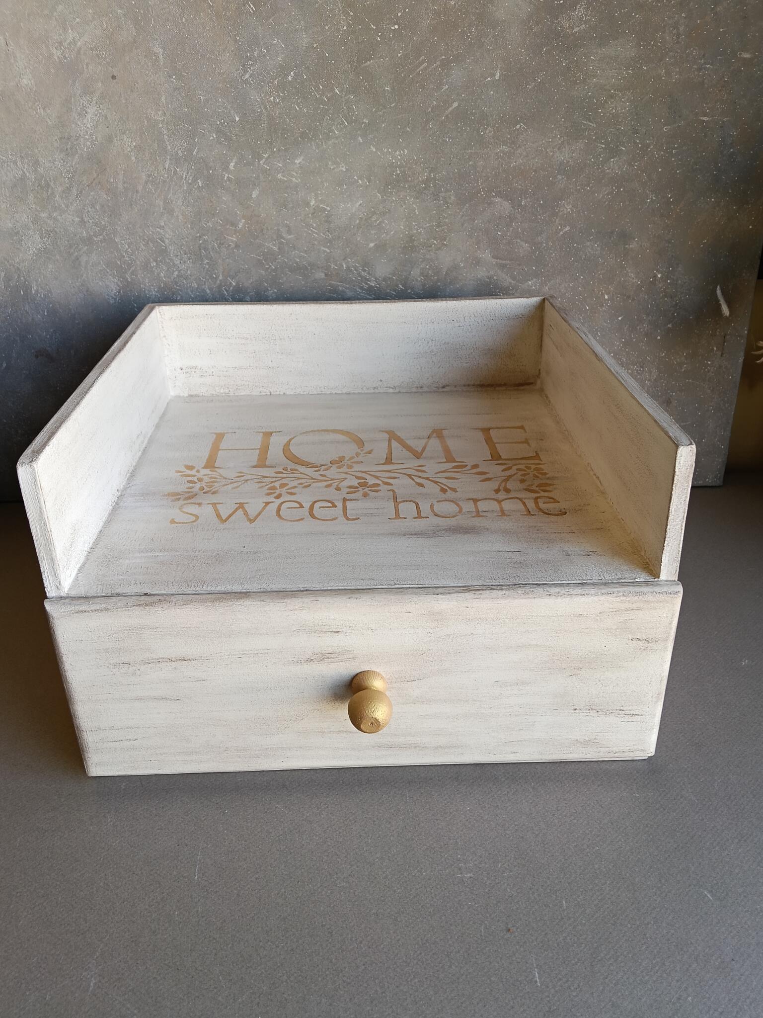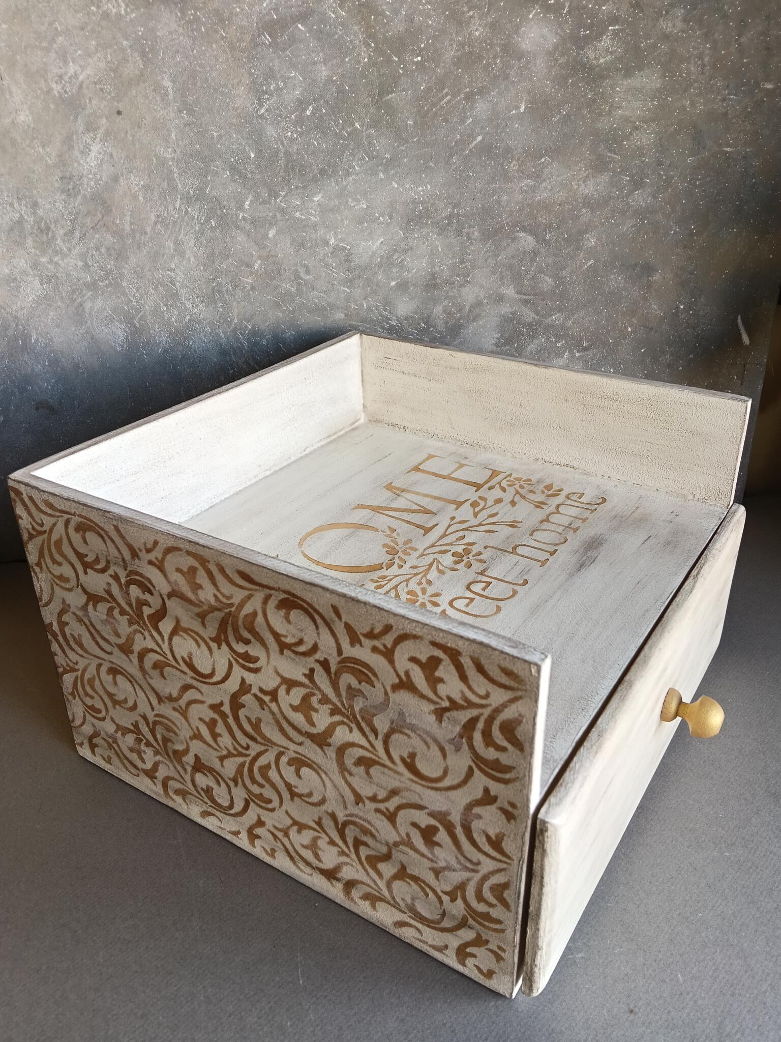 This organizer is painted in beige with a touch of gold and stenciled all around with a gold pattern