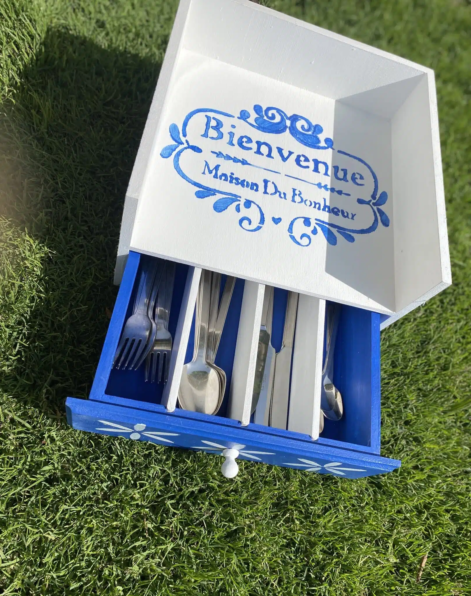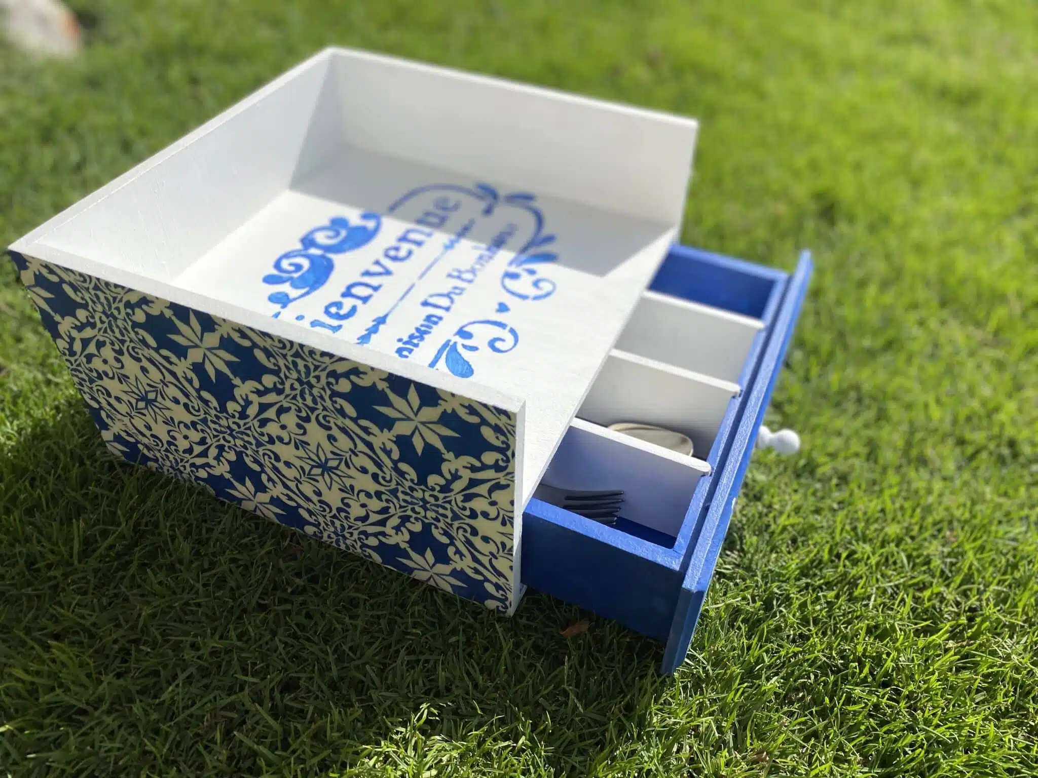 Wooden Plates & Cutlery organizer with drawer with Santorini design and colors
