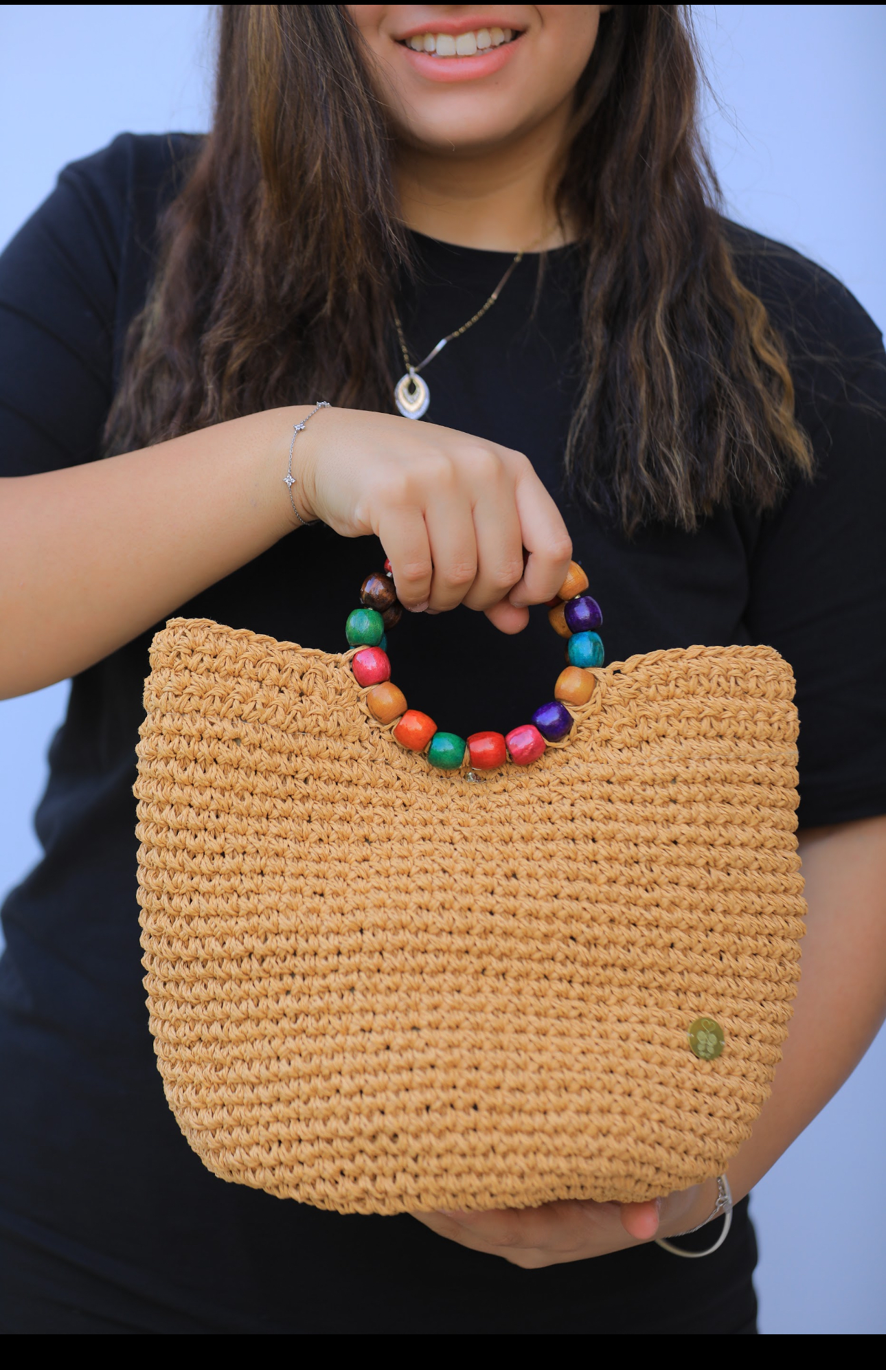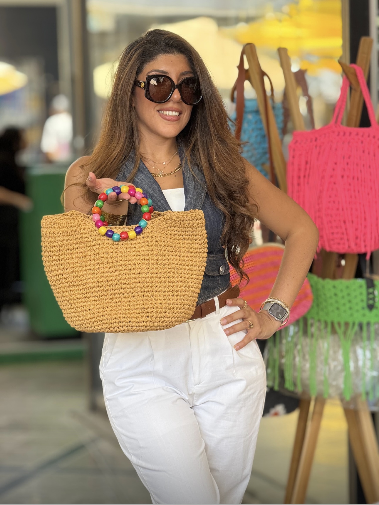 Pompom summer bag is a handmade bag made from raffia threads and wooden handle suitable for summer time
