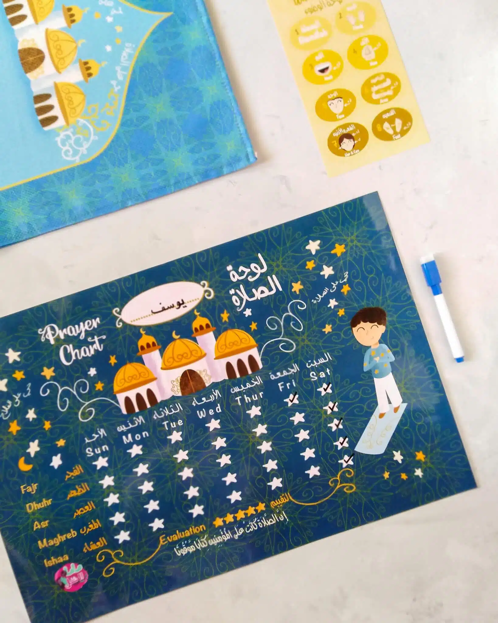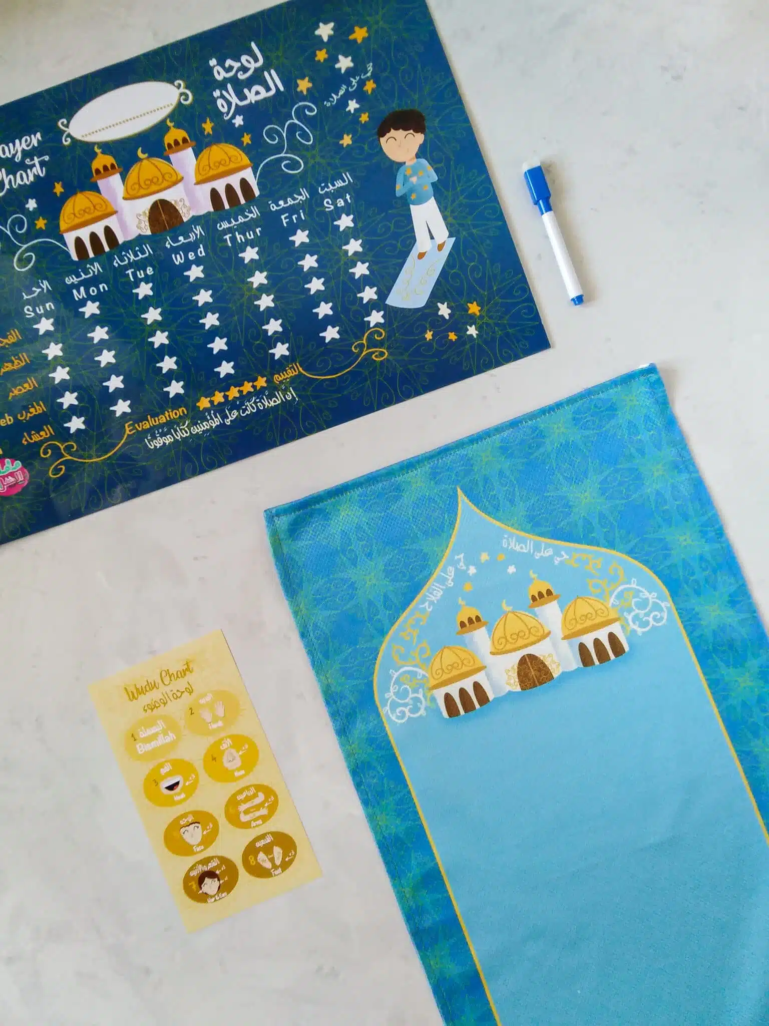 With this praying set , you and your child can track the daily 5 prayers throughout the week . This tracking system will ensure you that your kids will be committed to their daily prayers .Also you can give them your weekly evaluation for their progress .