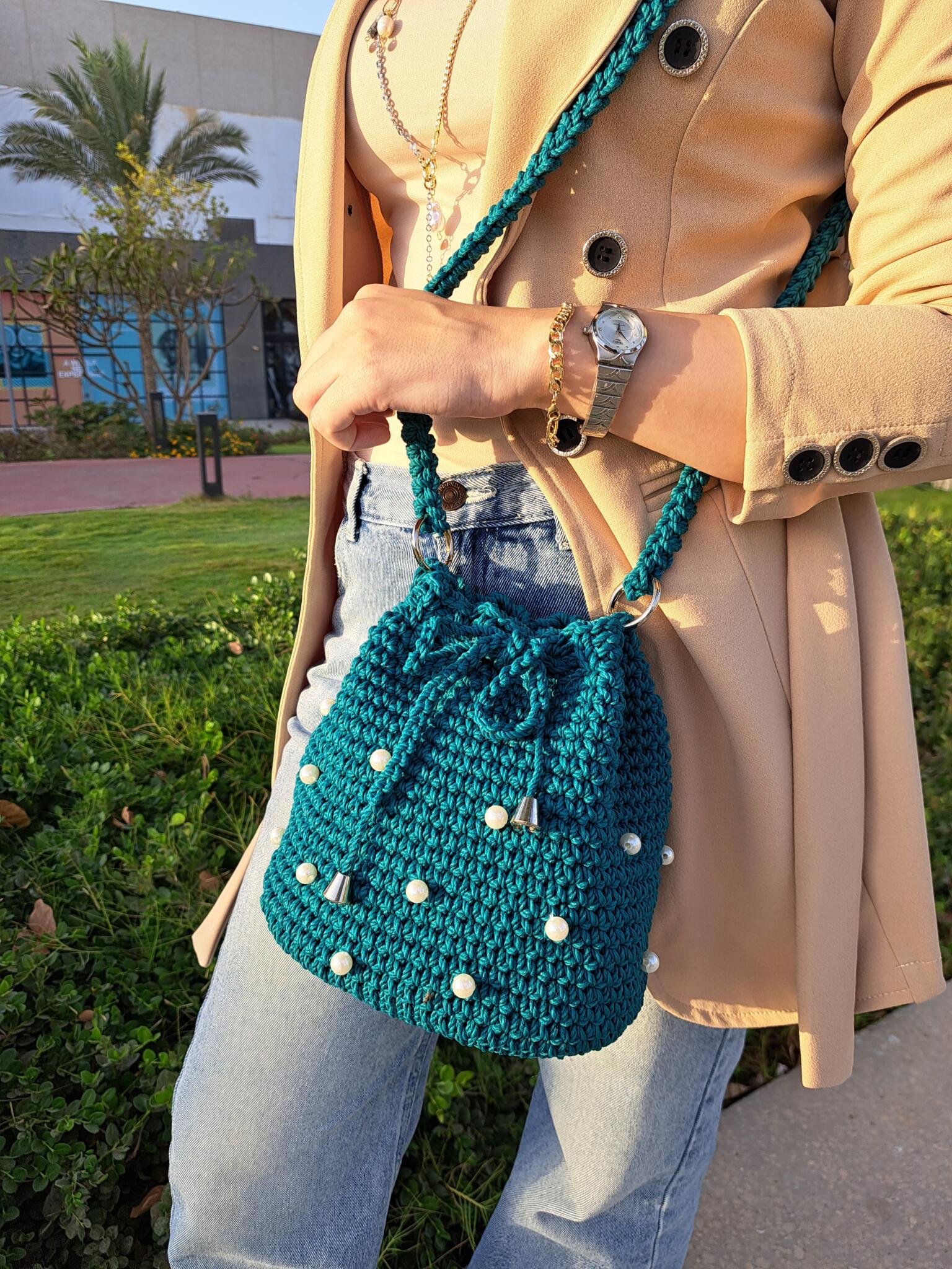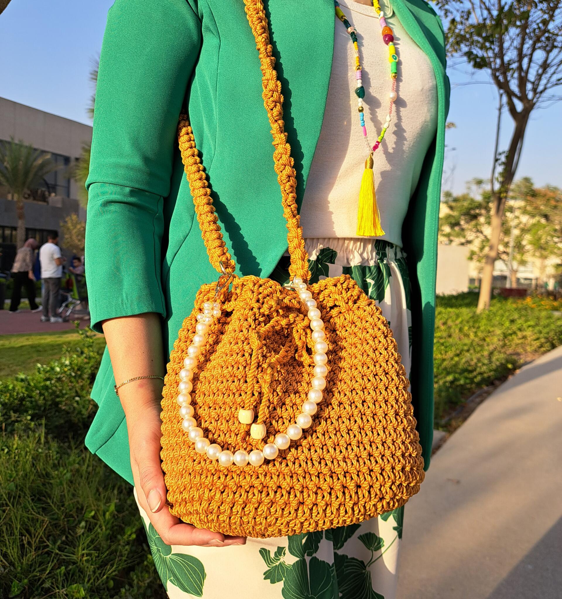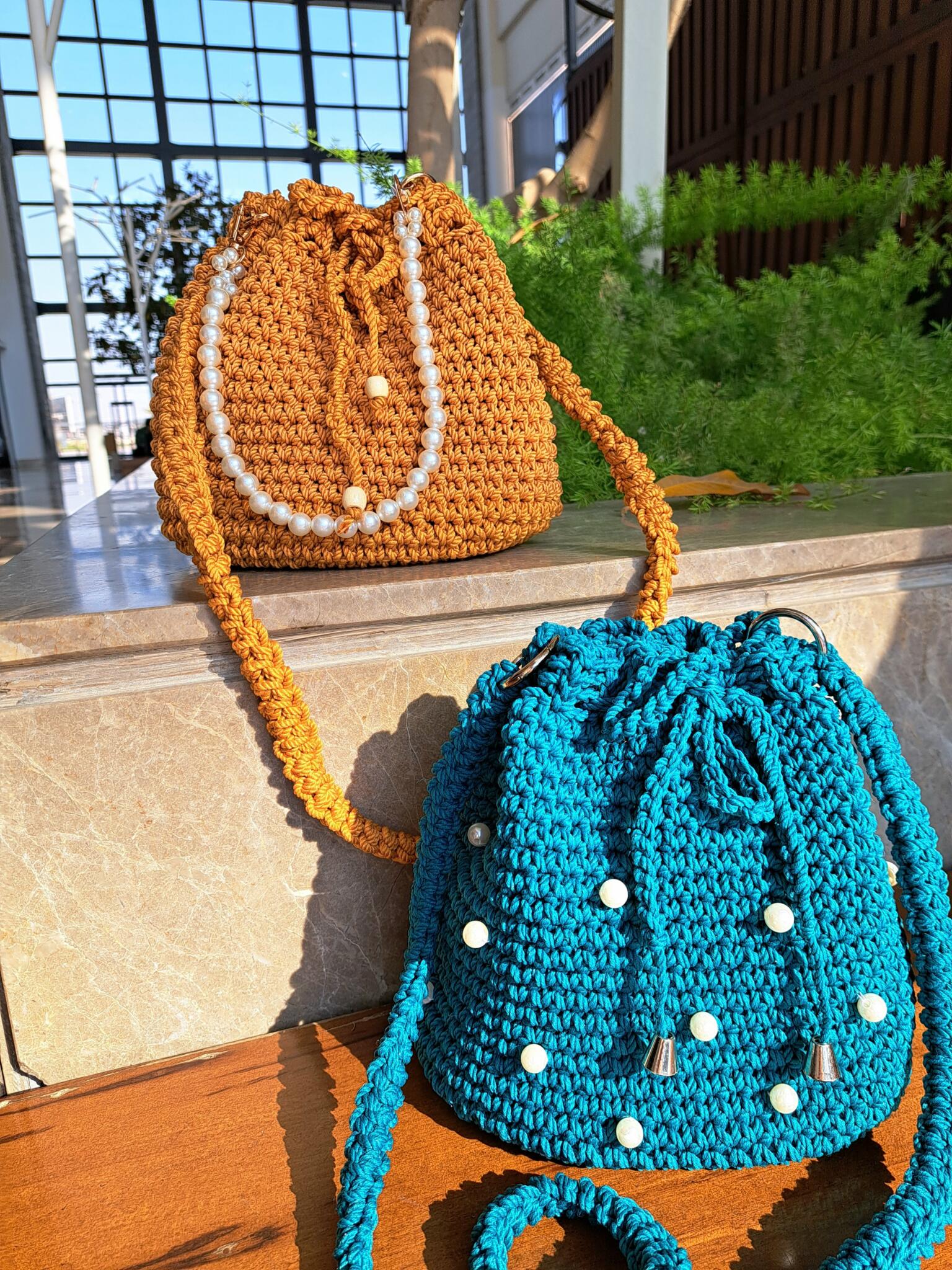 Handmade macrame bags with cross straps.