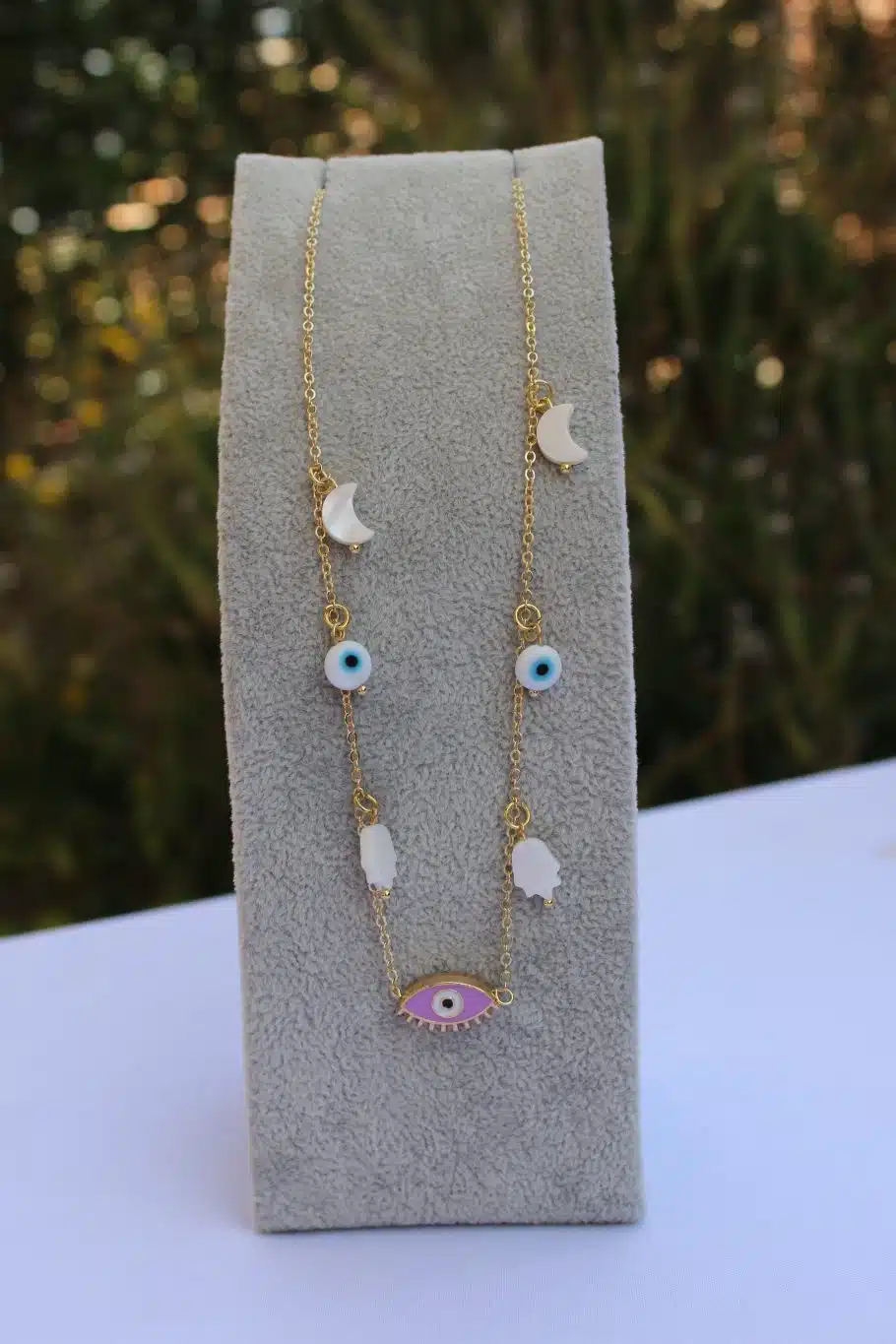 Necklace Chinese gold with evil eye & pearl charms.