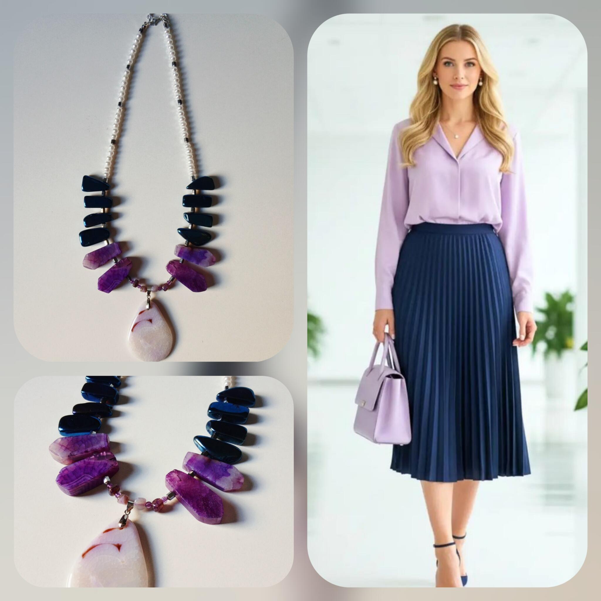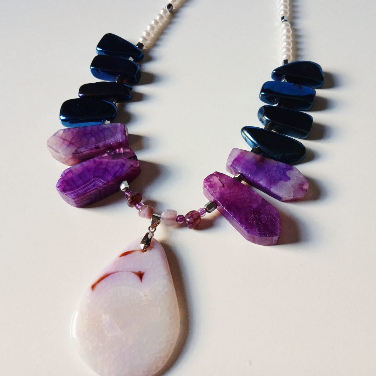 A statement necklace made of big dark purple agate stones and blue metallic stones along with hematite beads and white crystal stones and a big lilac gemstone