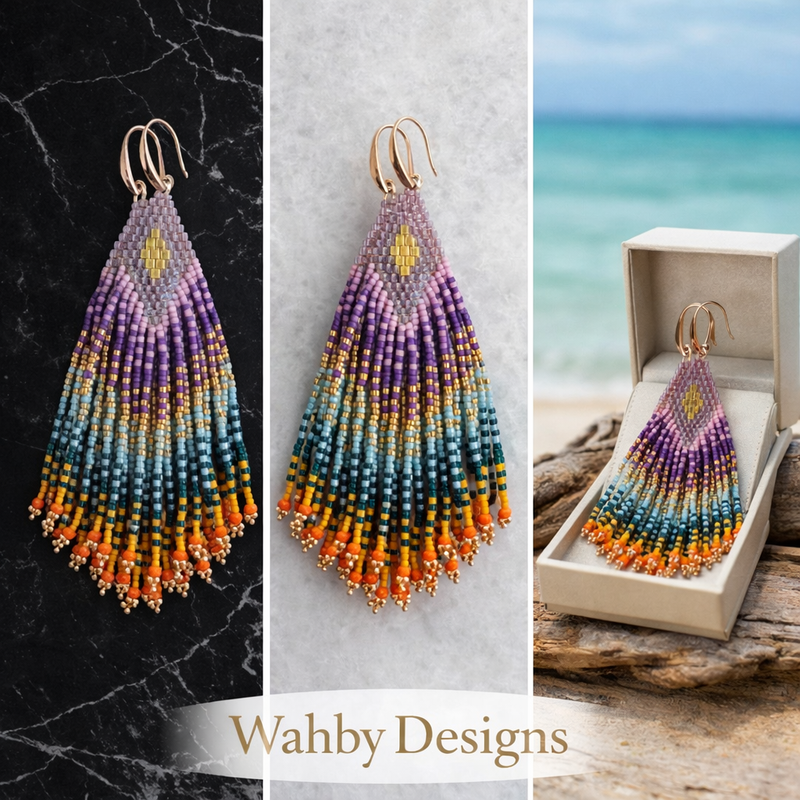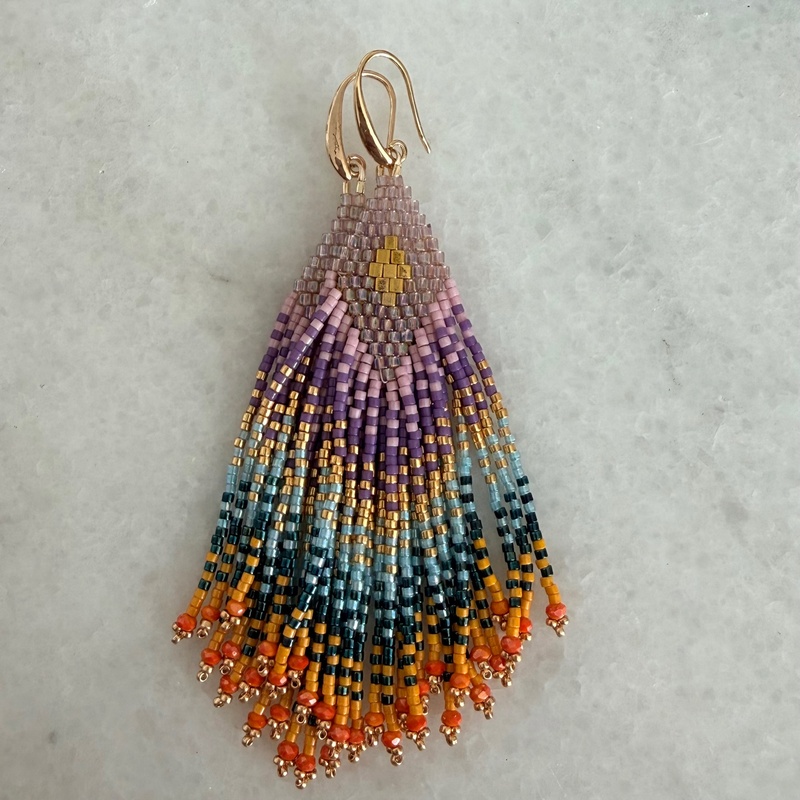 These handcrafted fringe earrings by Wahby Designs feature a vibrant cascade of Japanese Miyuki Delica beads in rich coastal hues. Accented with a delicate metallic motif at the crown. Each bead is meticulously hand-woven over 6–8 hours, creating fluid movement and exceptional detail that reflects true artisanal craftsmanship. Finished with elegant gold-filled or silver plated hooks and subtle crystal accents, this one-of-a-kind piece brings effortless luxury and color to any look.