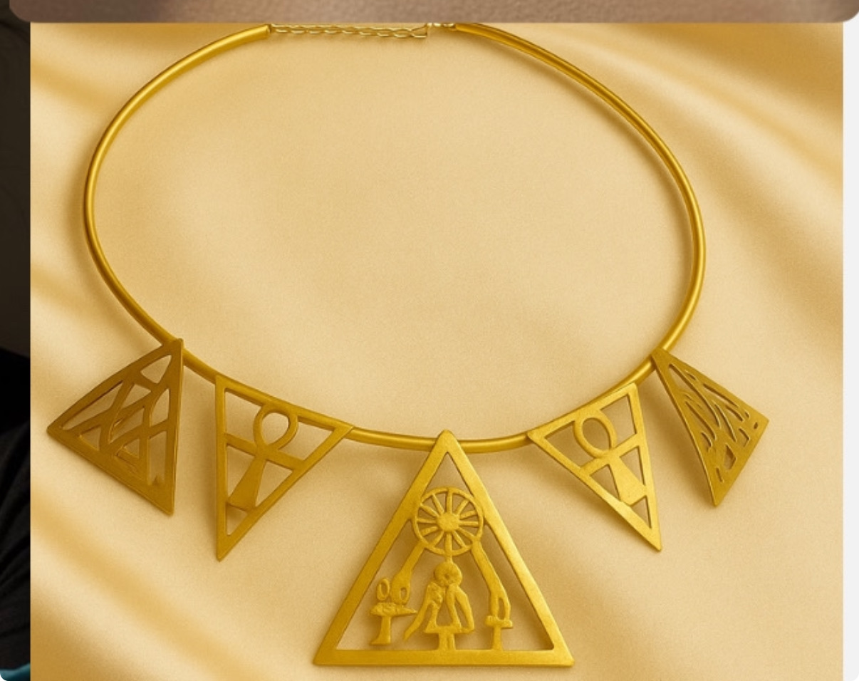 copper gold platted collar in the shape of pyramids with lotus and key of life.