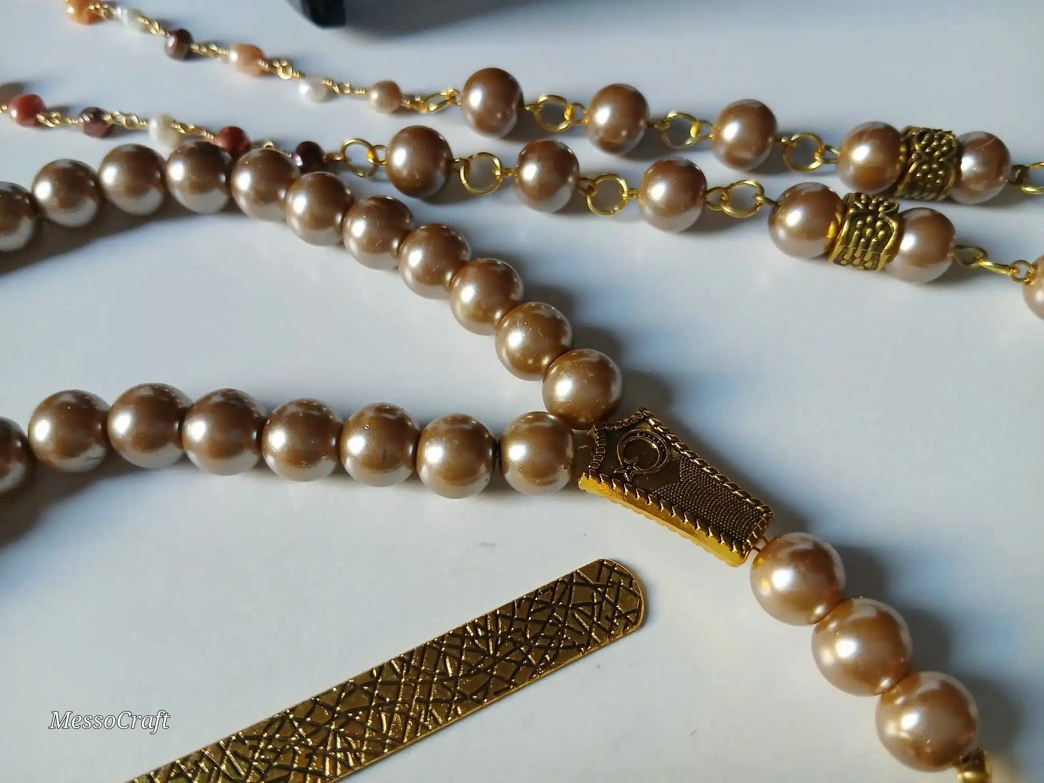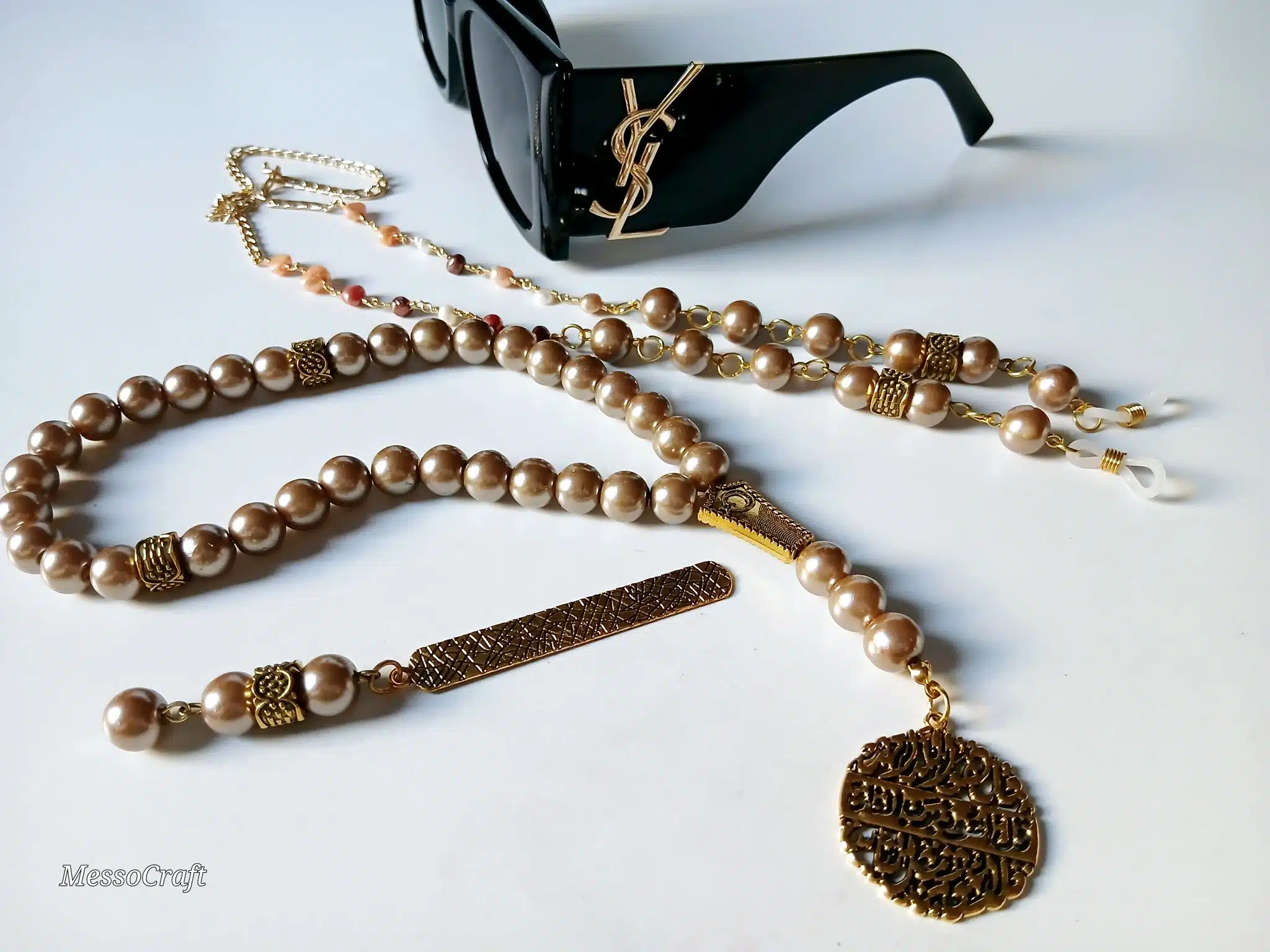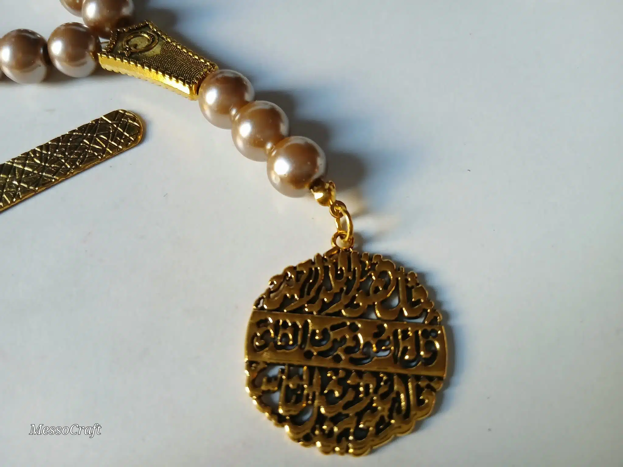 3 pcs set of 33 beads sepha, glasses chain and bookmark made of latte metallic pearl stones and a unique golden colour Quran pendant الاخلاص والمعوذتن