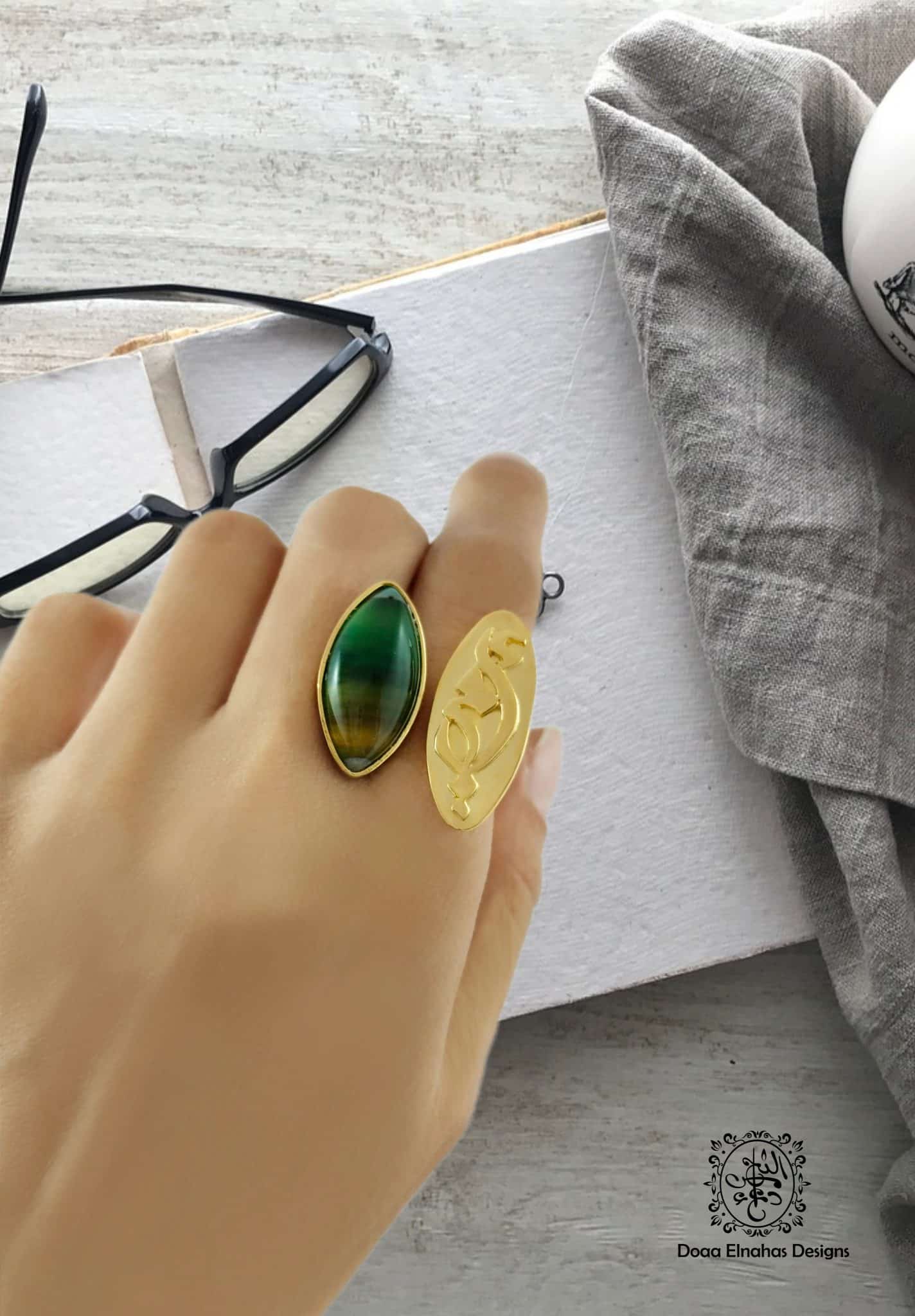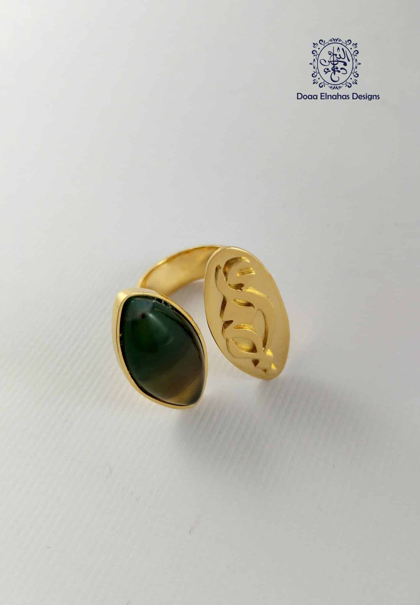 Gold-plated brass ring with a green agate stone and Arabic calligraphy “أمي”