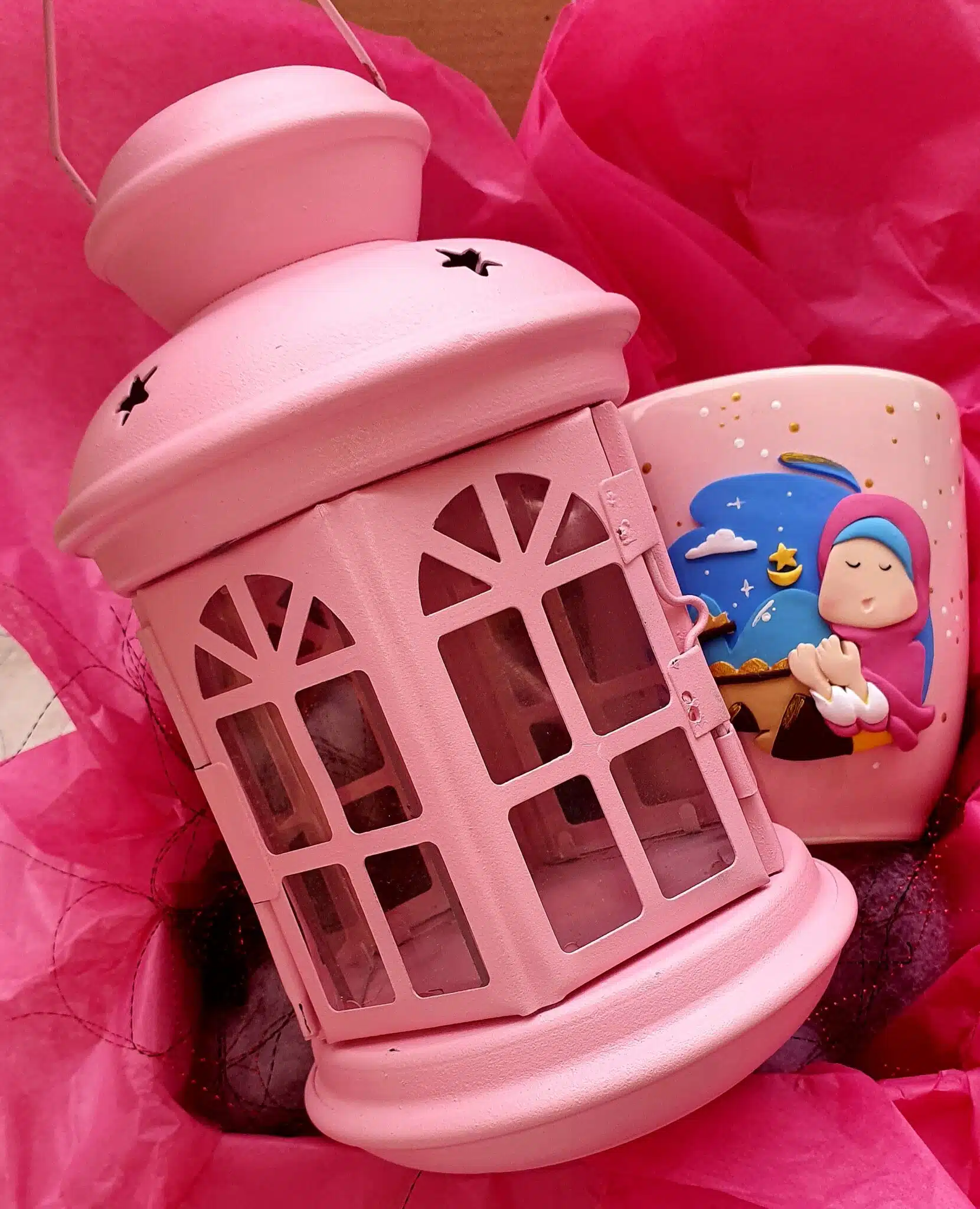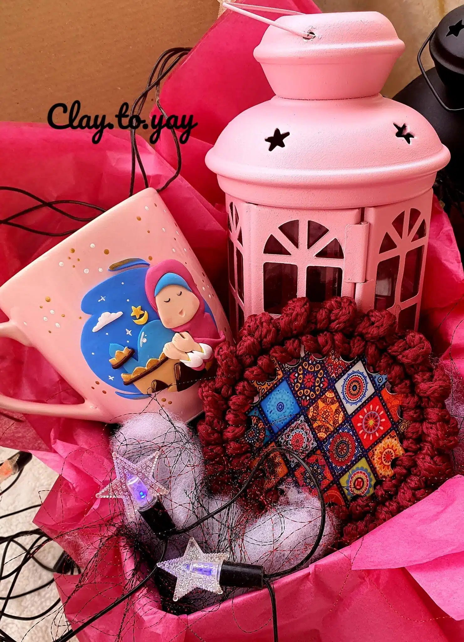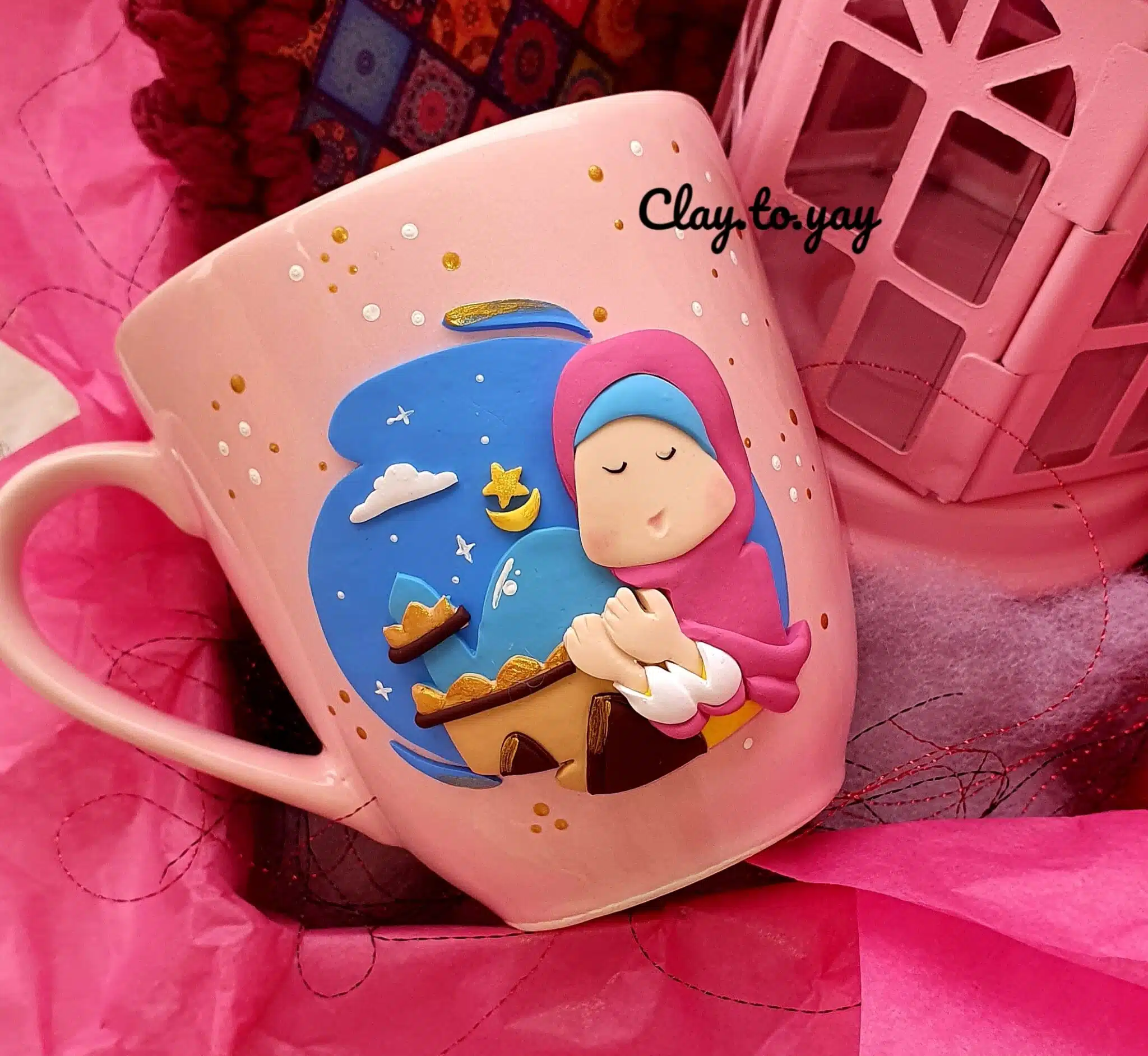 3- porcelain pink mug with a design made of polymerclay