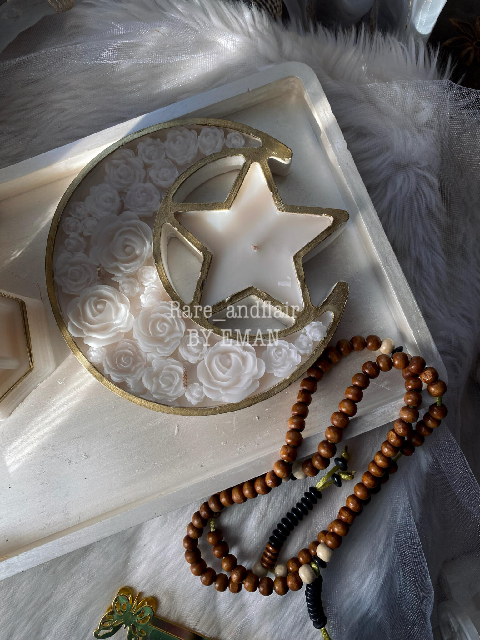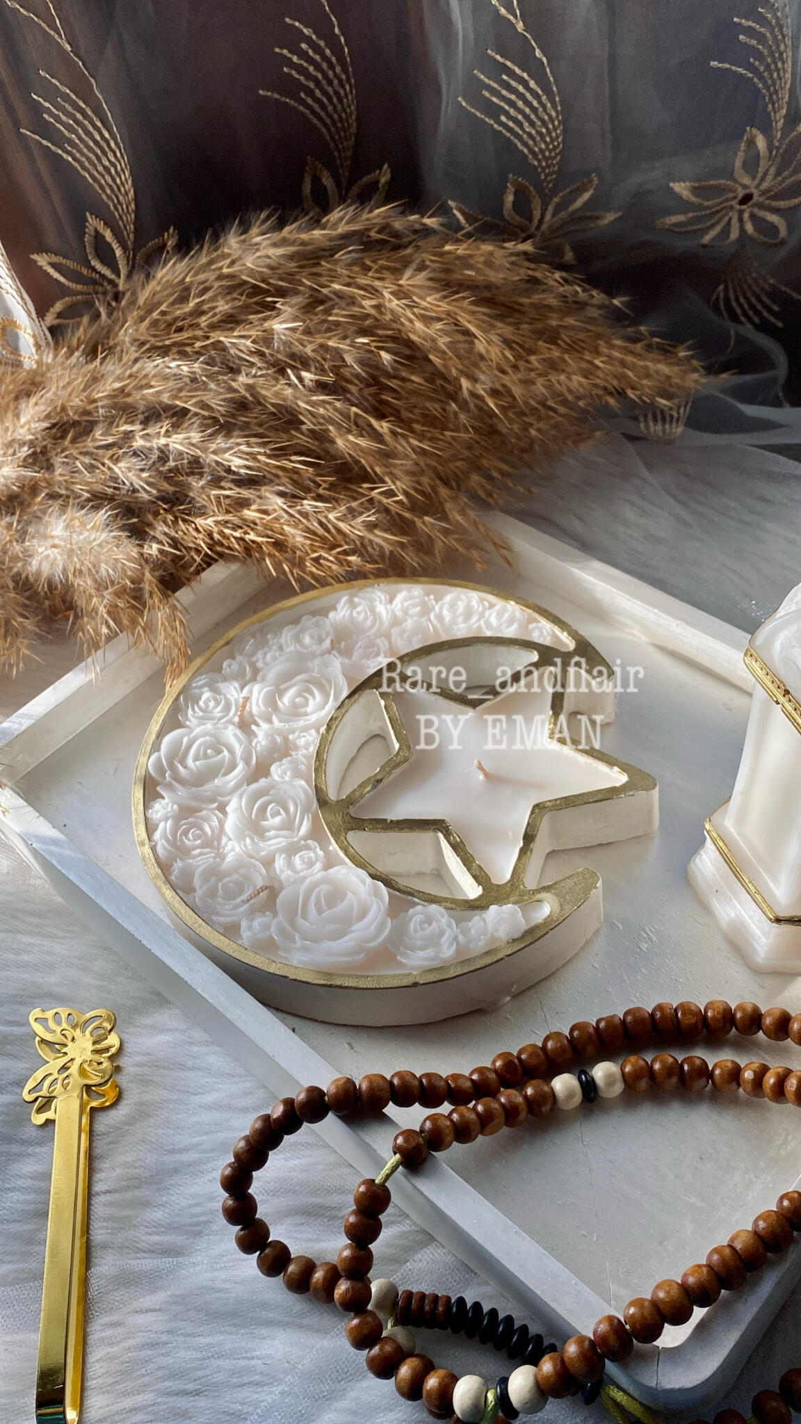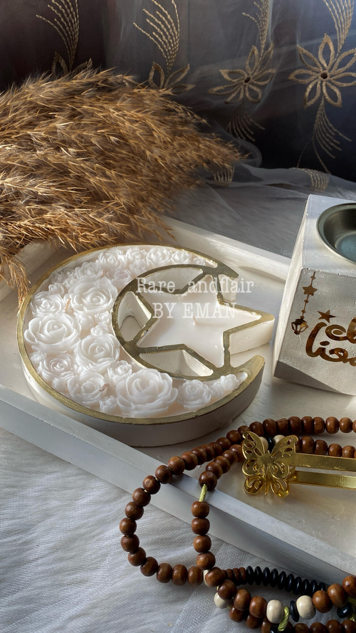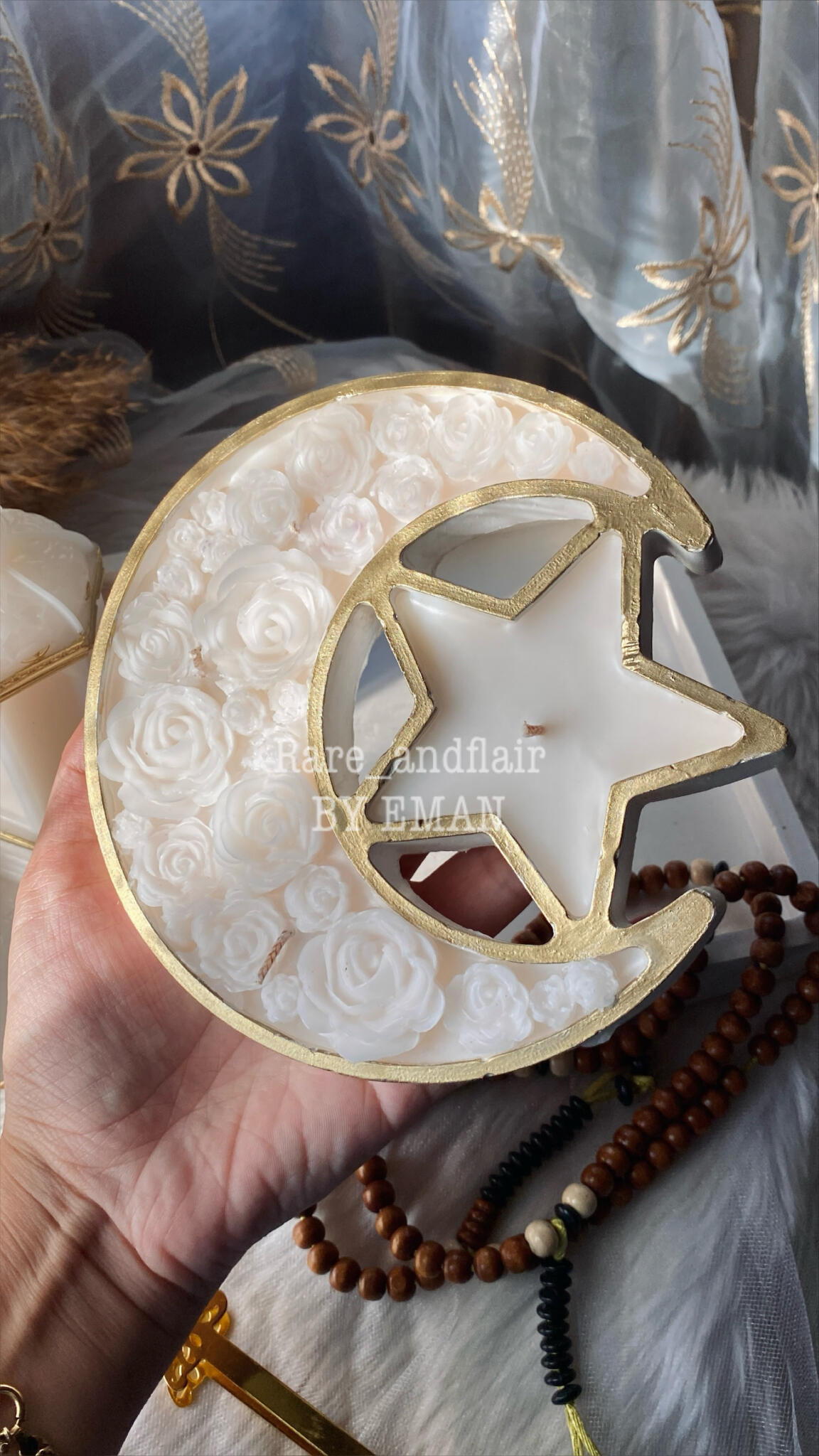 A charming candle designed in the shape of a crescent and star, symbolizing the beauty and magic of Ramadan. It brings a soft, warm glow that creates a peaceful and cozy atmosphere for your nights of prayer, reflection, and family gatherings