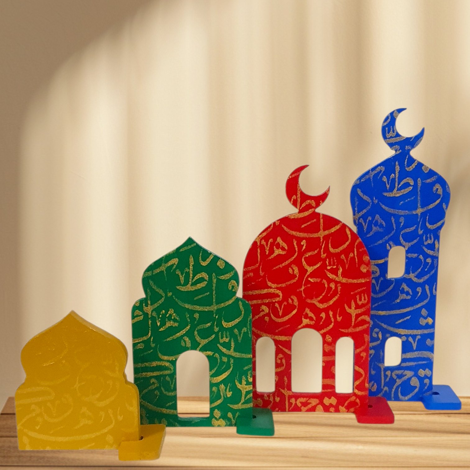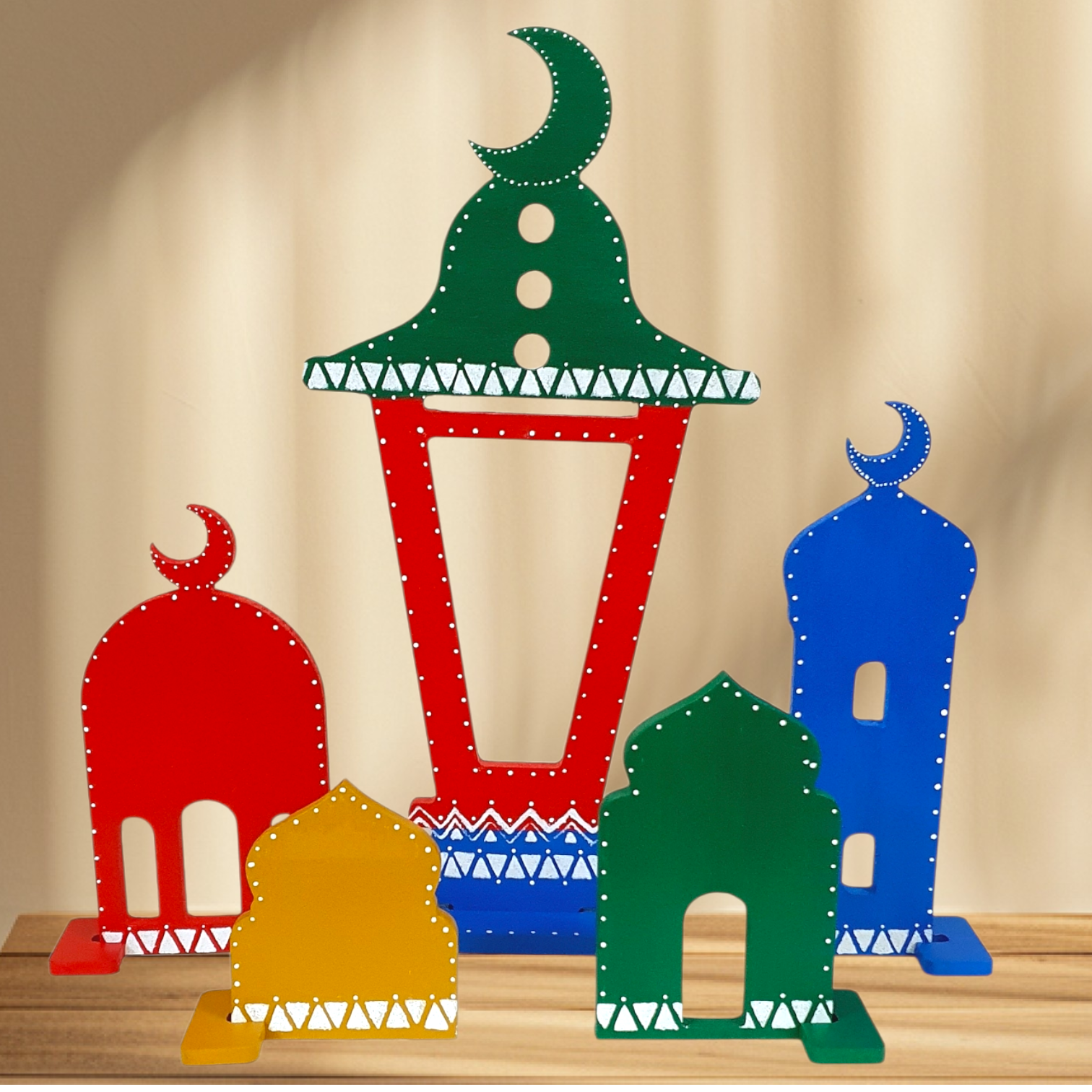 A beautiful decorative set for Ramadan with vibrant colors. Contains 5 pieces, chic and elegant, can decorate any corner in your room as well as your dining table. Made of wood, its light, easy to store and can be used over and over for years. Perfect gift too.