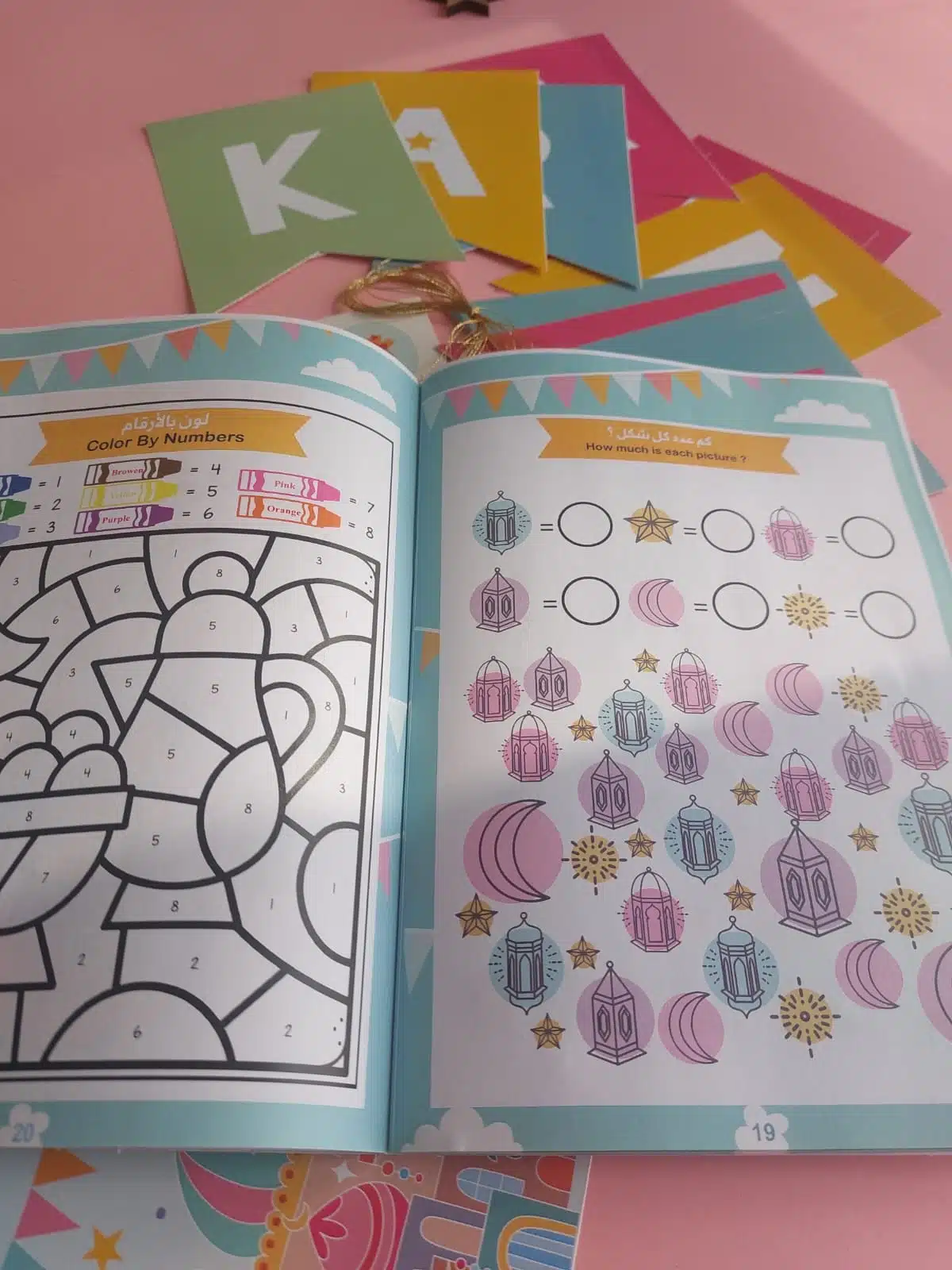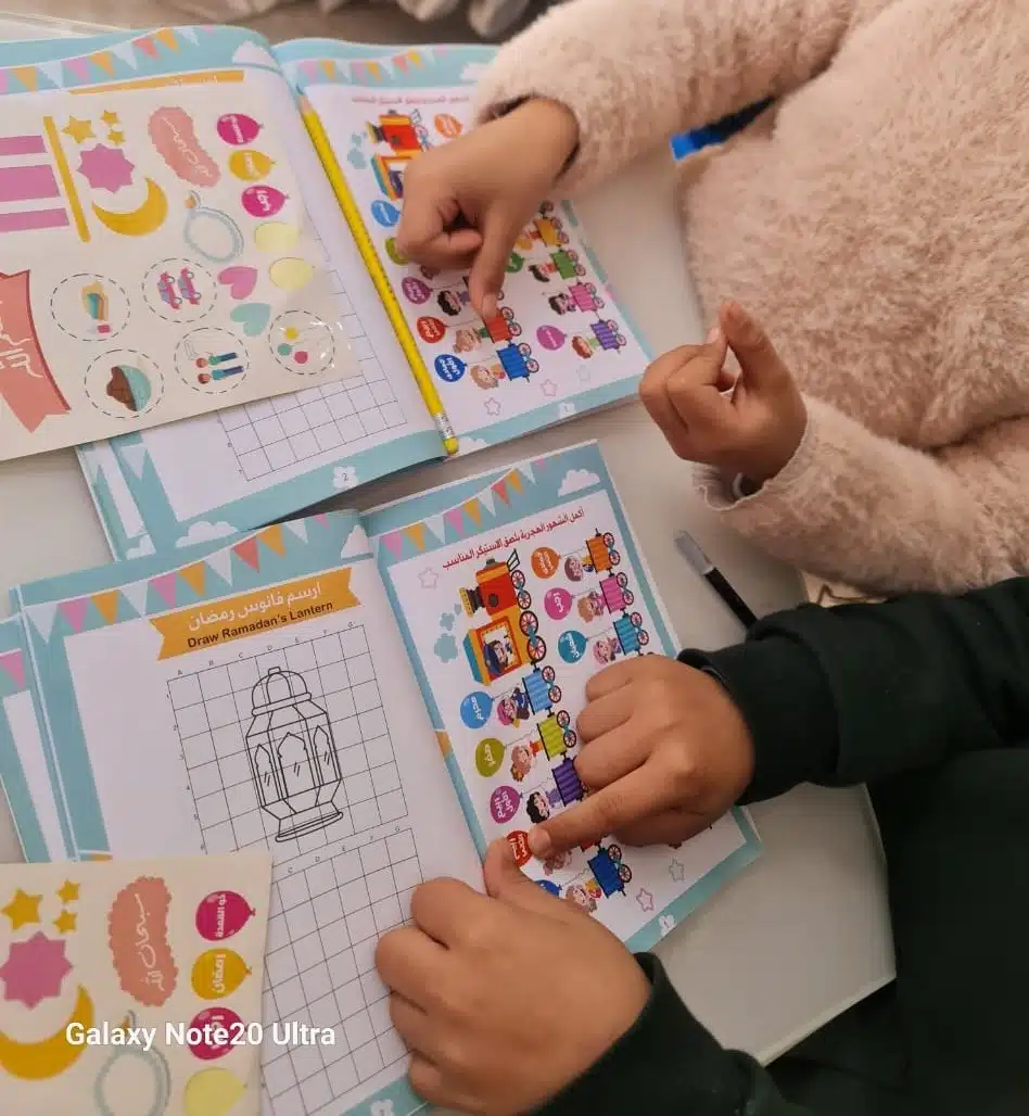 ⭐ Ramadan Activity Book – Includes challenges, coloring pages, and fun educational sections, along with interactive stickers to solve some challenges.