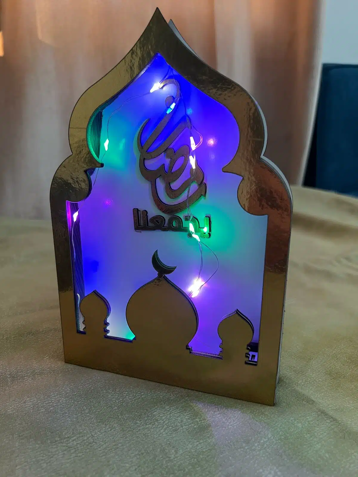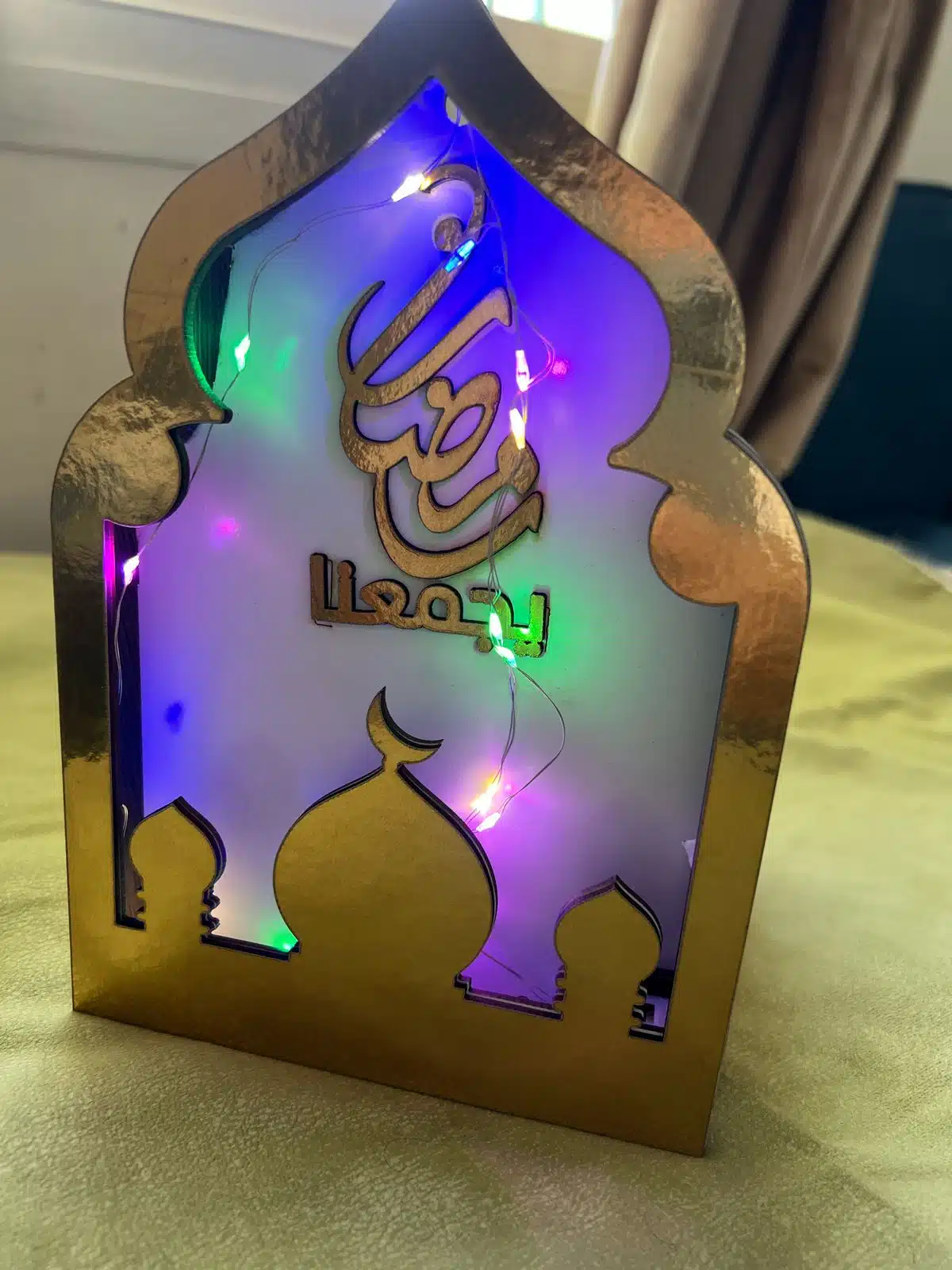 Ramadan Sparkle Gift Box comes with a prayer rosary with 99 beads, a wooden coaster and Ramadan Kareem wooden & Acrylic lightening Stand