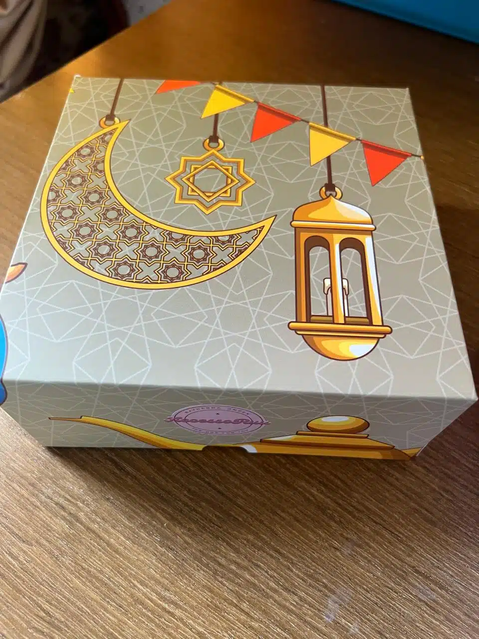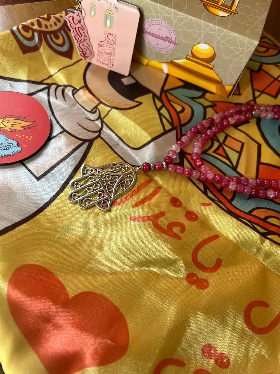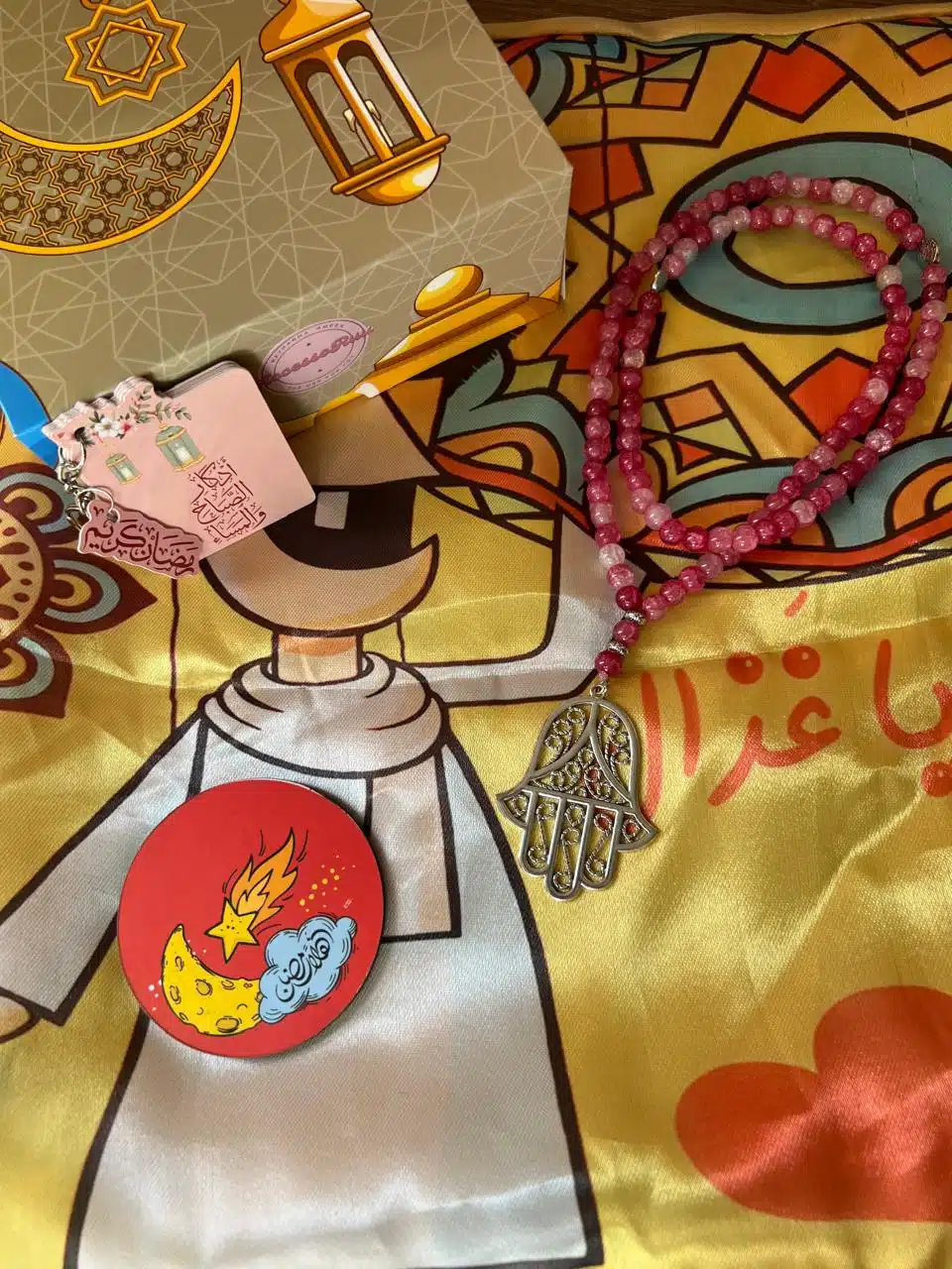 Ya Ghazal ya Ghazal Gift Box comes with a colorful cushion cover with El-Leila El-Kebeera theme, a prayer rosary with 99 beads, a red wooden coaster, and a pink Azkar keychain