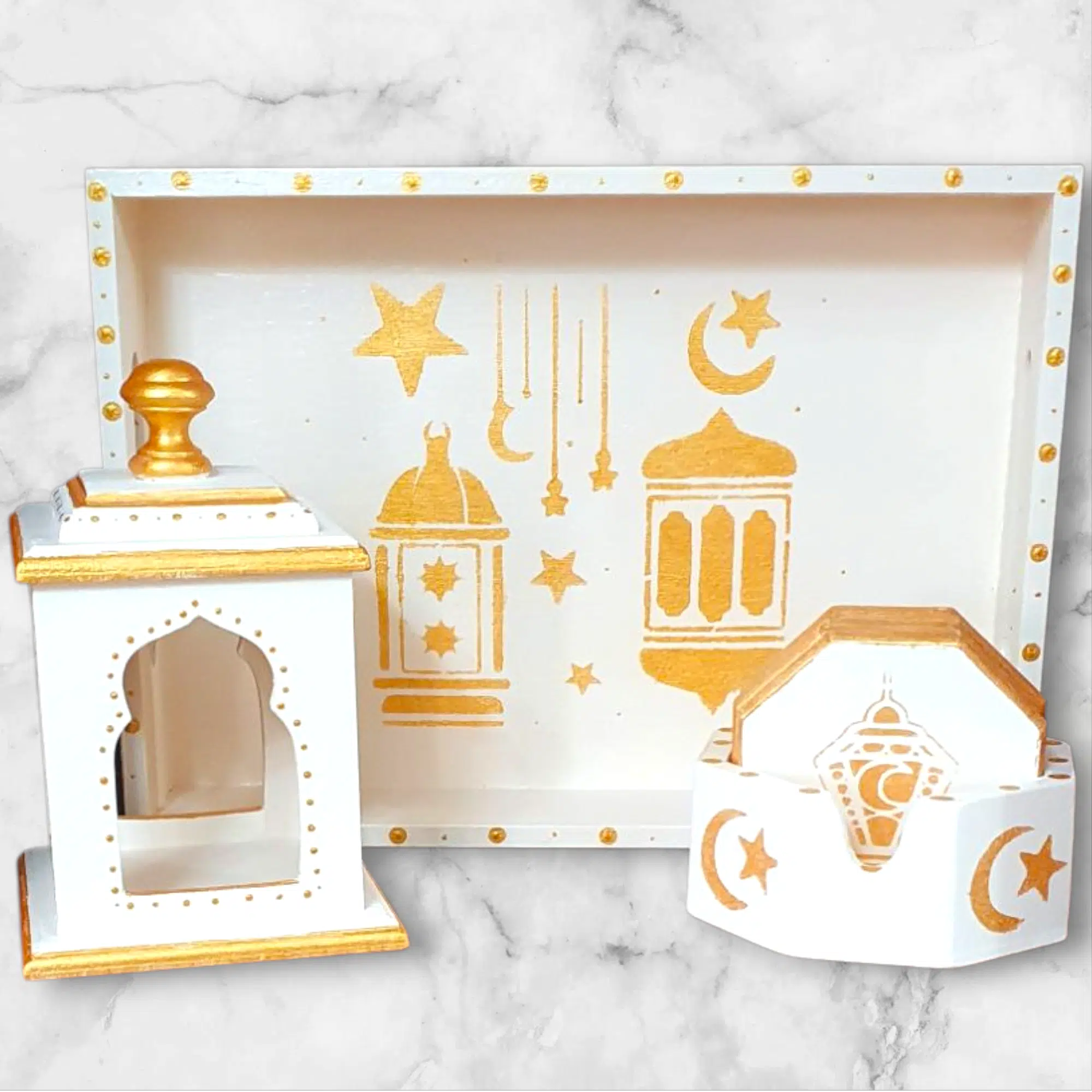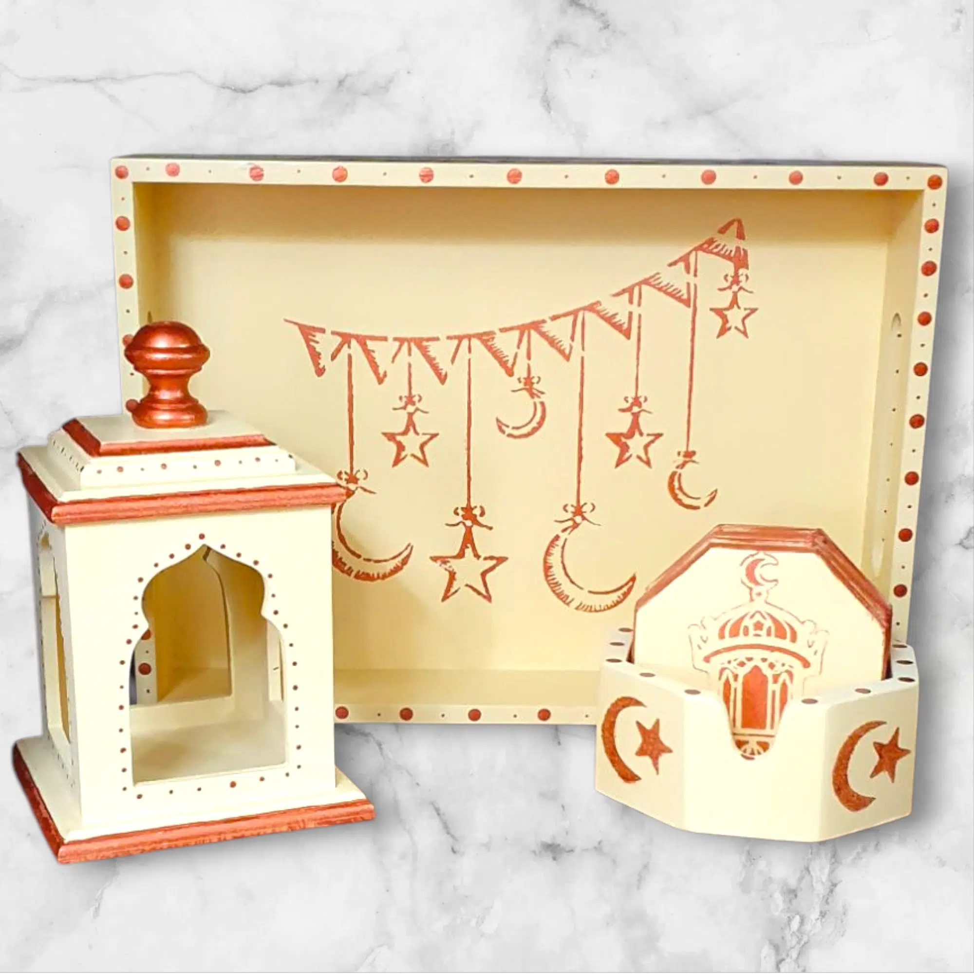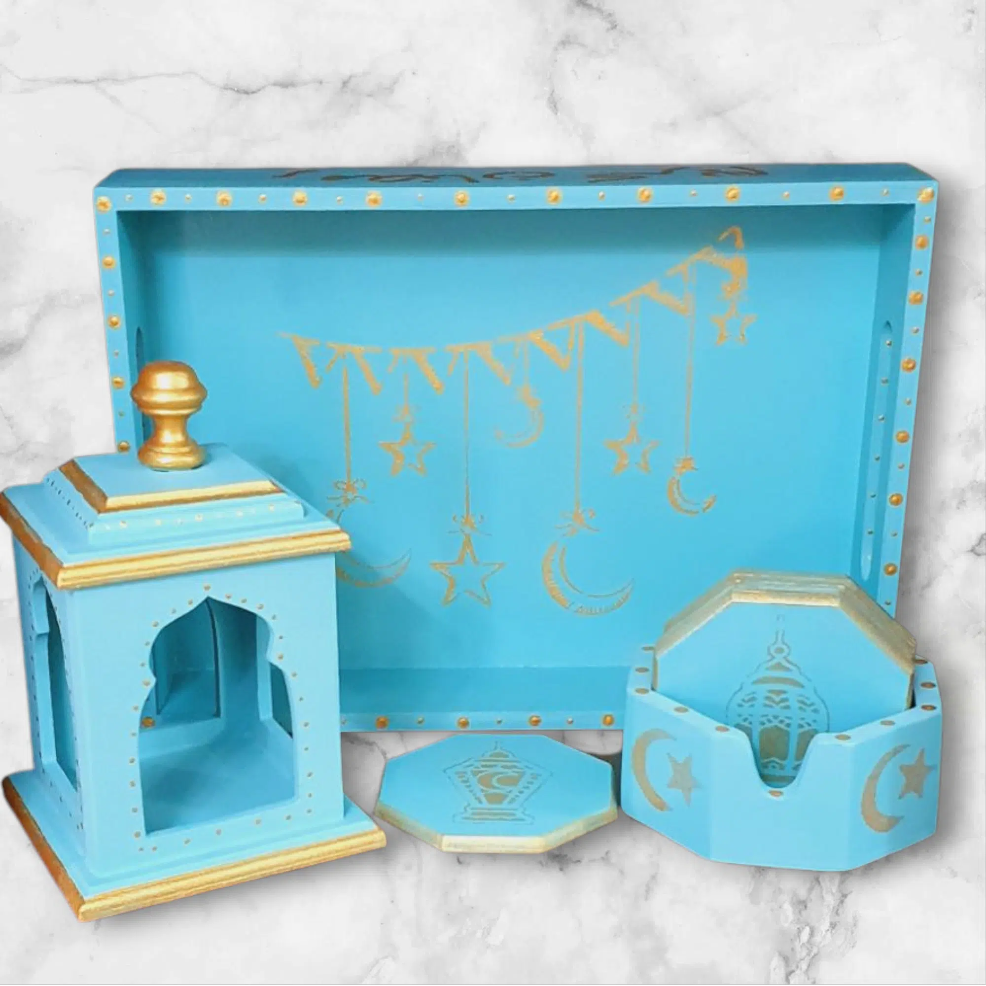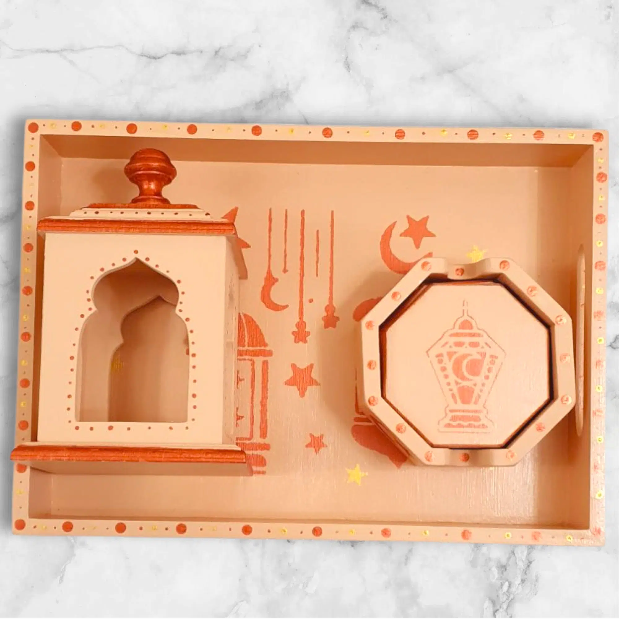 Ramadan Gift Set includes (Ramadan wooden tray, Ramadan lantern/fanoos, Ramadan set of coasters)