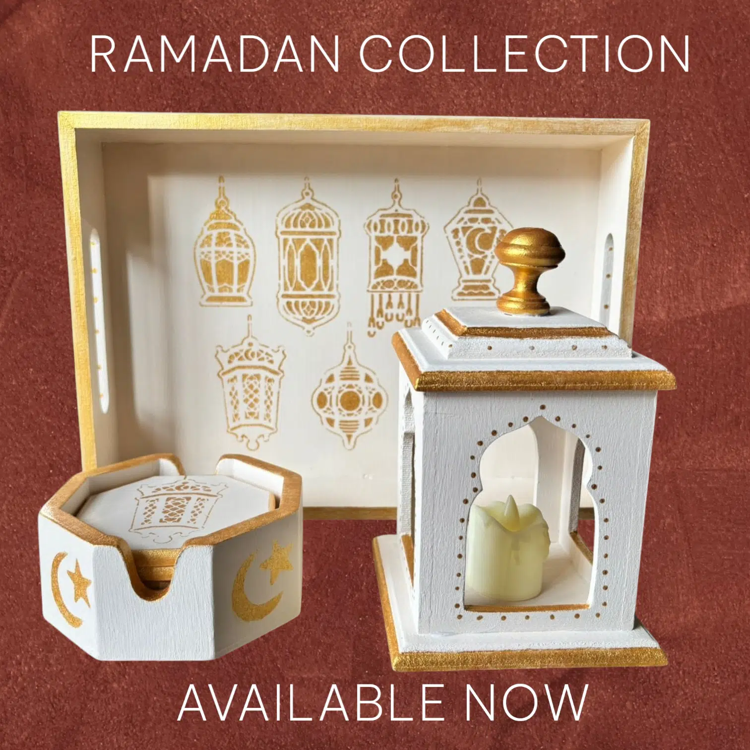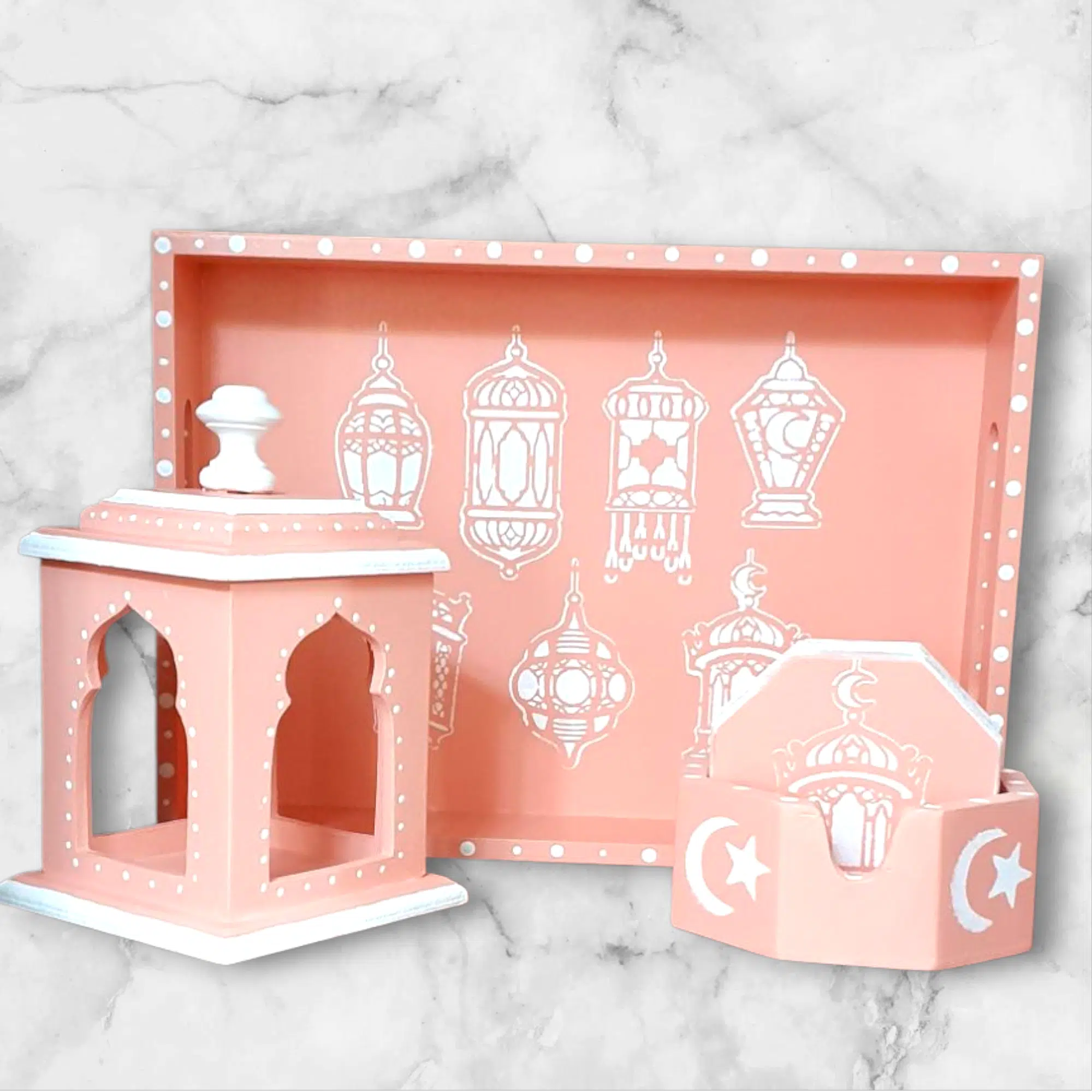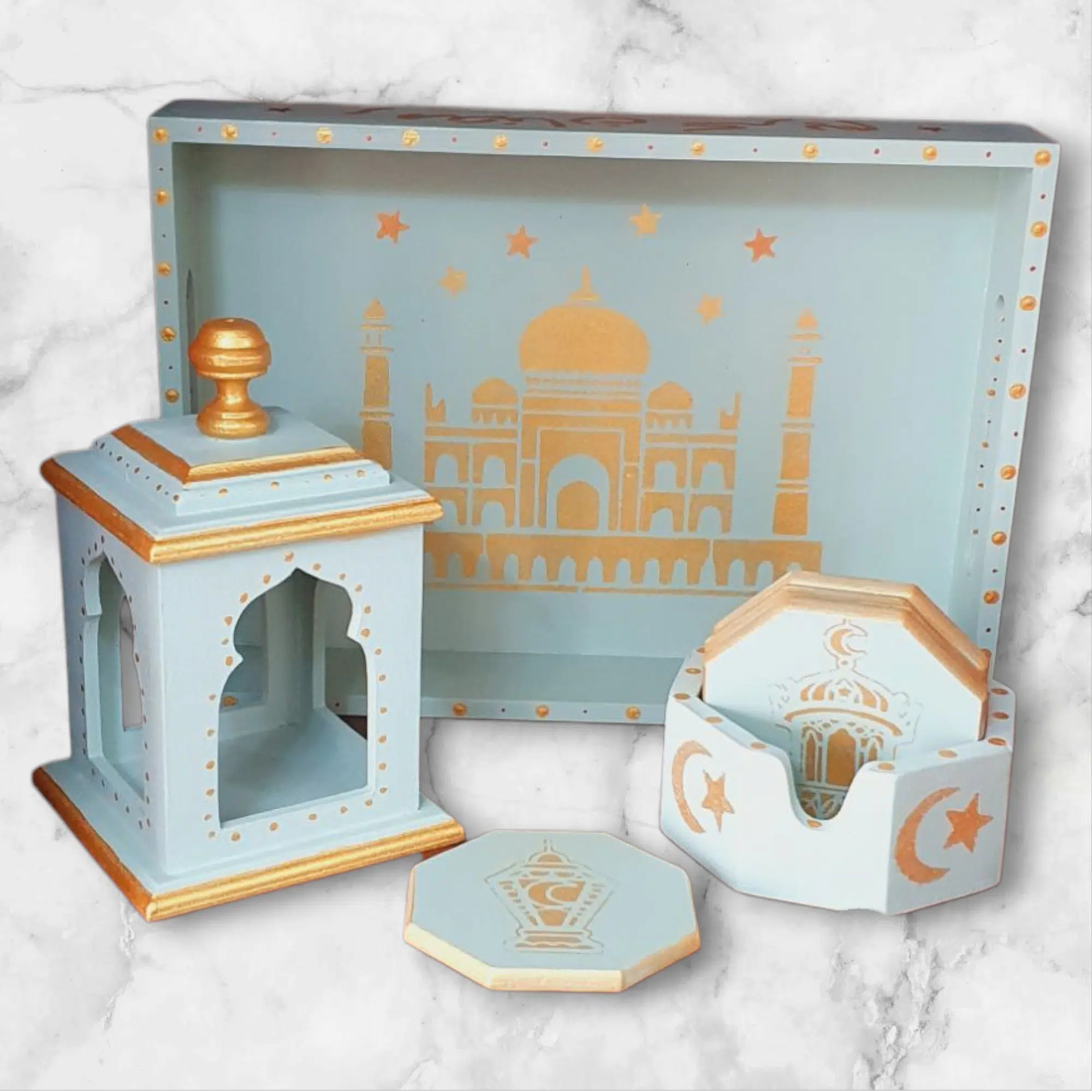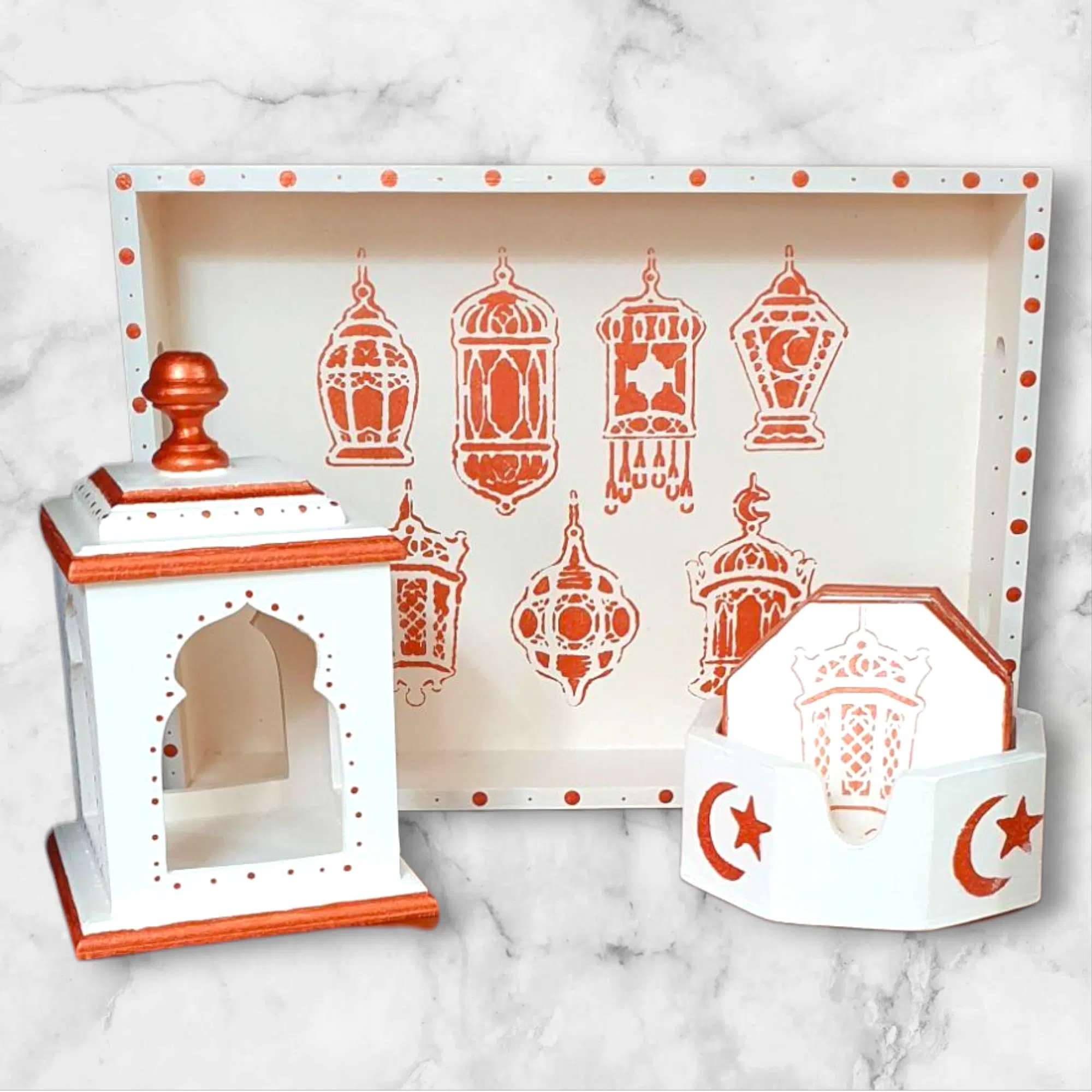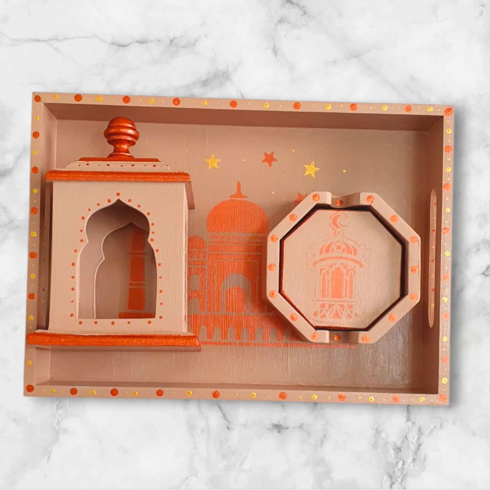 Ramadan Gift Set includes (Ramadan wooden tray, Ramadan lantern/fanoos, Ramadan set of coasters)
