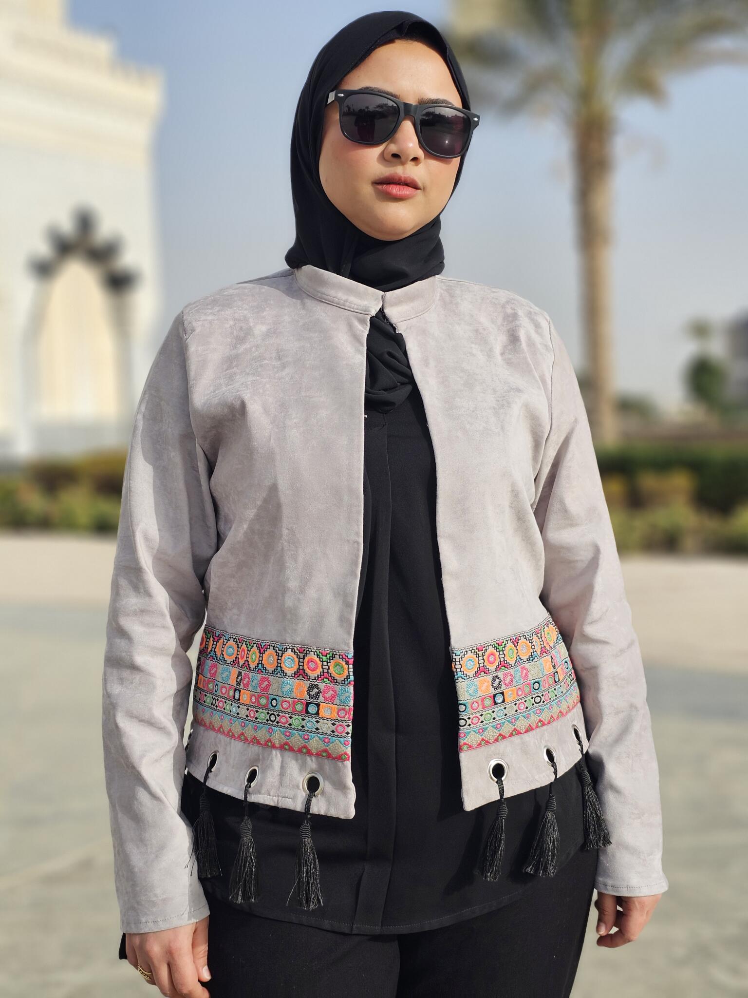 This short Ramadan jacket is crafted from luxurious black or greish suede and adorned with decorative trim inspired by oriental patterns. Finished with stylish fringe details, it adds movement and elegance to your look.