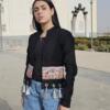 A short Ramadan jacket made from soft black or greish suede, decorated with elegant trim and finished with stylish fringes. Available with a matching clutch.