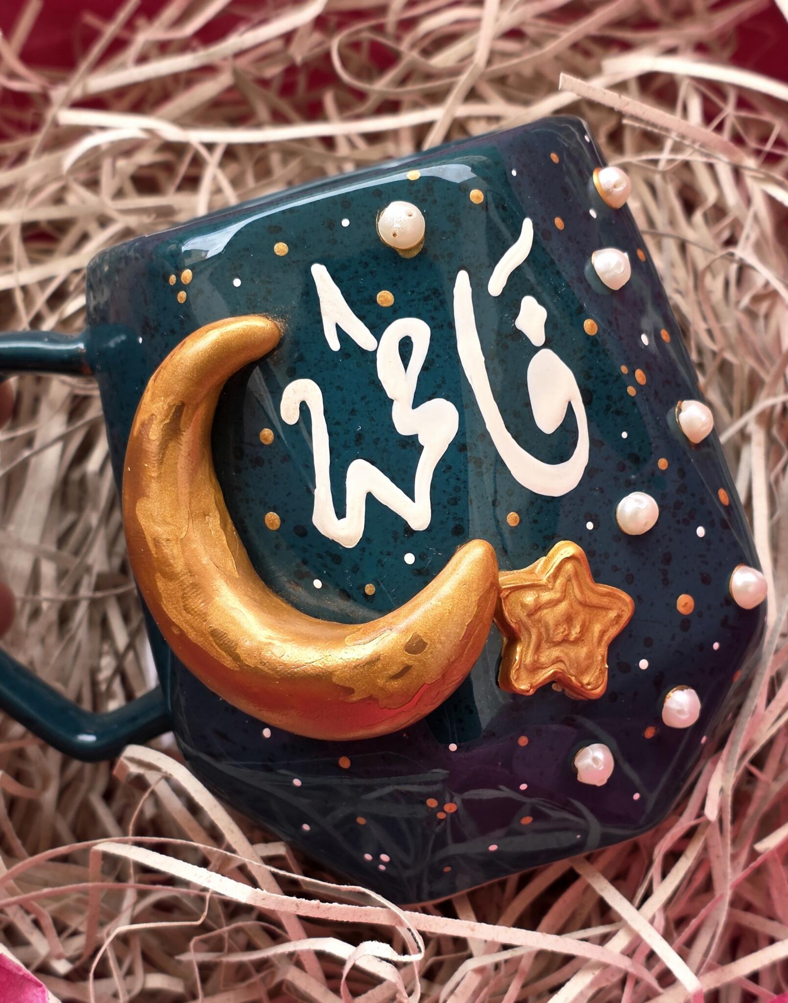 Porcelain mug with a design made of polymer clay