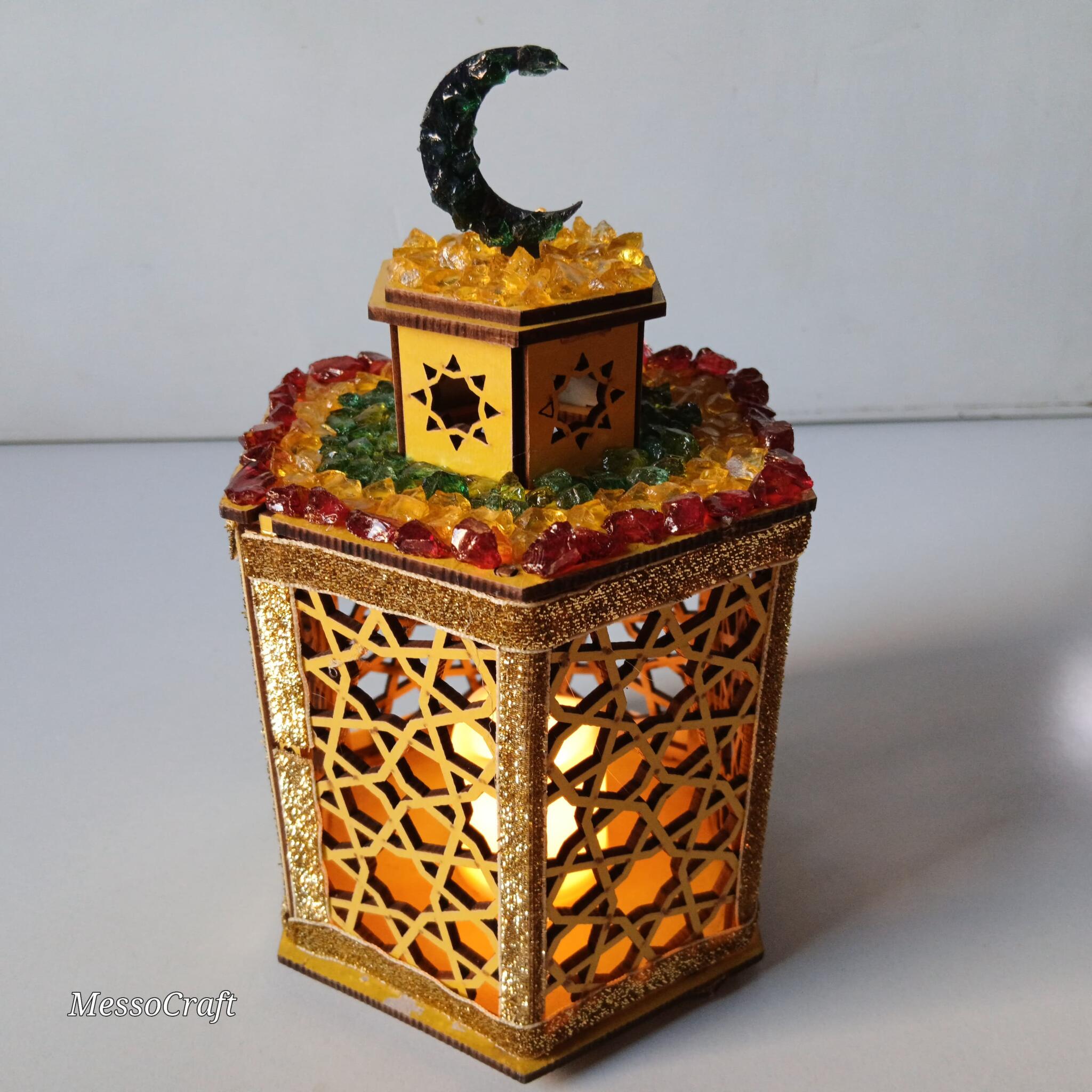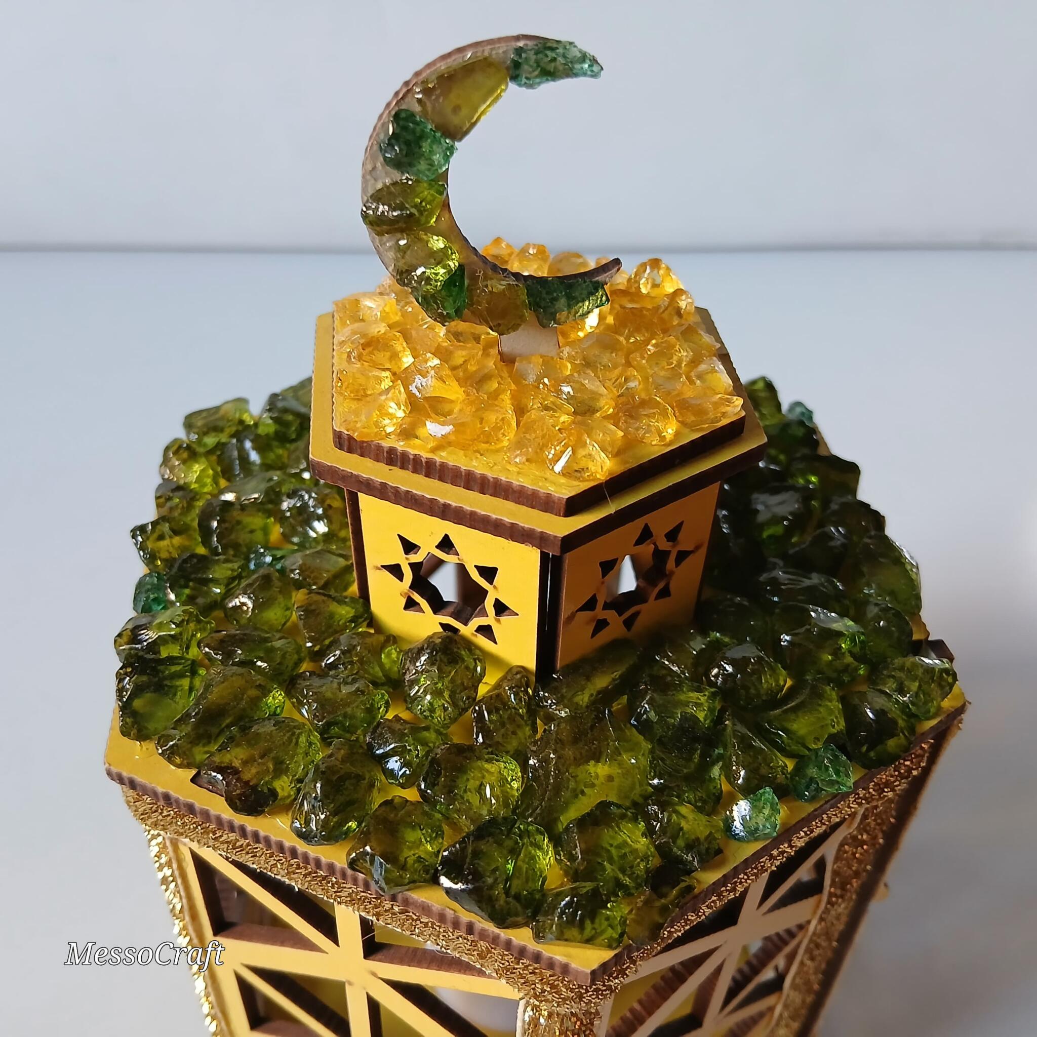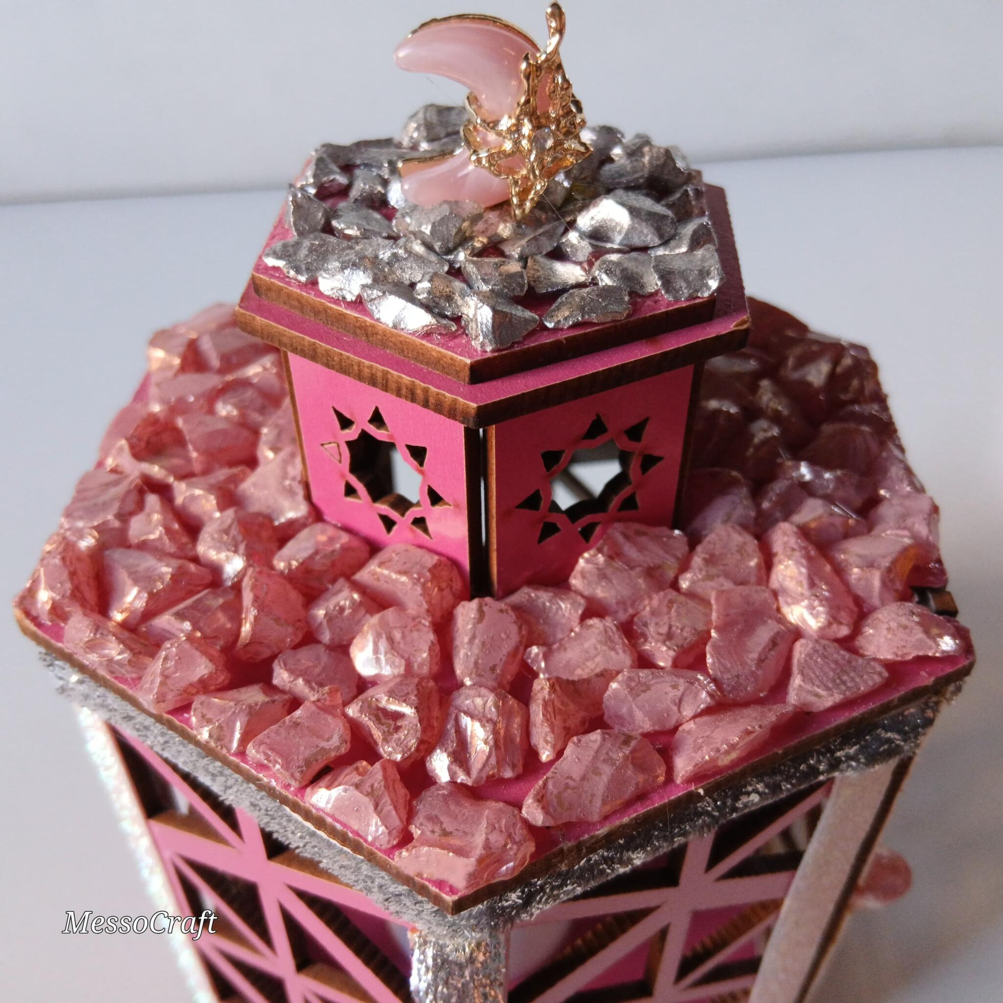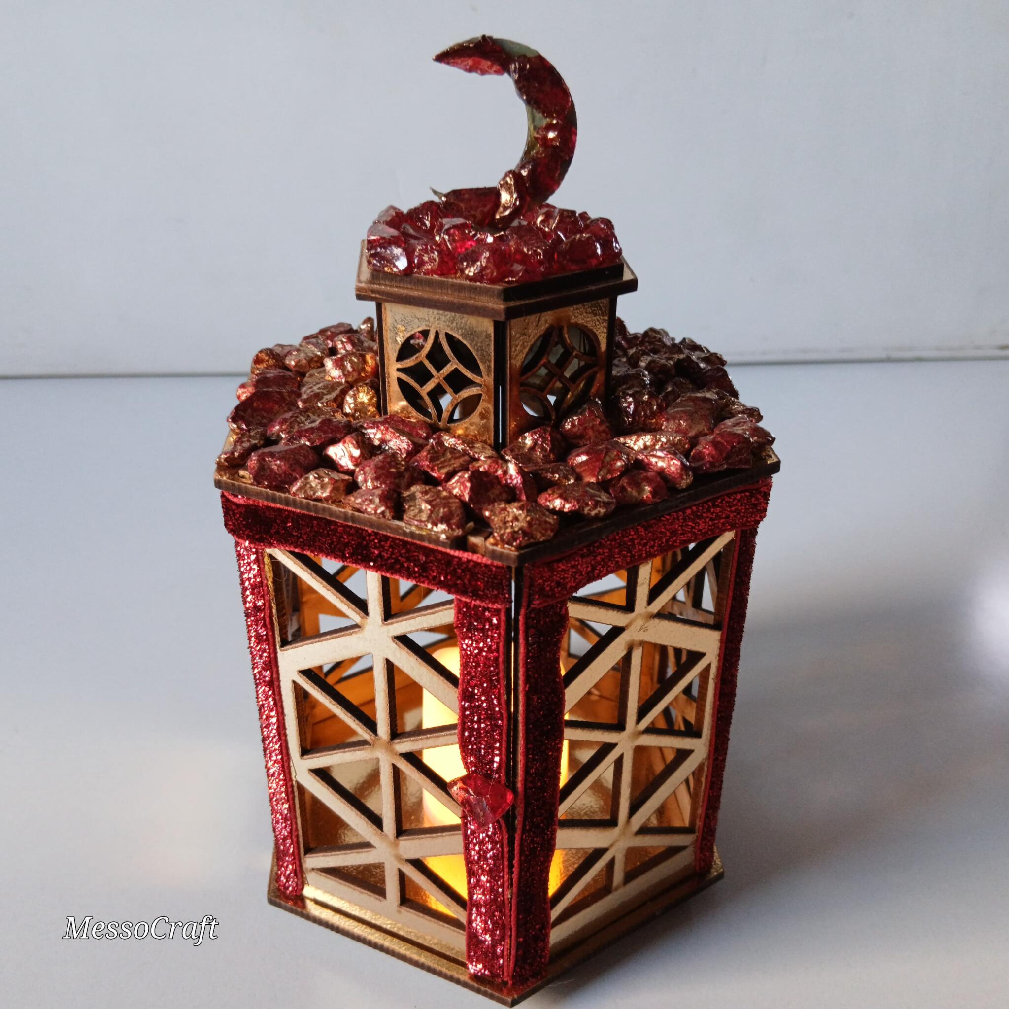 Wooden lantern (Fanous) with Islamic motifs decorated with glittery ribbons and stones.