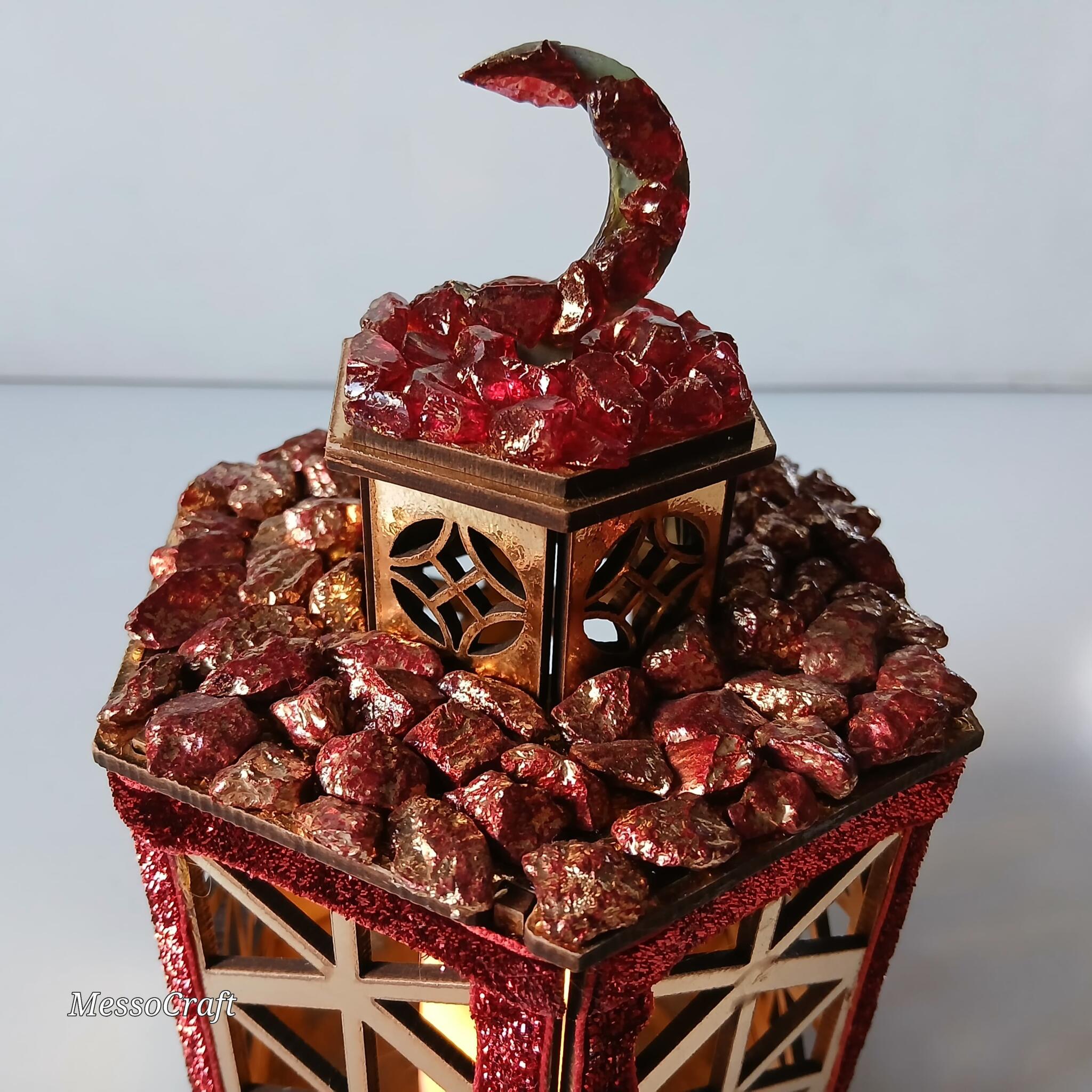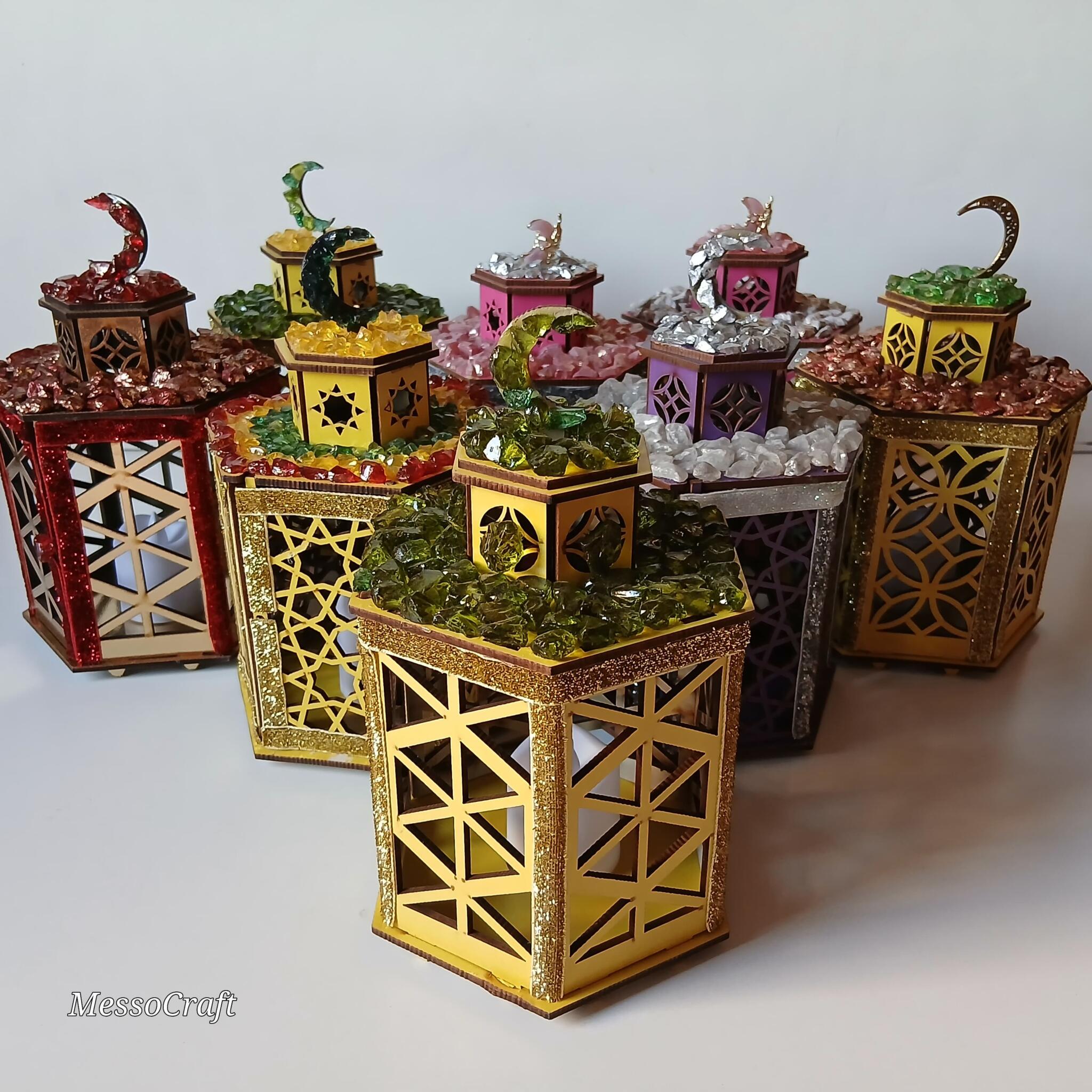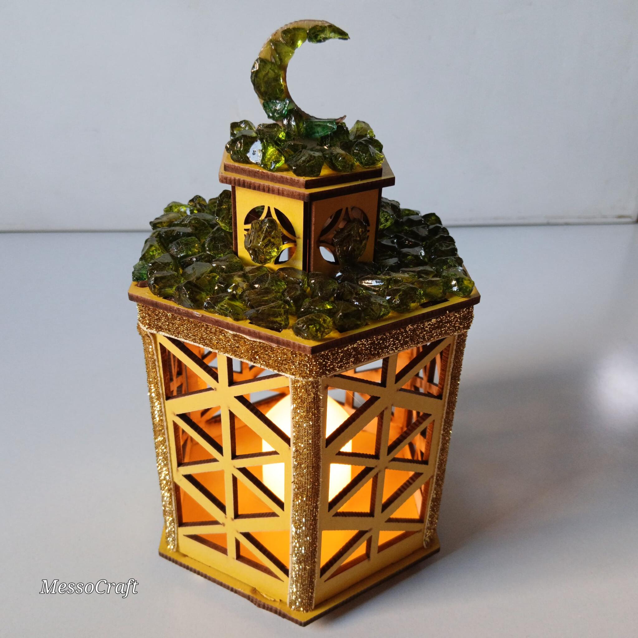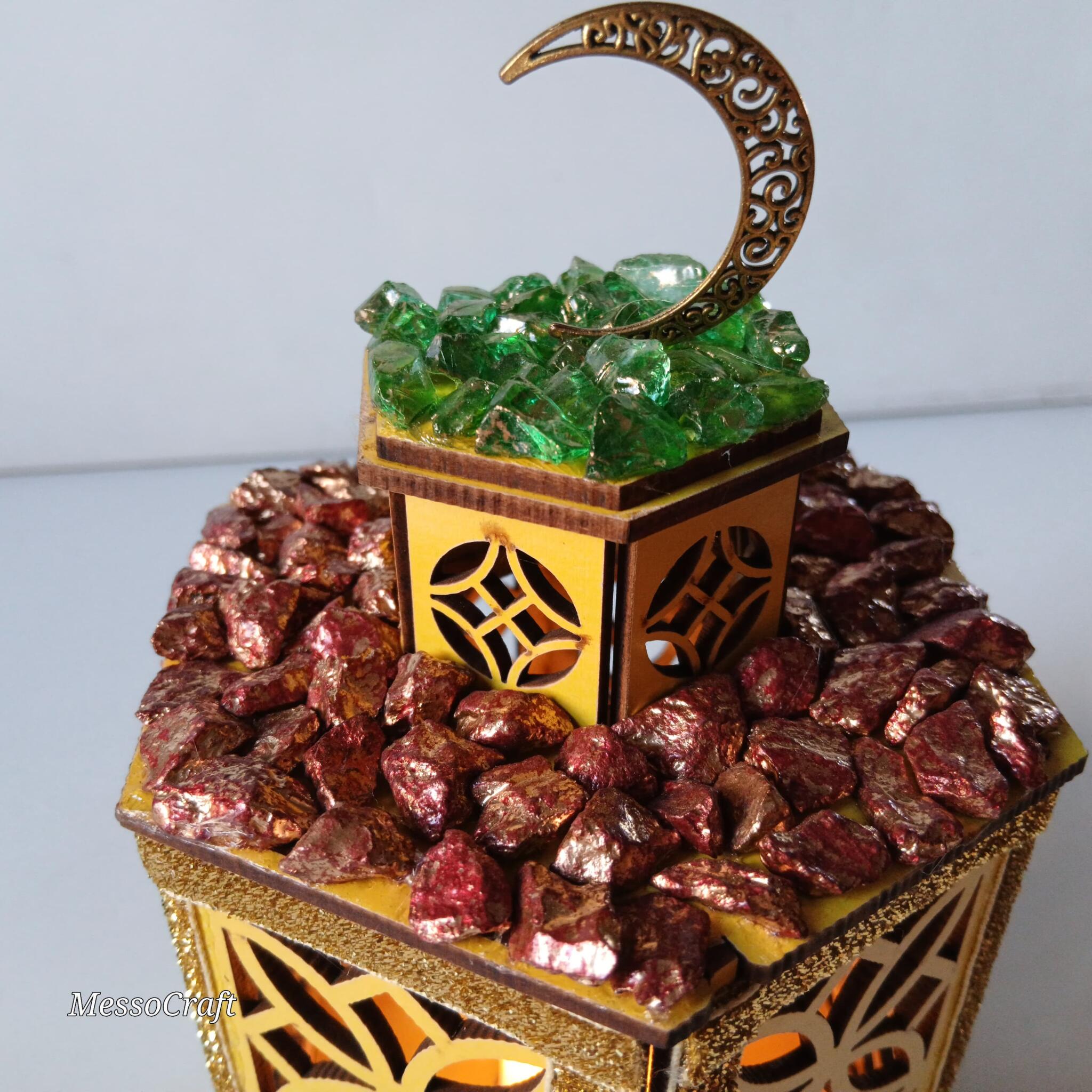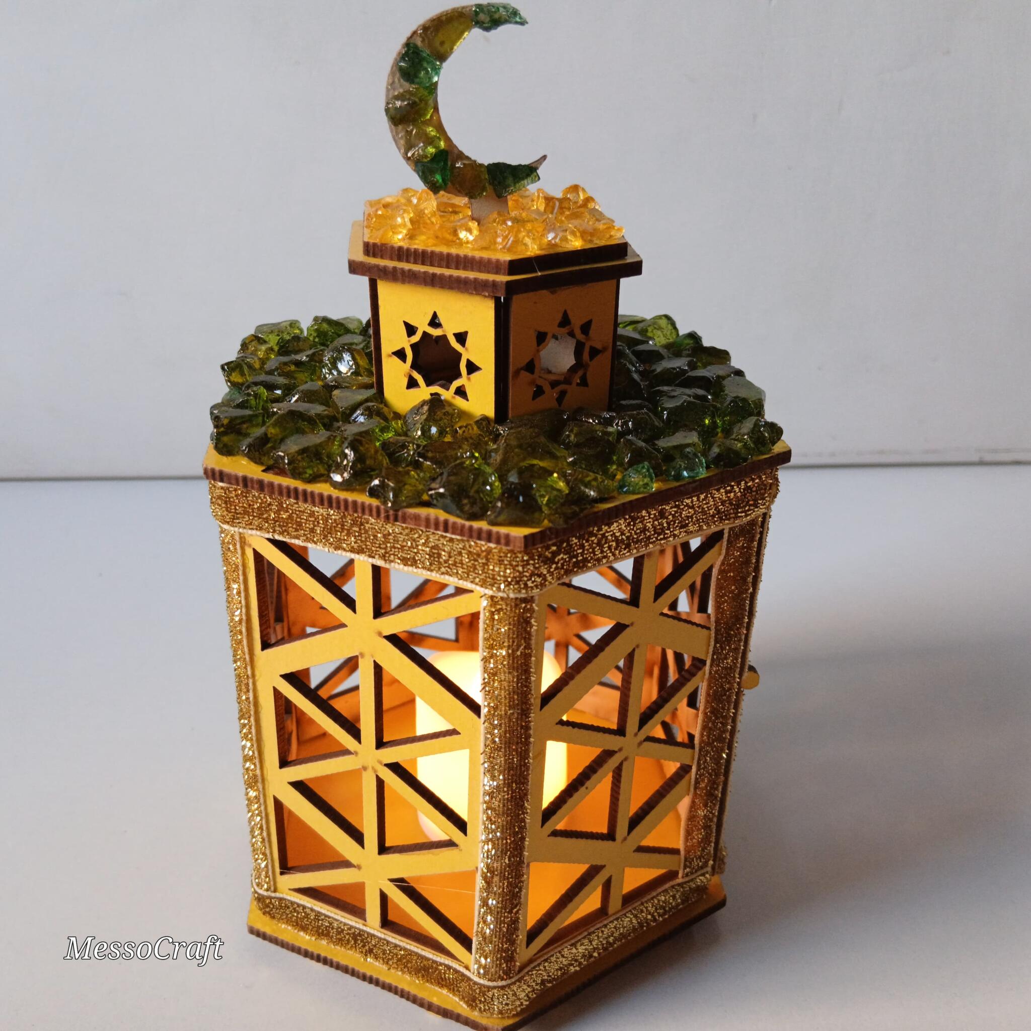 Wooden lantern (Fanous) with Islamic motifs decorated with glittery ribbons and stones.