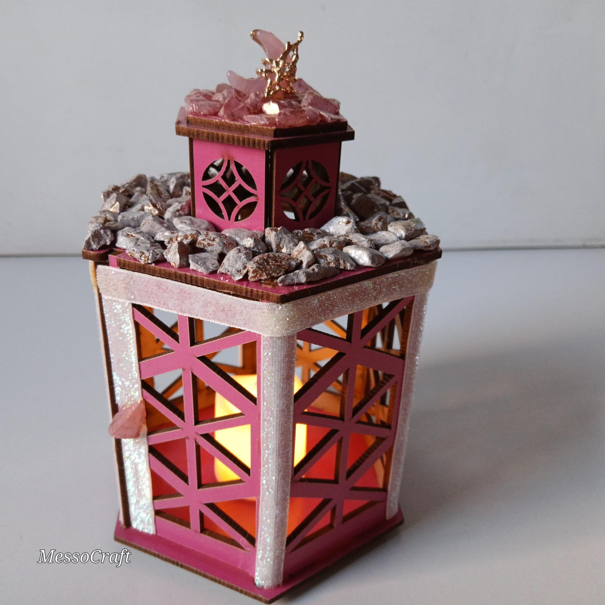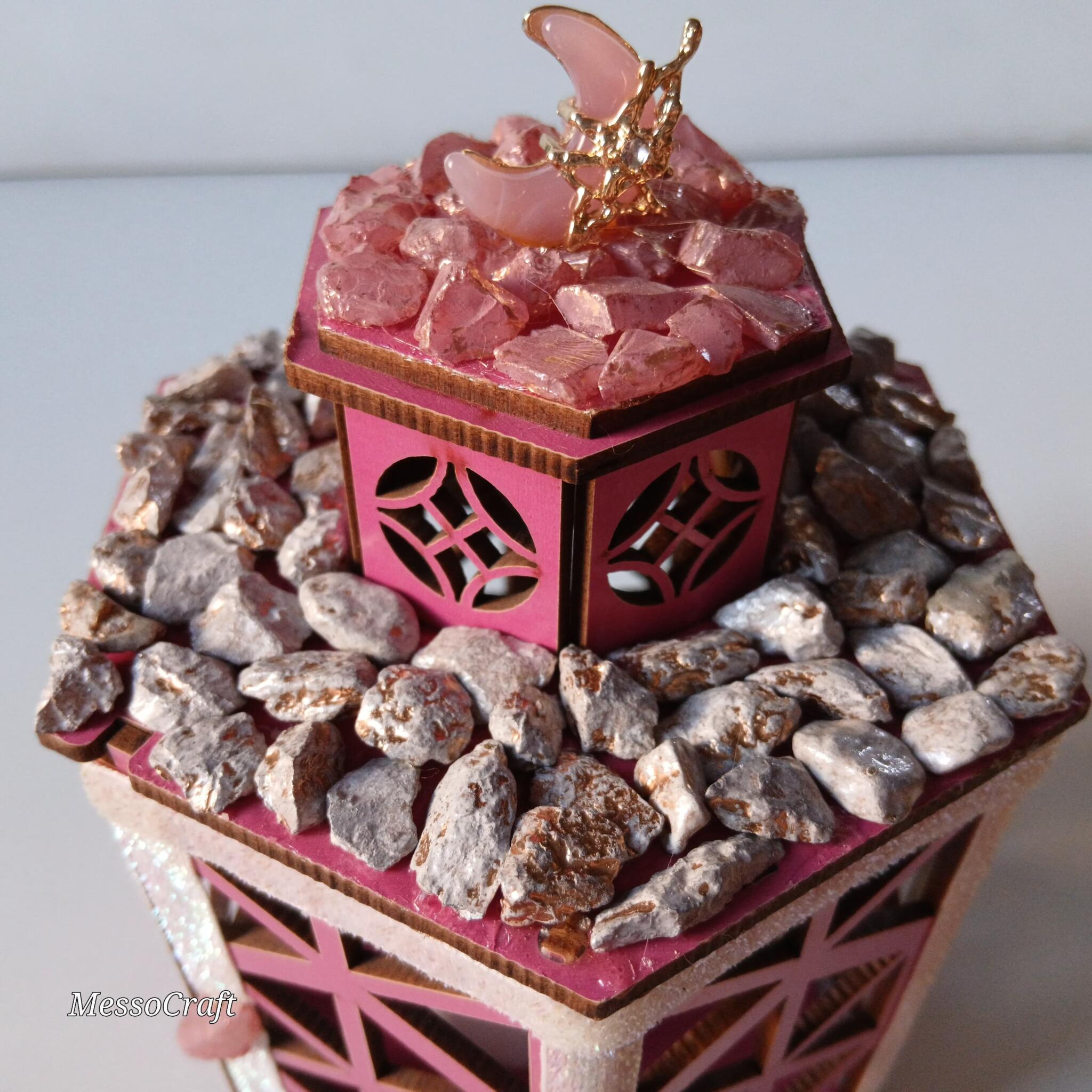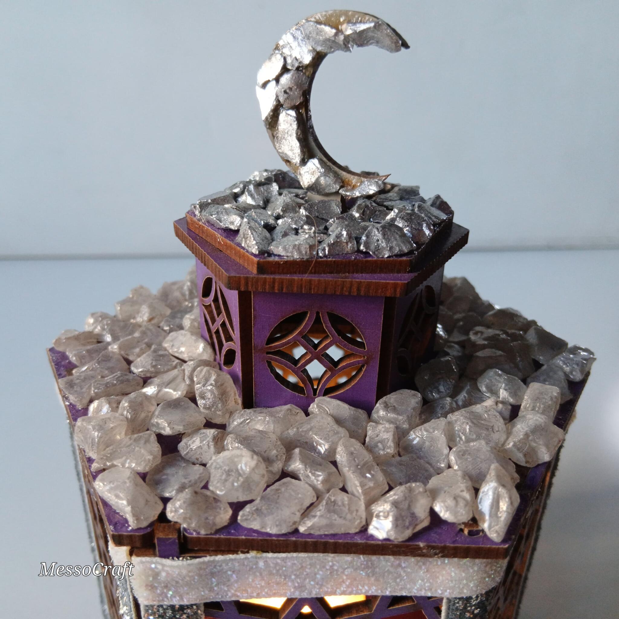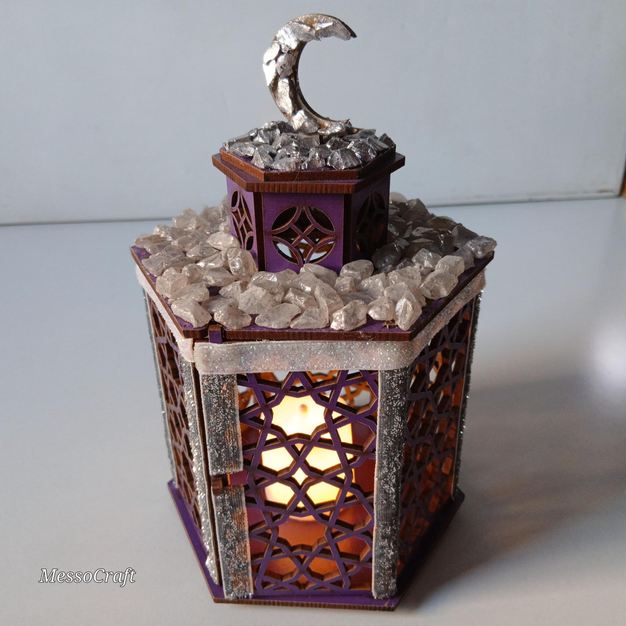 Wooden lantern (Fanous) with Islamic motifs decorated with glittery ribbons and stones.
