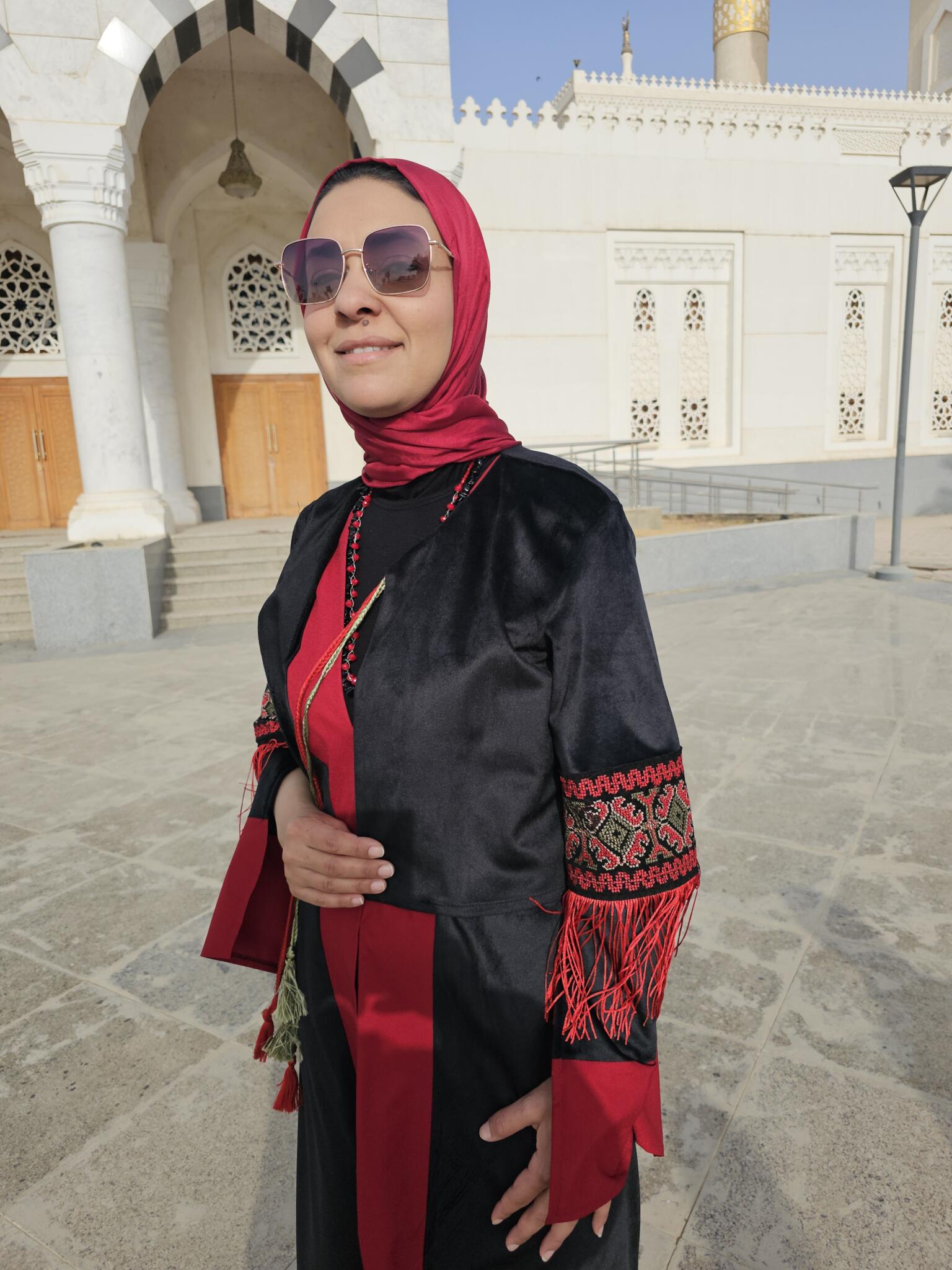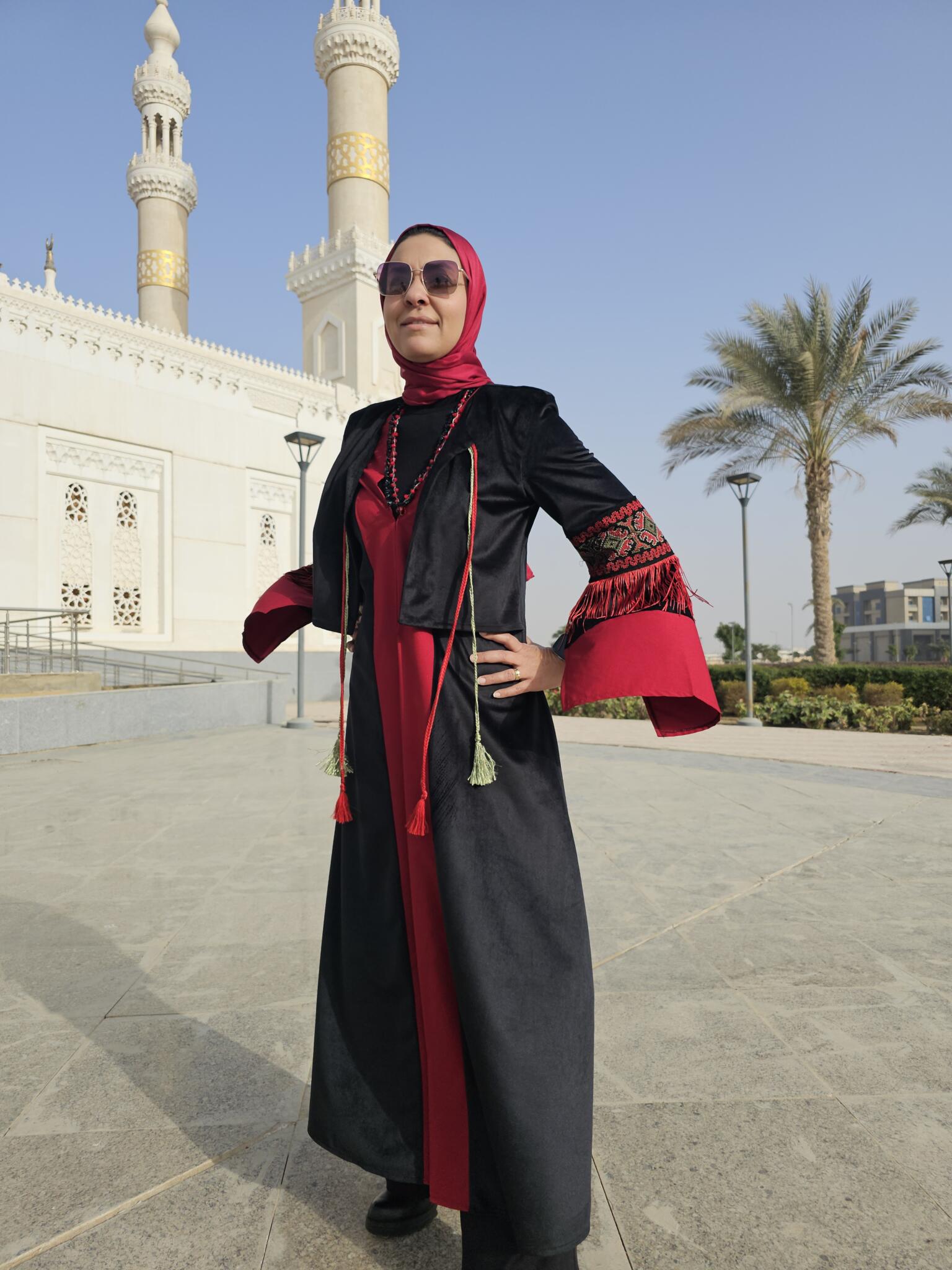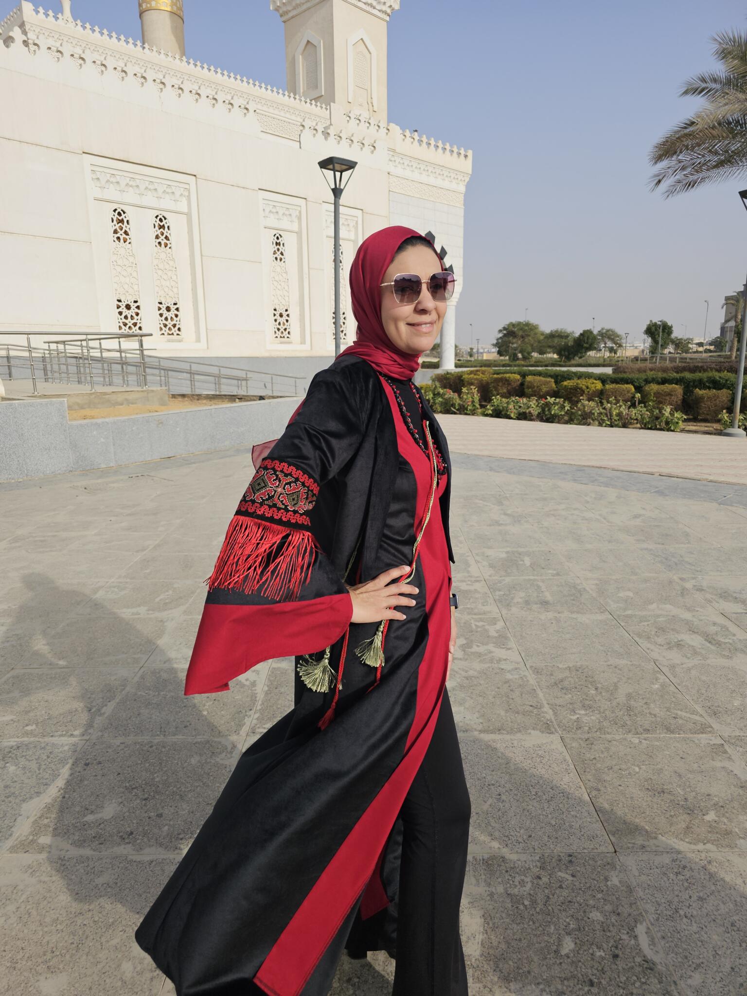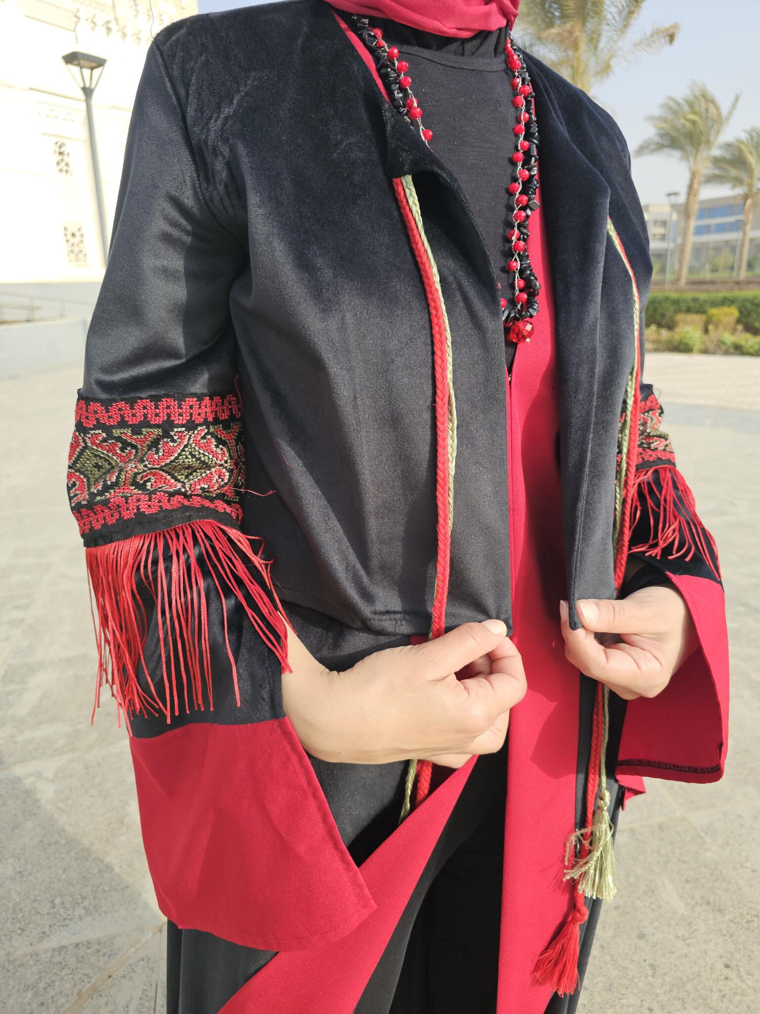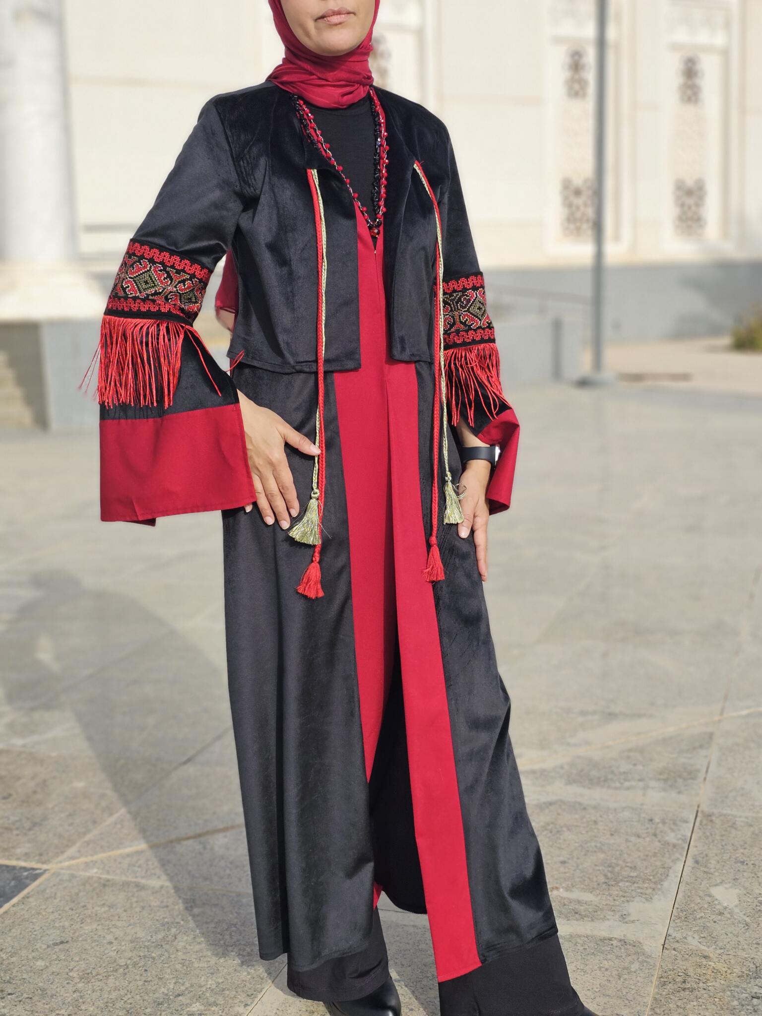 This Ramadan kaftan is crafted from luxurious black velvet and enriched with decorative trim inspired by oriental patterns. Finished with elegant fringe details, it creates graceful movement and a striking silhouette.