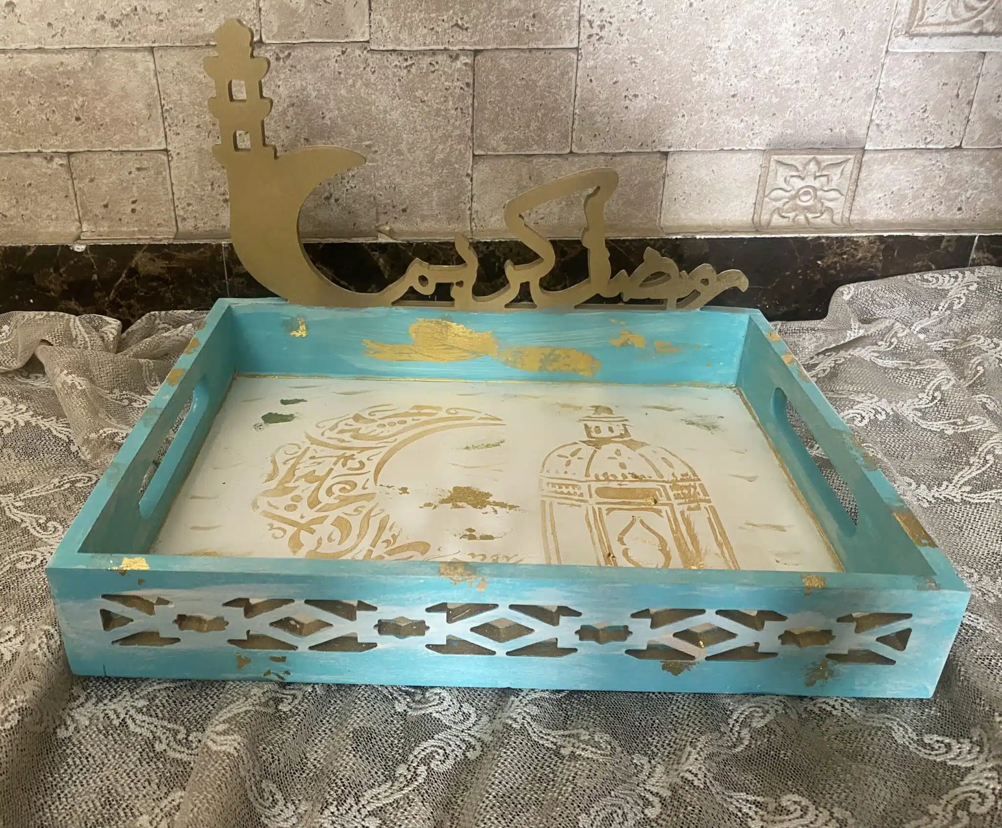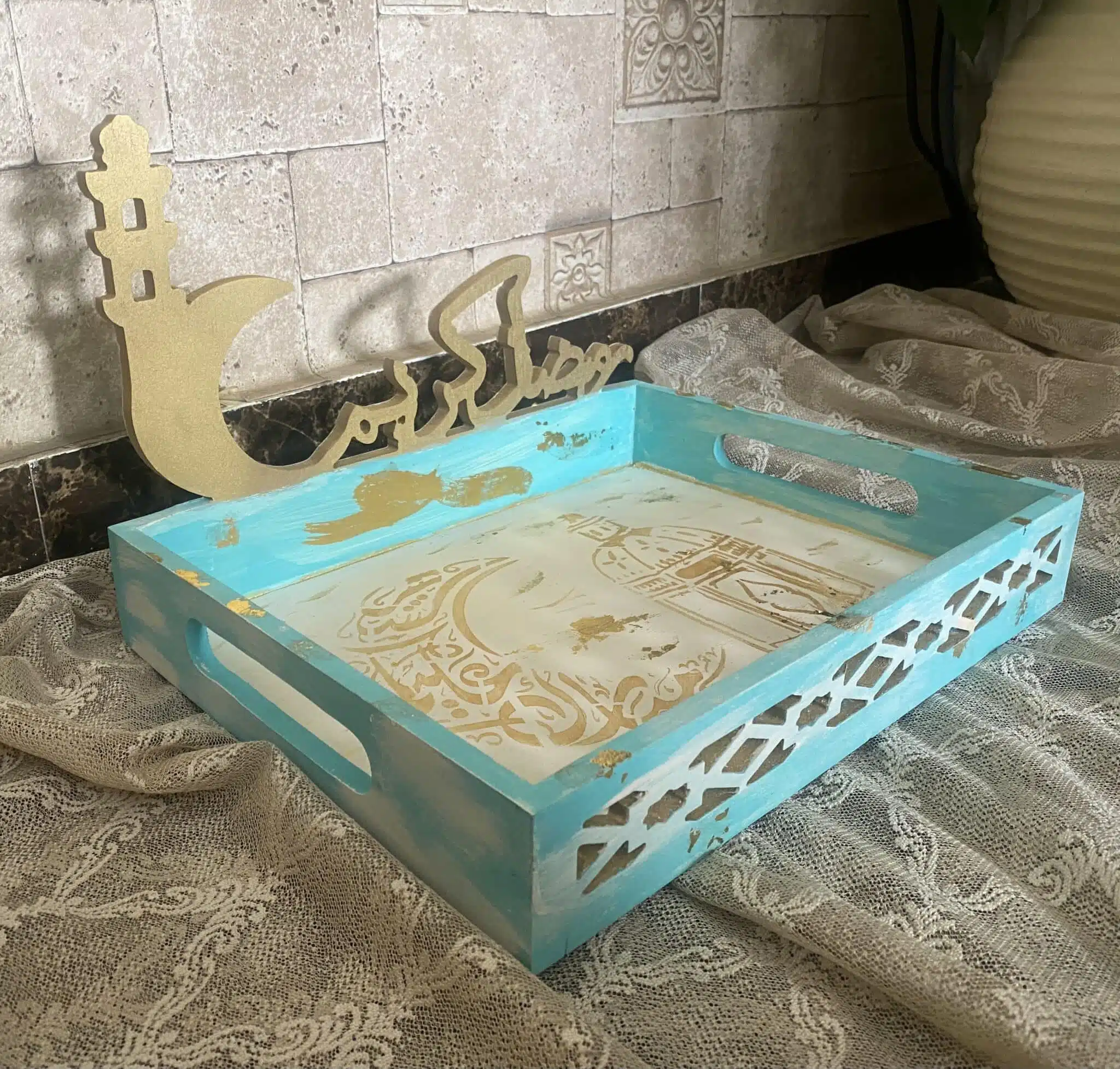 Wooden Ramadan Tray mint Color x gold leaf
