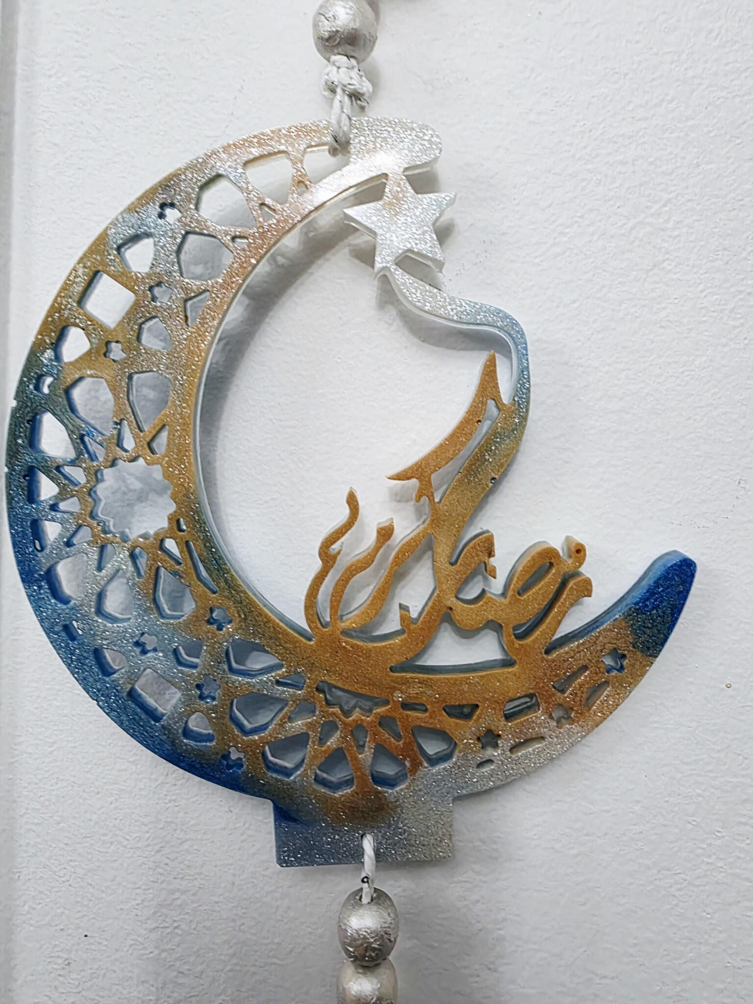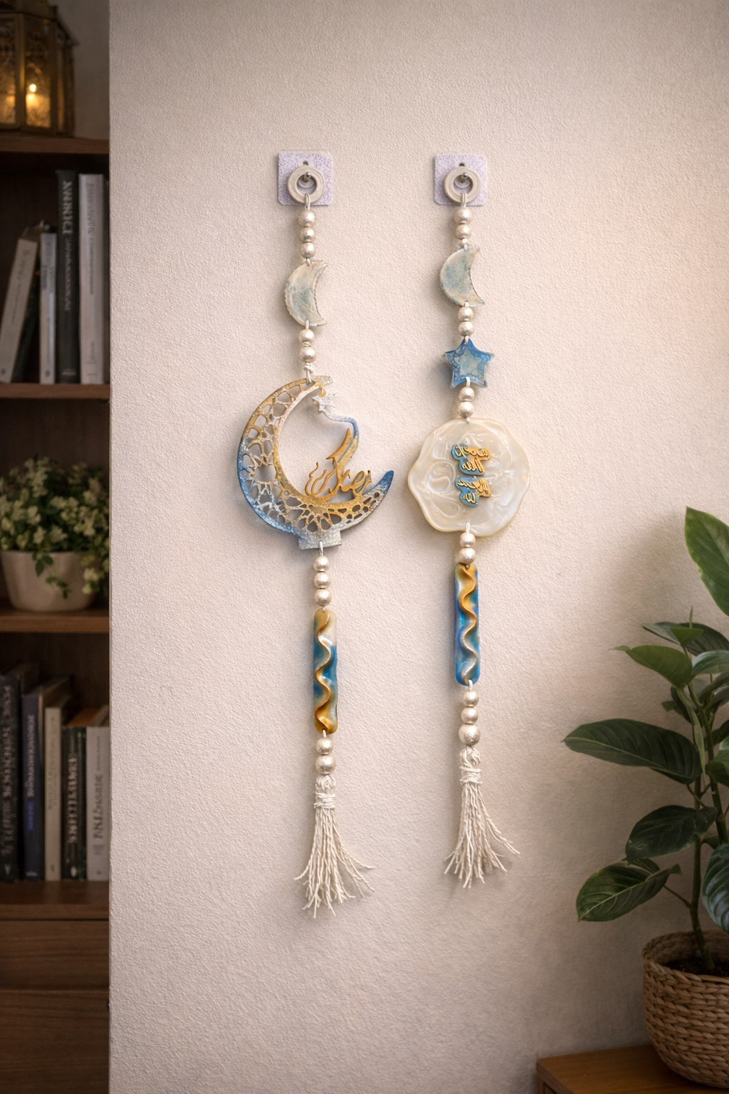 A one-of-a-kind Ramadan wall art set of 2 wall hangers, blending handcrafted resin elements with 100% cotton macramé. This piece brings warmth, texture, and a unique artistic touch to any space.