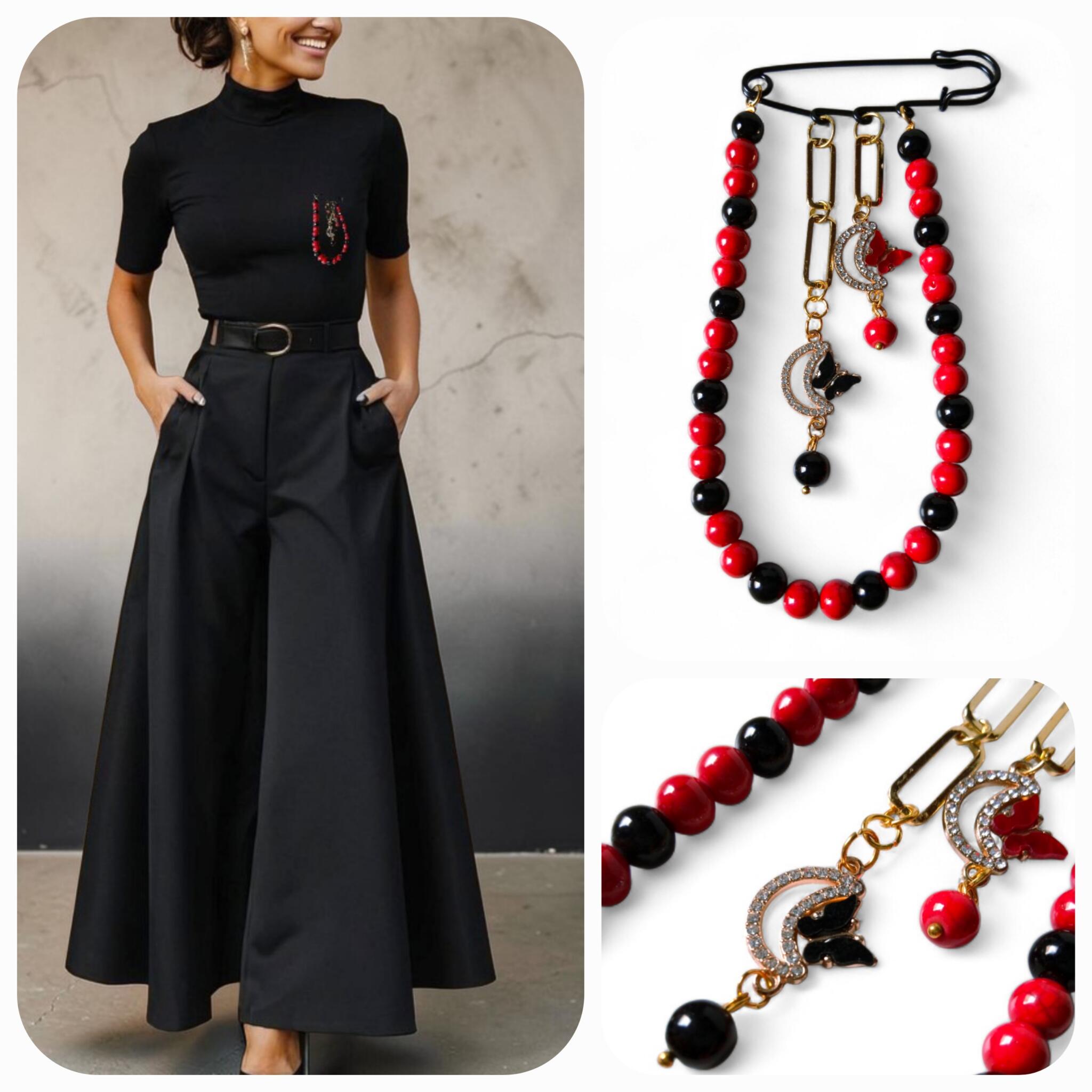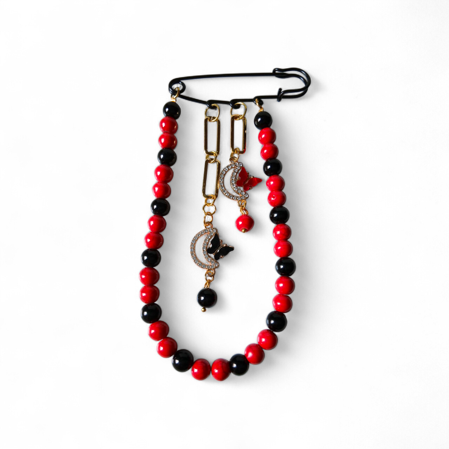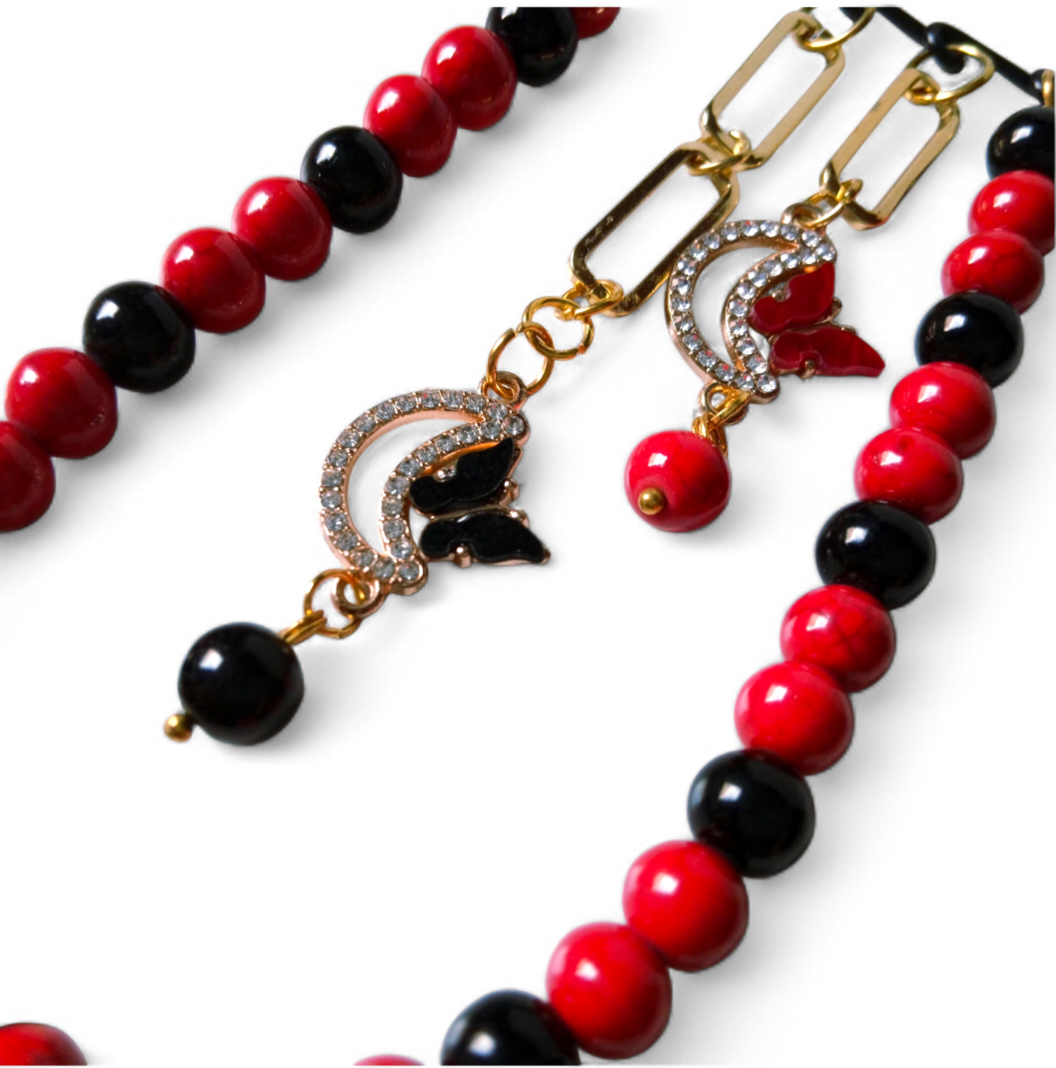 A pin made of black and red majorica pearl stone beads with 2 pendants in the shape of butterfly, 1 black and 1 red with gold platted chains