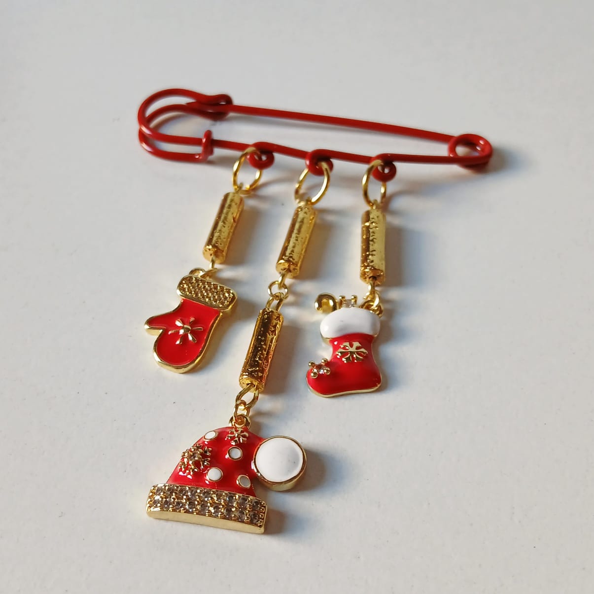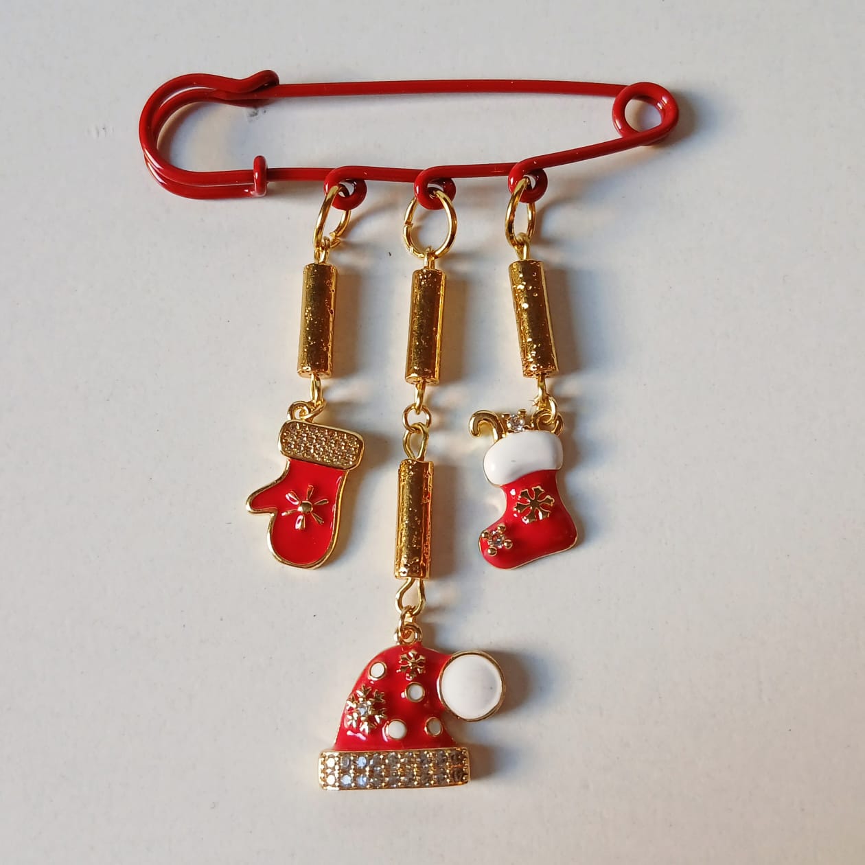 Pin made of golden lava beads and hanged on it 3pendants of Xmas hat, glove and boot