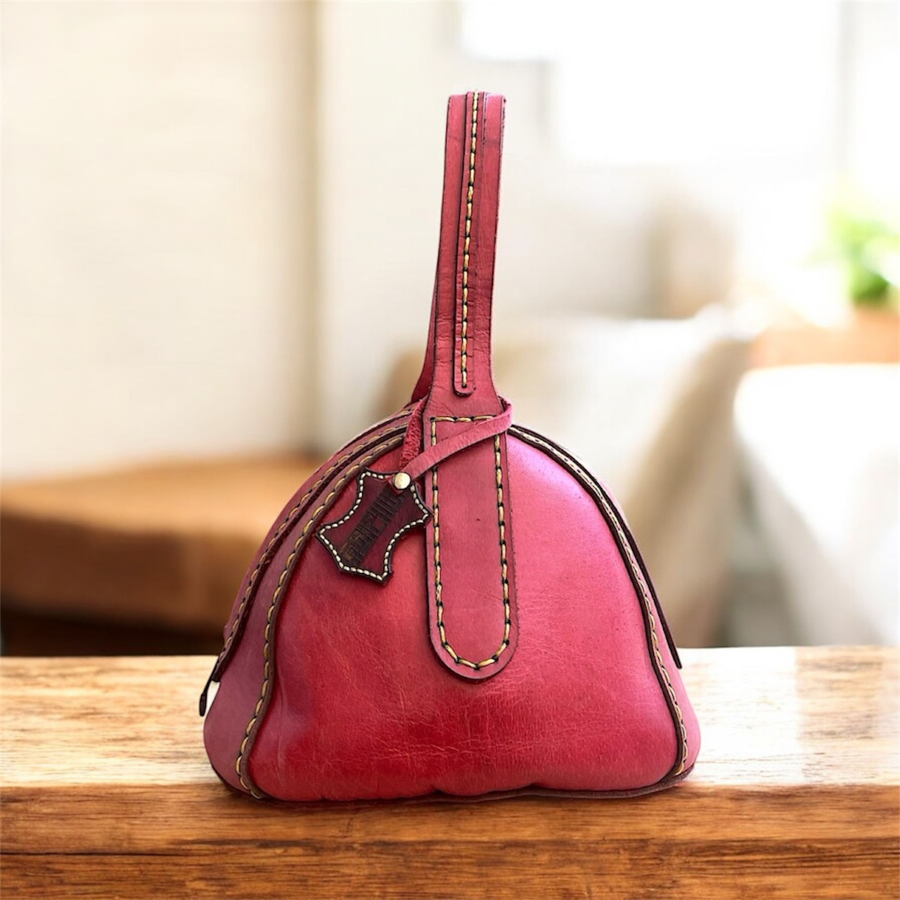 ed leather teardrop-shaped handbag, featuring bold yellow stitching, a vertical decorative strap, and a smooth, vintage-inspired design with a sturdy matching handle.