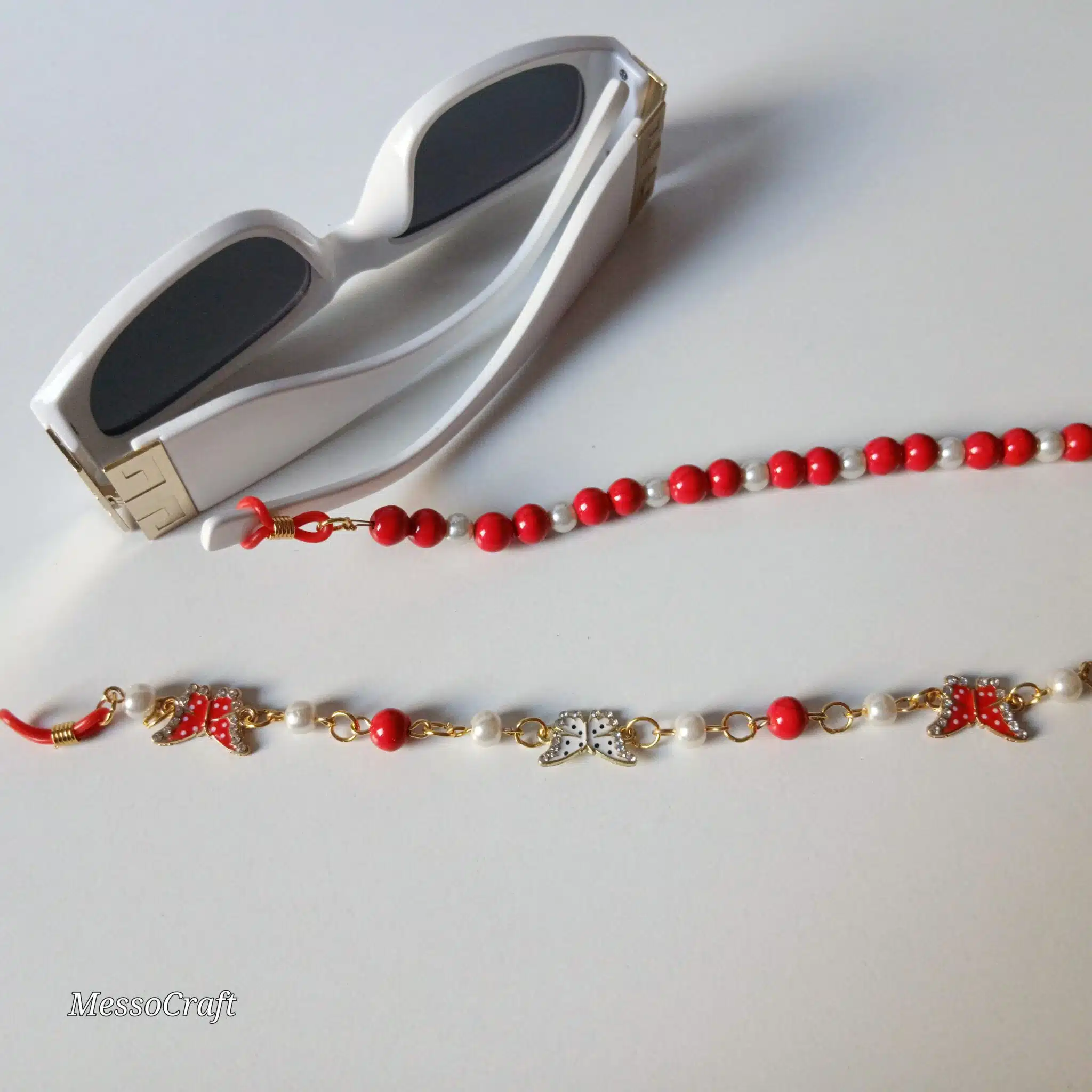 Glasses chain made of Red / white pearl stones with nice elegant 3 dotted butterflies pendants and chain Chinese gold