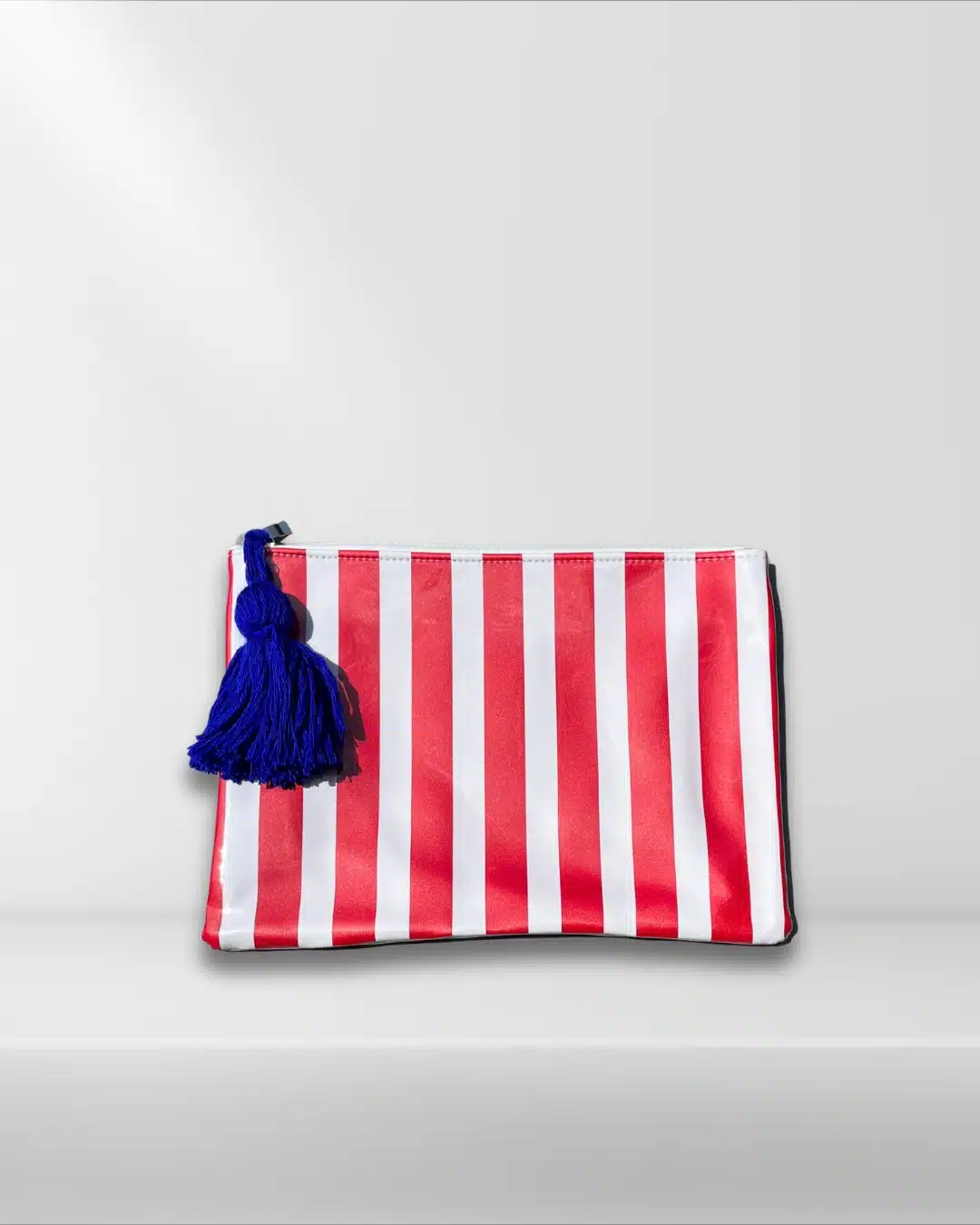 Plastic Wrapped Pouch size 25x35cm , in red & white striped pattern with navy blue tassel,