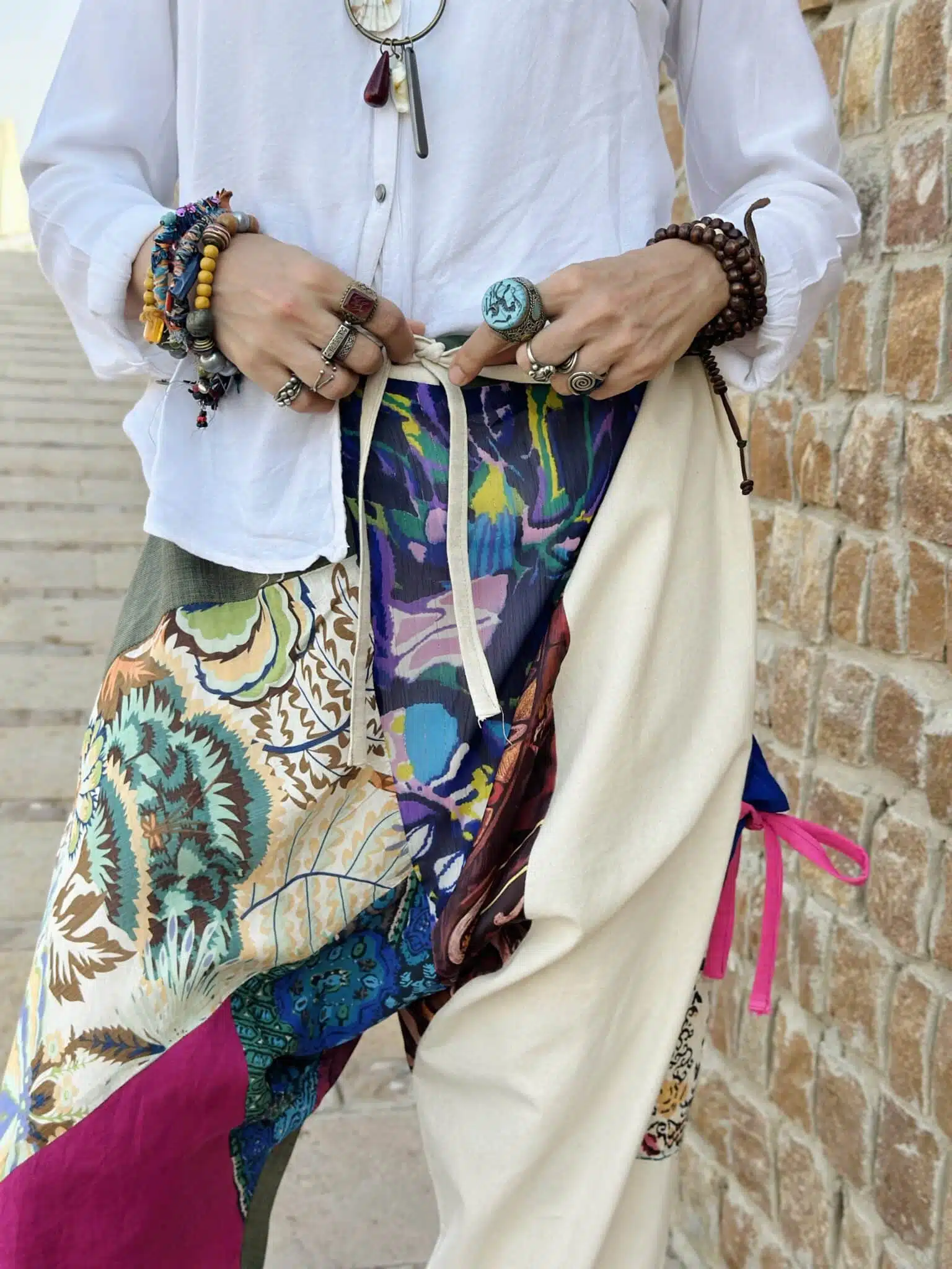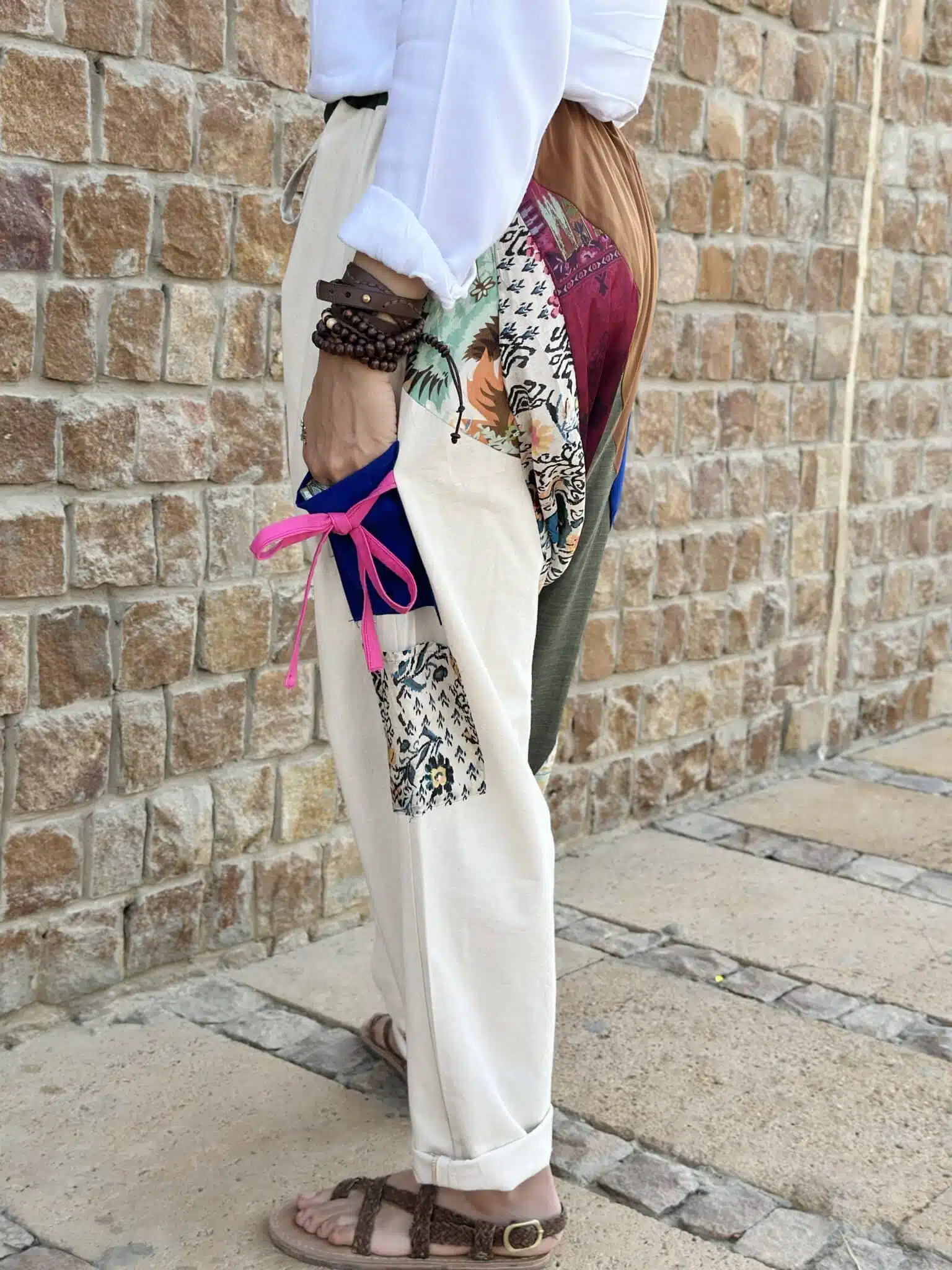 Patchwork handmade pants, created from different fabrics, Pure linen – voile – indian chiffon – crepe