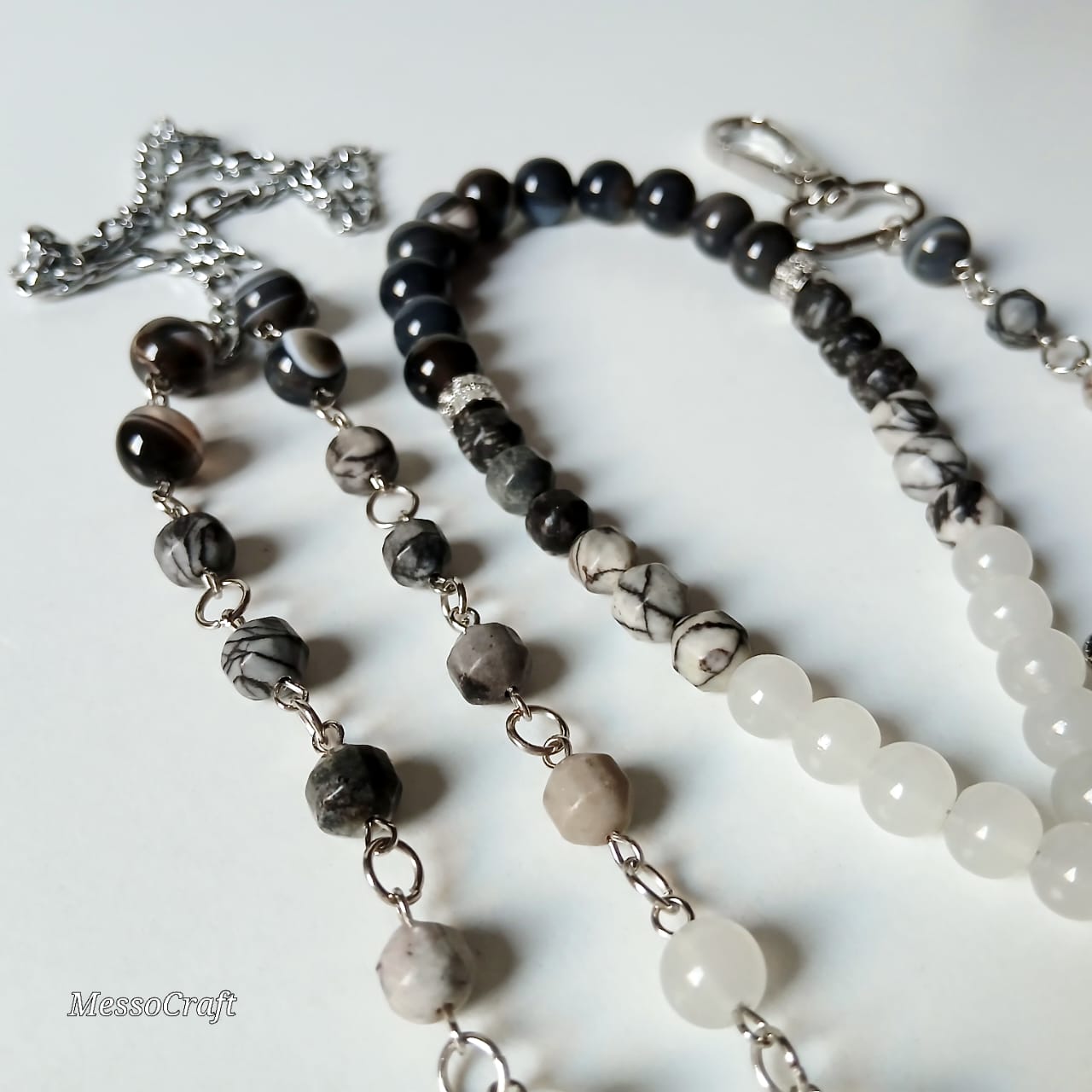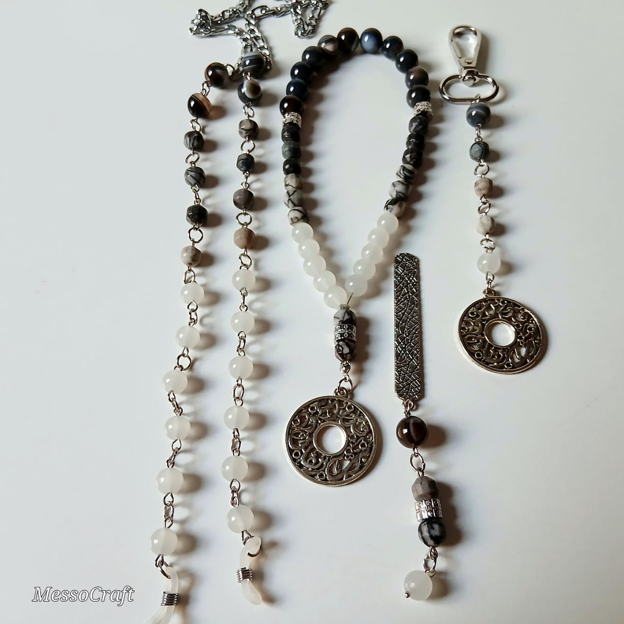White alabaster, grayish agate and black solmania stones and silver separators, 2 big silver round pendants قل أعوذ برب الفلق