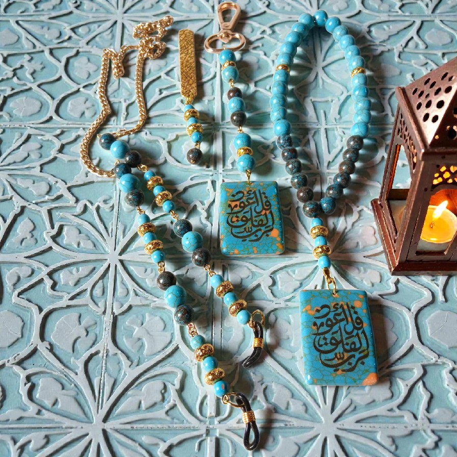 Blue Fayrouz stones, grayish African fayrouz, lava golden beads, fayrouz acrylic squard pendants with قل أعوذ برب الفلق in golden platted