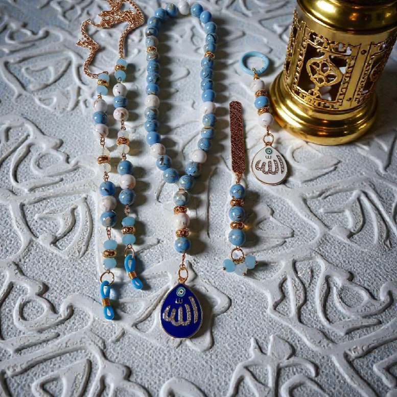 Blue Fayrouz seashell stones, blue matt crystal, lava golden beads, platted pendants with Allah name in diamonds.