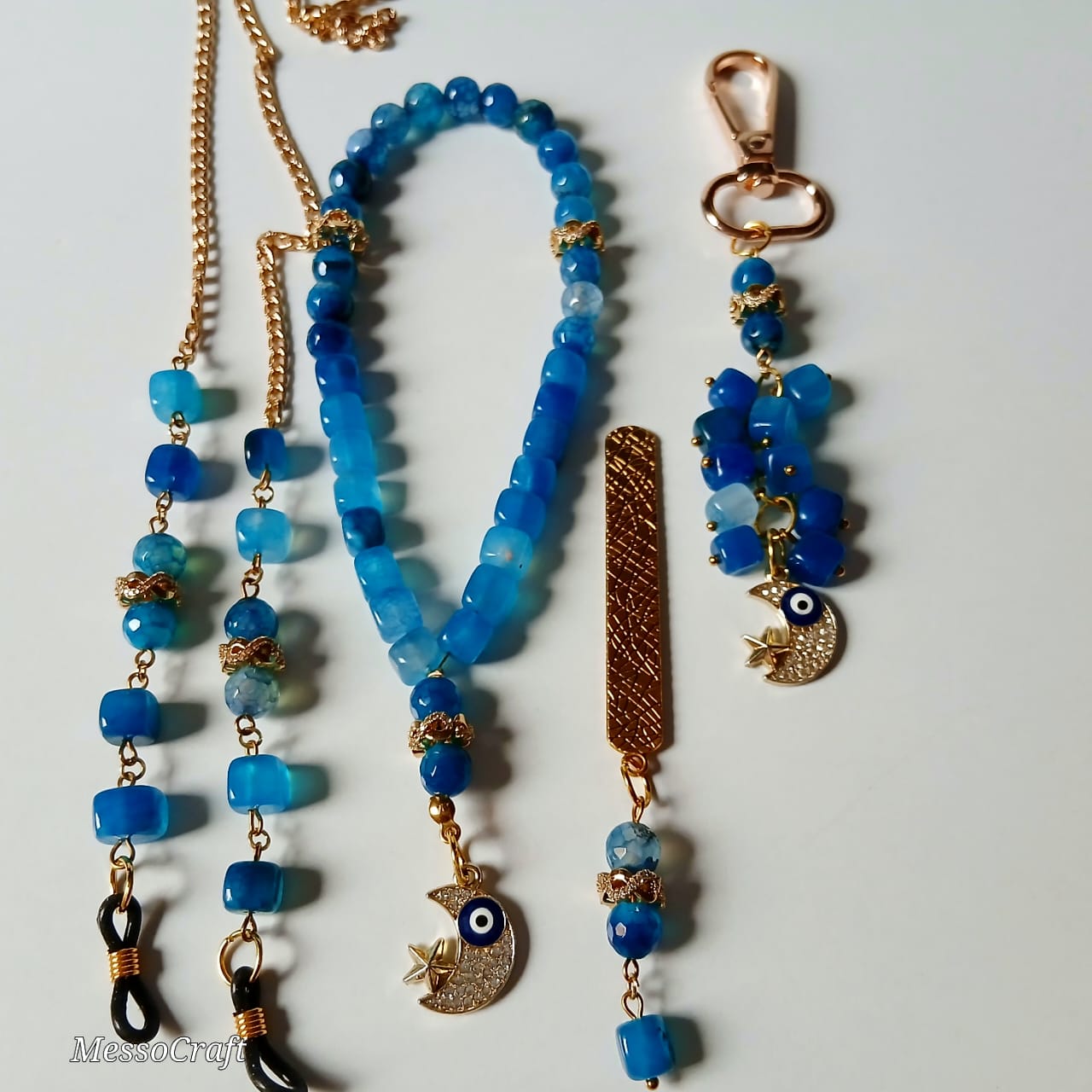Blue shades agate round and square stones and golden platted separators, 2 platted pendants in the shape of a diamond crescent, star and evil-eye.