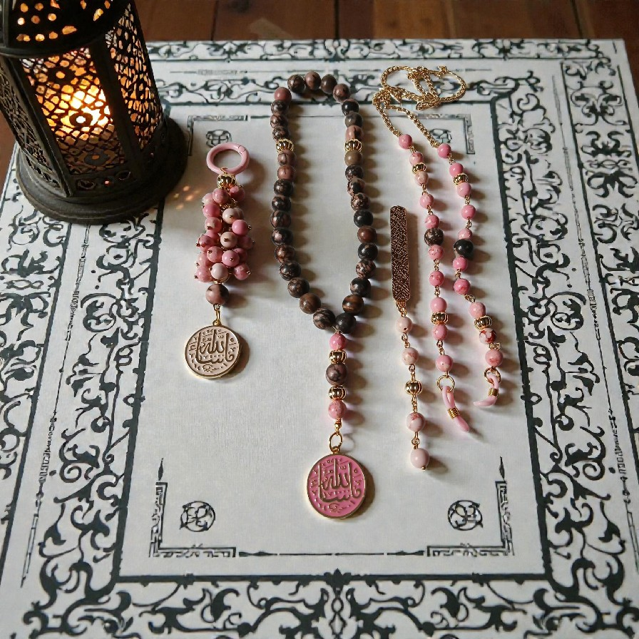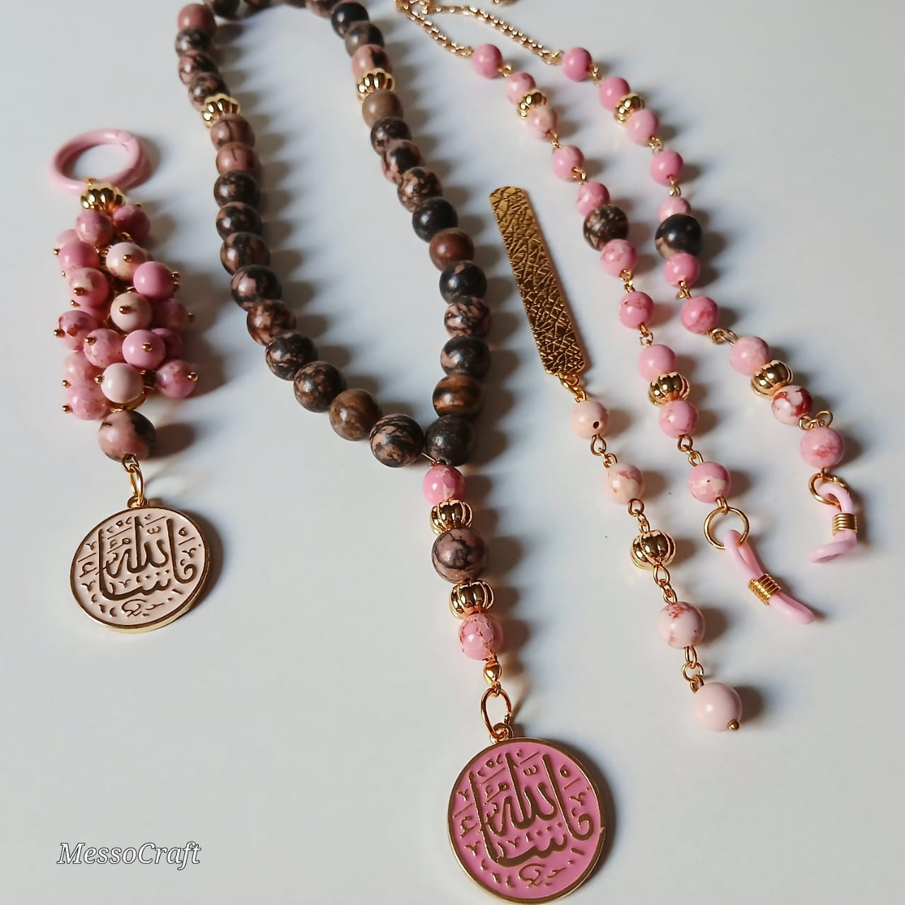 Brown and rose jasper stones, golden separators, 2 platted round pendants rose and beige with ما شاء الله