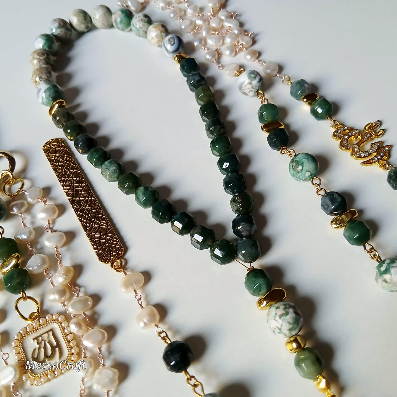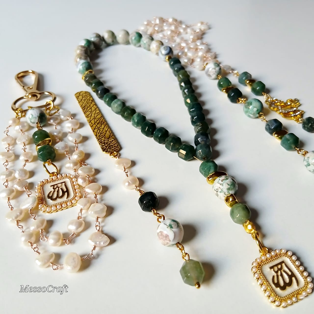 Olive agate and green jasper stones, hematite golden beads, 2 platted off-white pearl square pendants with Allah name and a golden platted Allah pendant with diamonds. Off-white pearl chains.